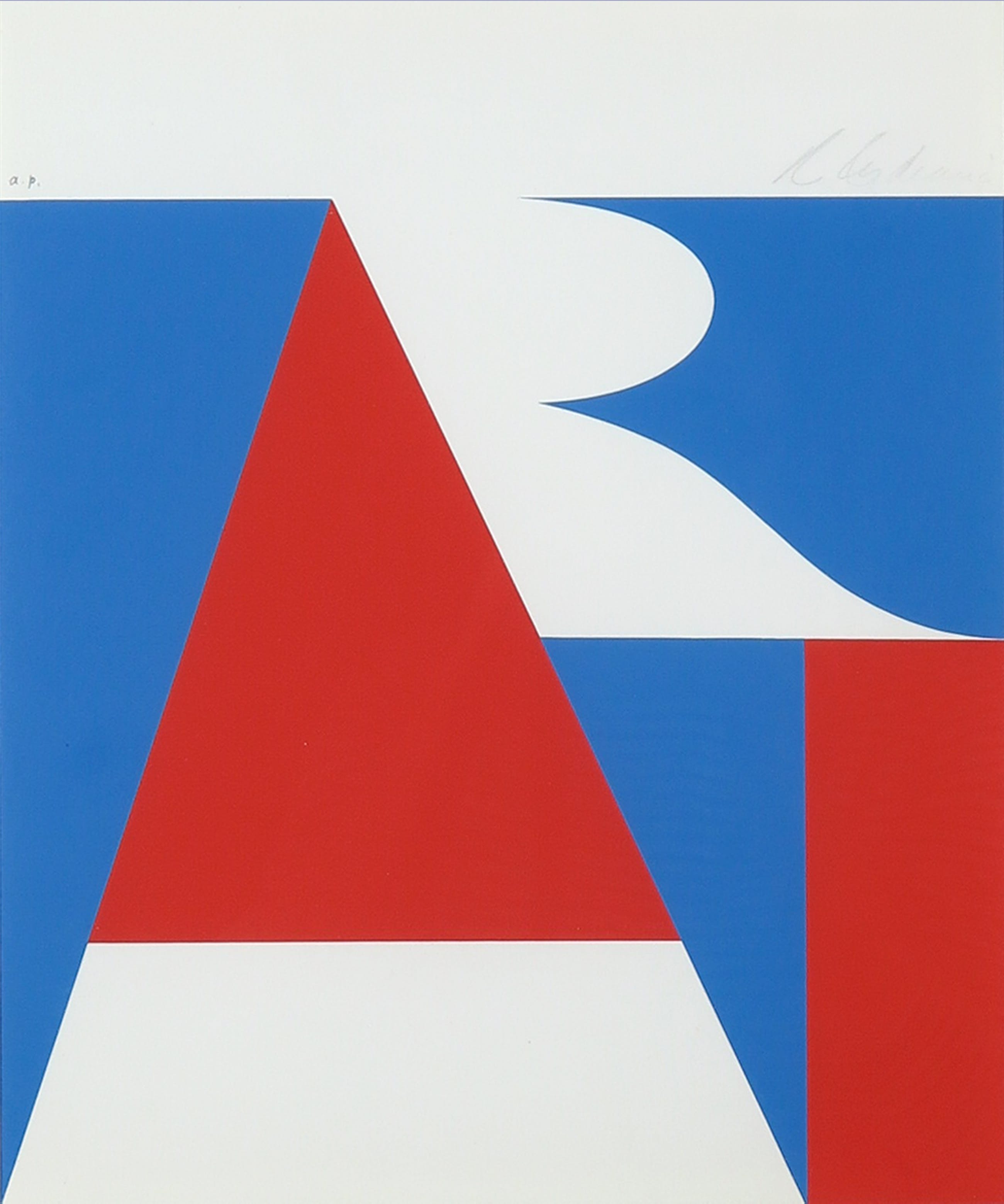 Handgesigneerde en genummerde zeefdruk, getiteld ART, van Robert Indiana. Dit betreft een Artist's Proof, naast de officiële oplage van 125 exemplaren, uitgegeven door Edition Domberger.