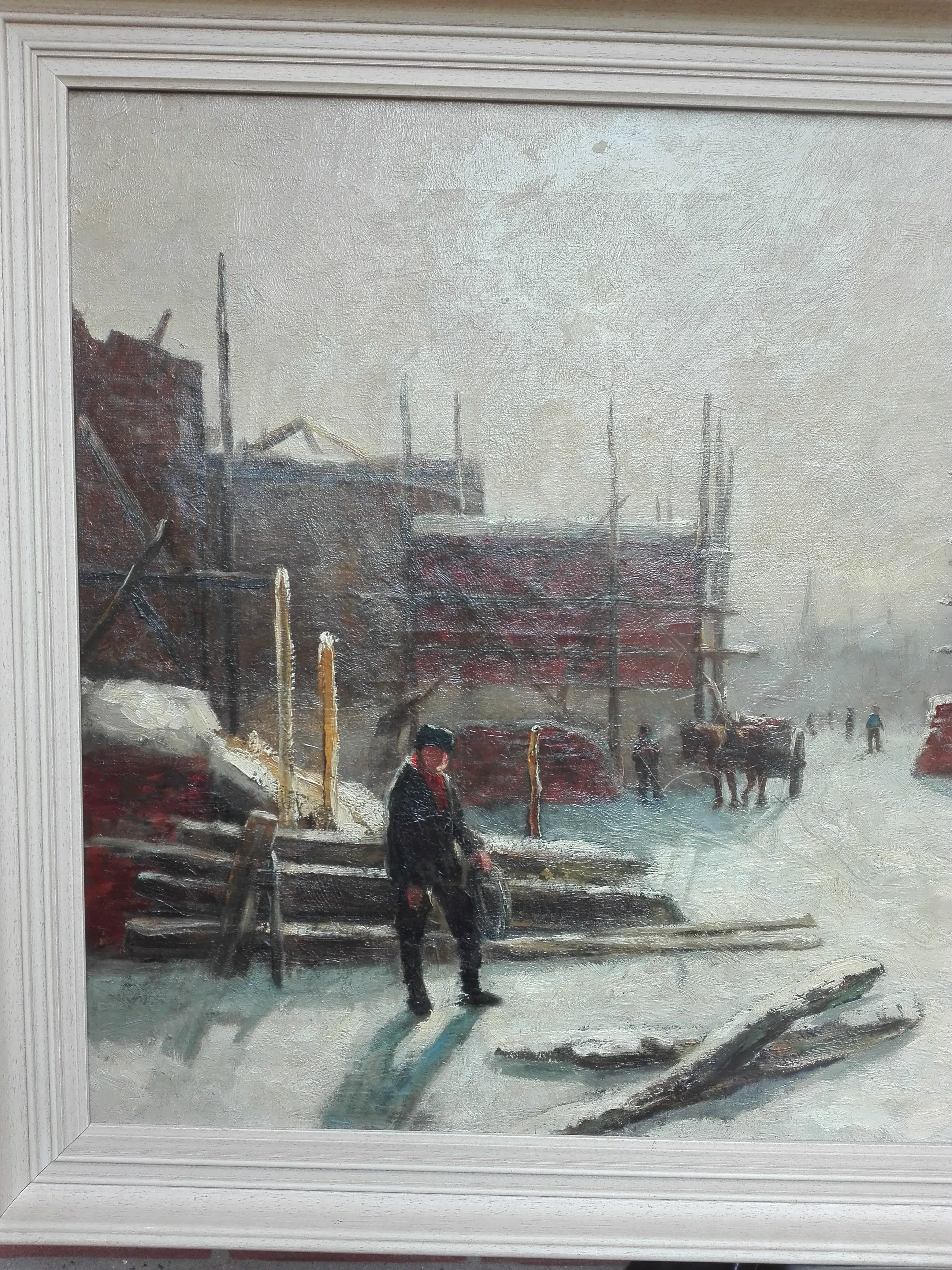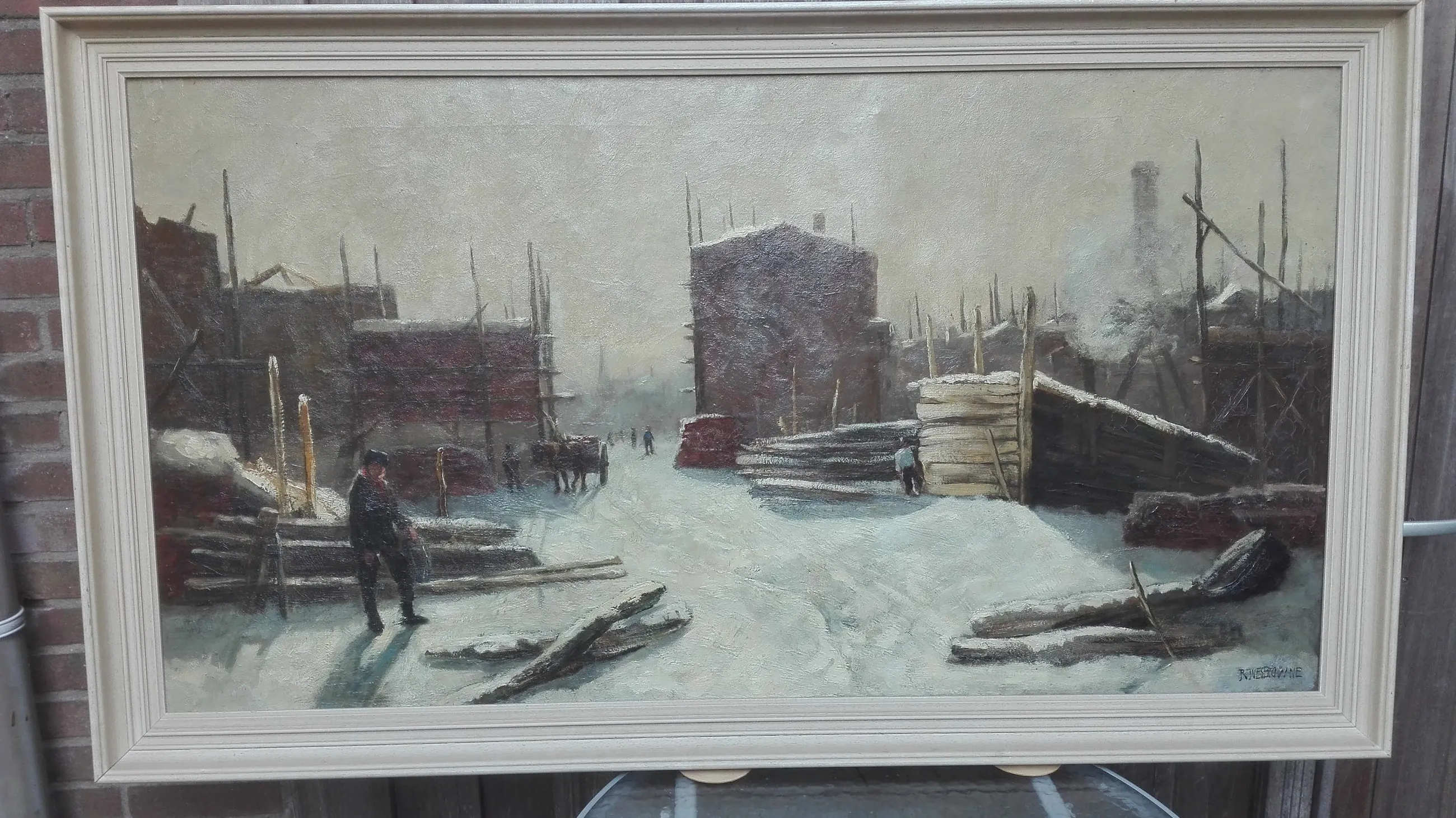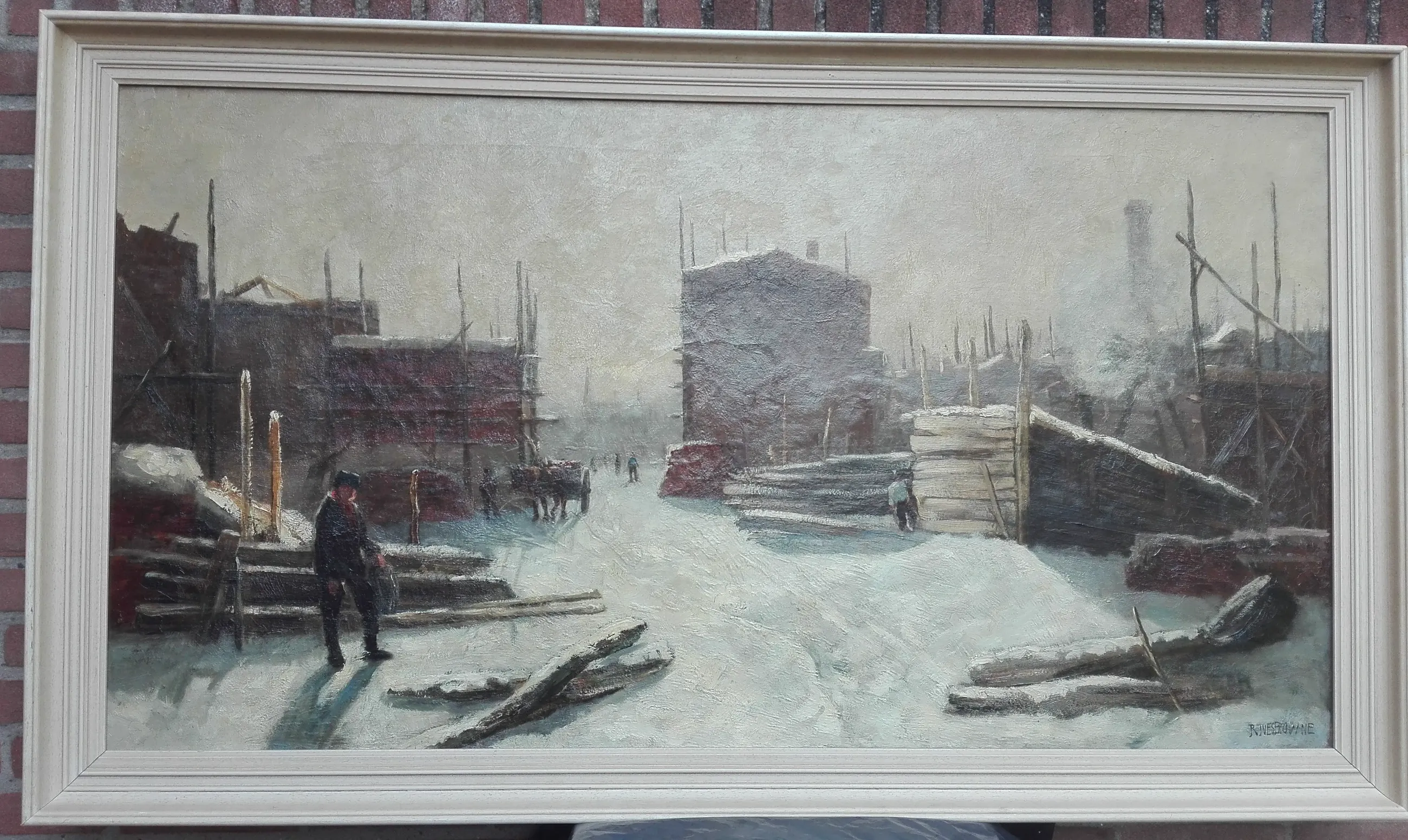 Sfeervolle BOUWPLAATS in de WINTER - ca 1900 Het GROTE schilderij verkeerd in goede staat; op een enkele plek iets craquelé - Olieverf op doek -- Afmeting van het doek 140 x 75 cm!! -- Afmeting inclusief lijst 152 X 88 cm!! -- Gesigneerd rechtsonder