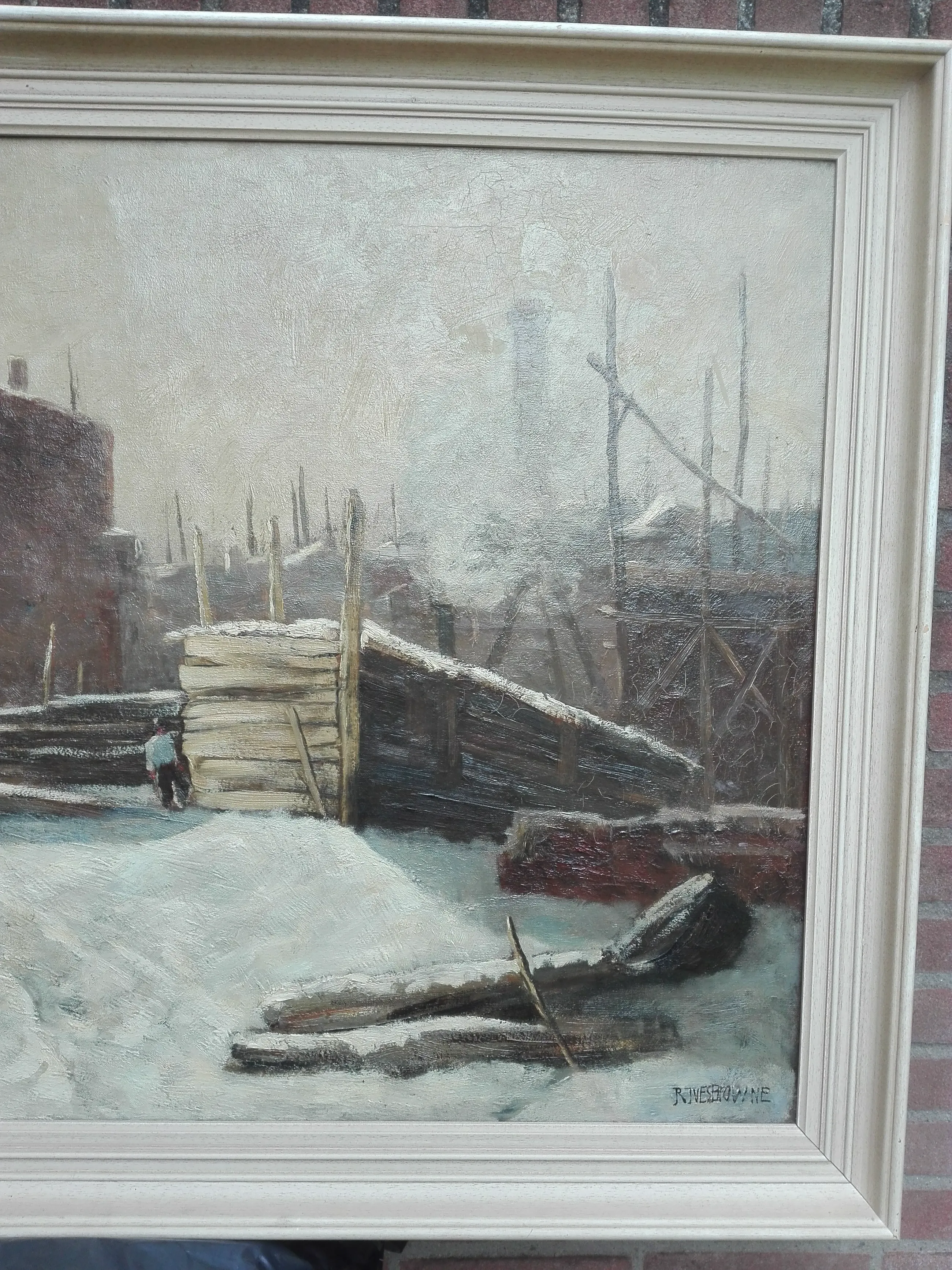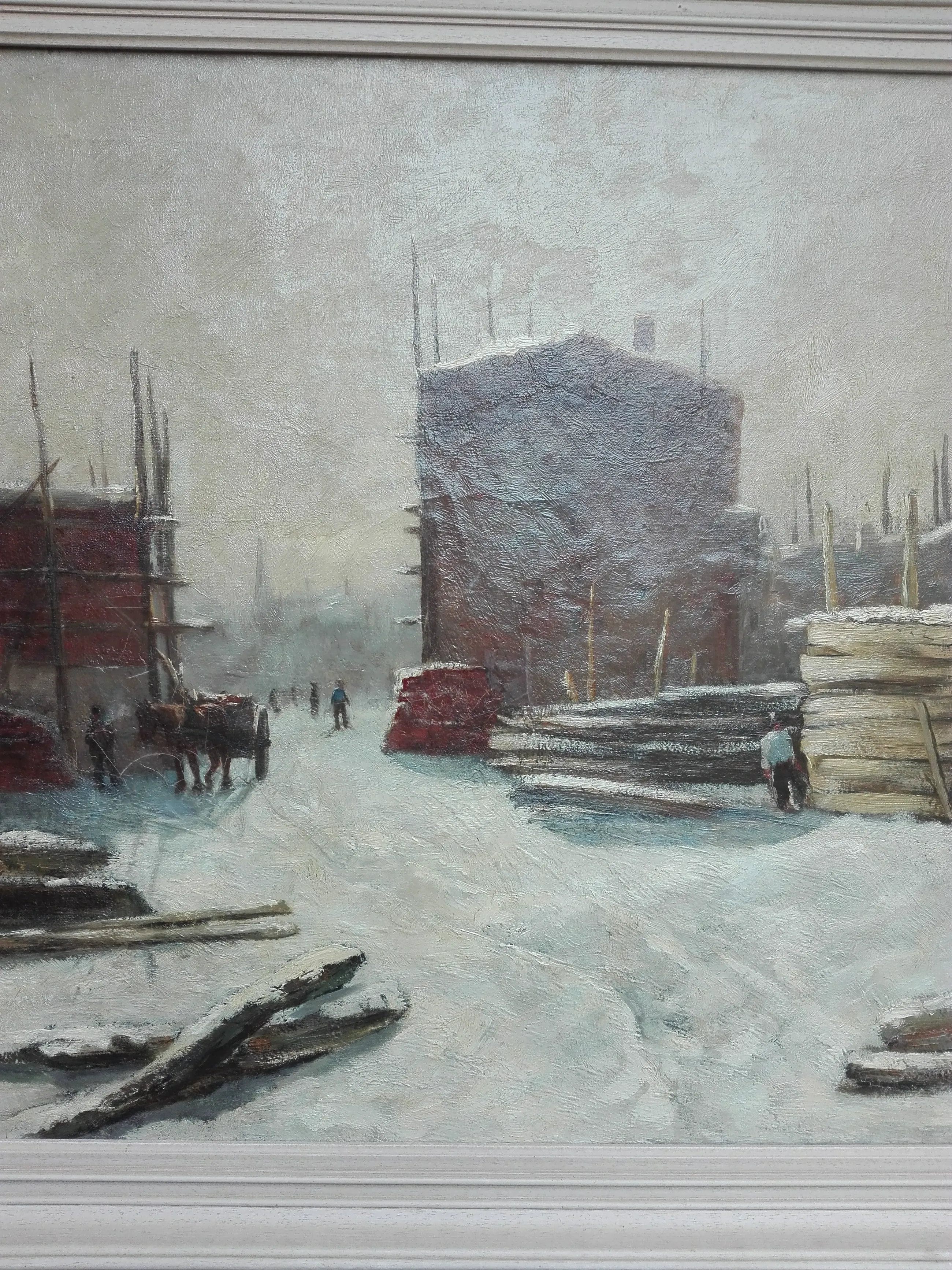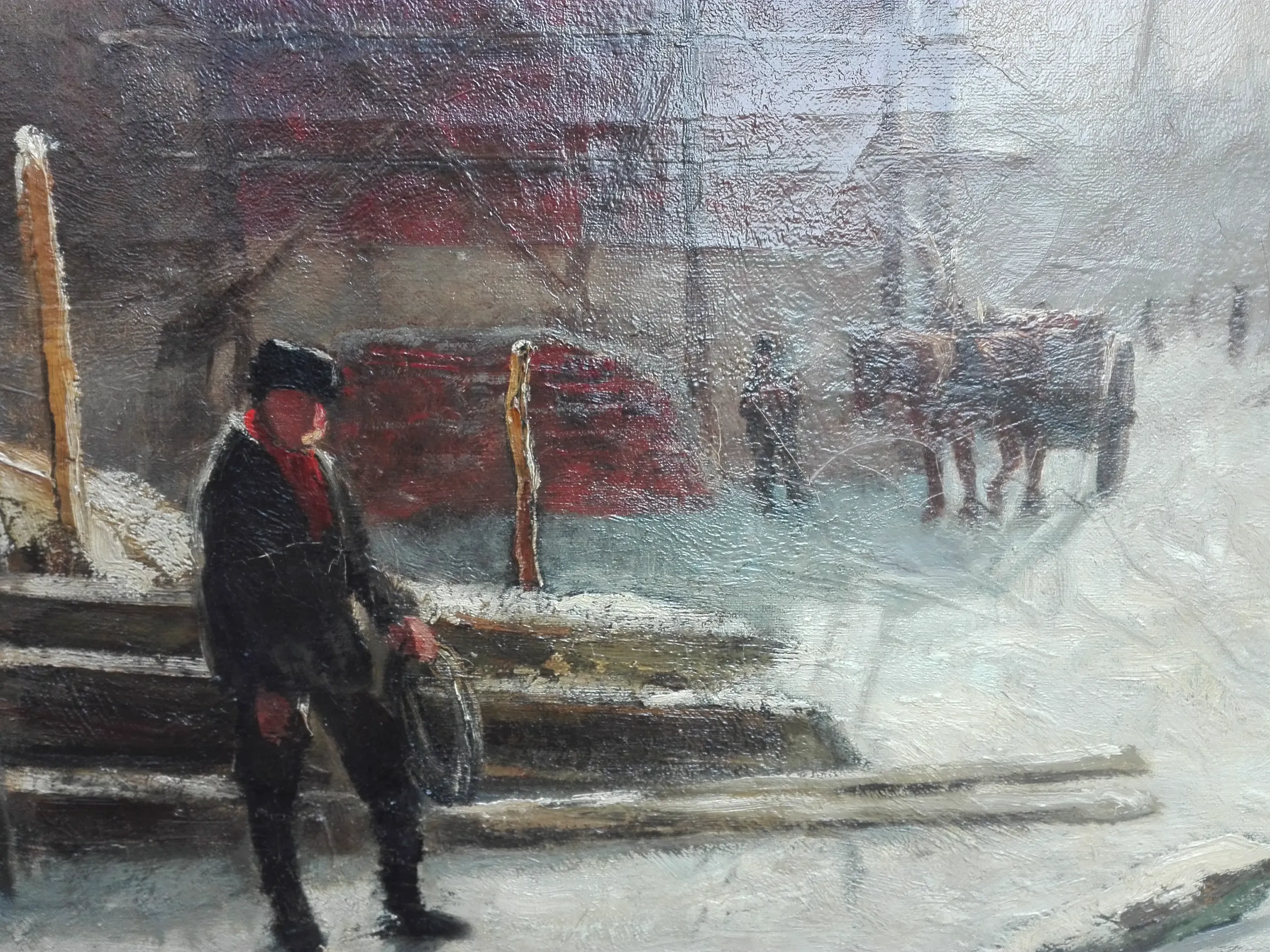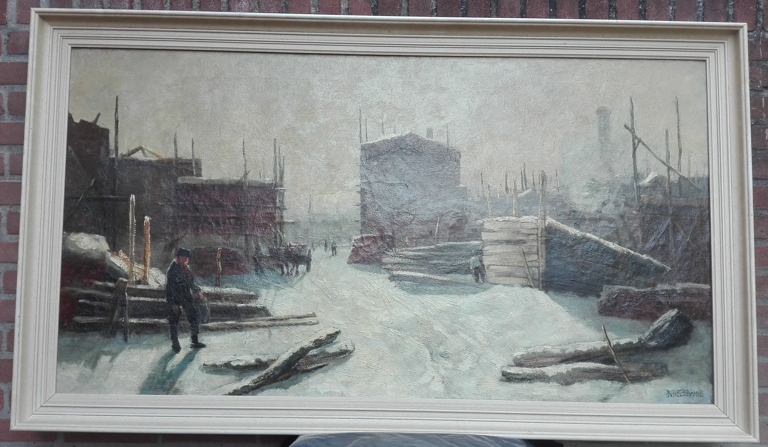 Sfeervolle BOUWPLAATS in de WINTER - ca 1900 Het GROTE schilderij verkeerd in goede staat; op een enkele plek iets craquelé - Olieverf op doek -- Afmeting van het doek 140 x 75 cm!! -- Afmeting inclusief lijst 152 X 88 cm!! -- Gesigneerd rechtsonder