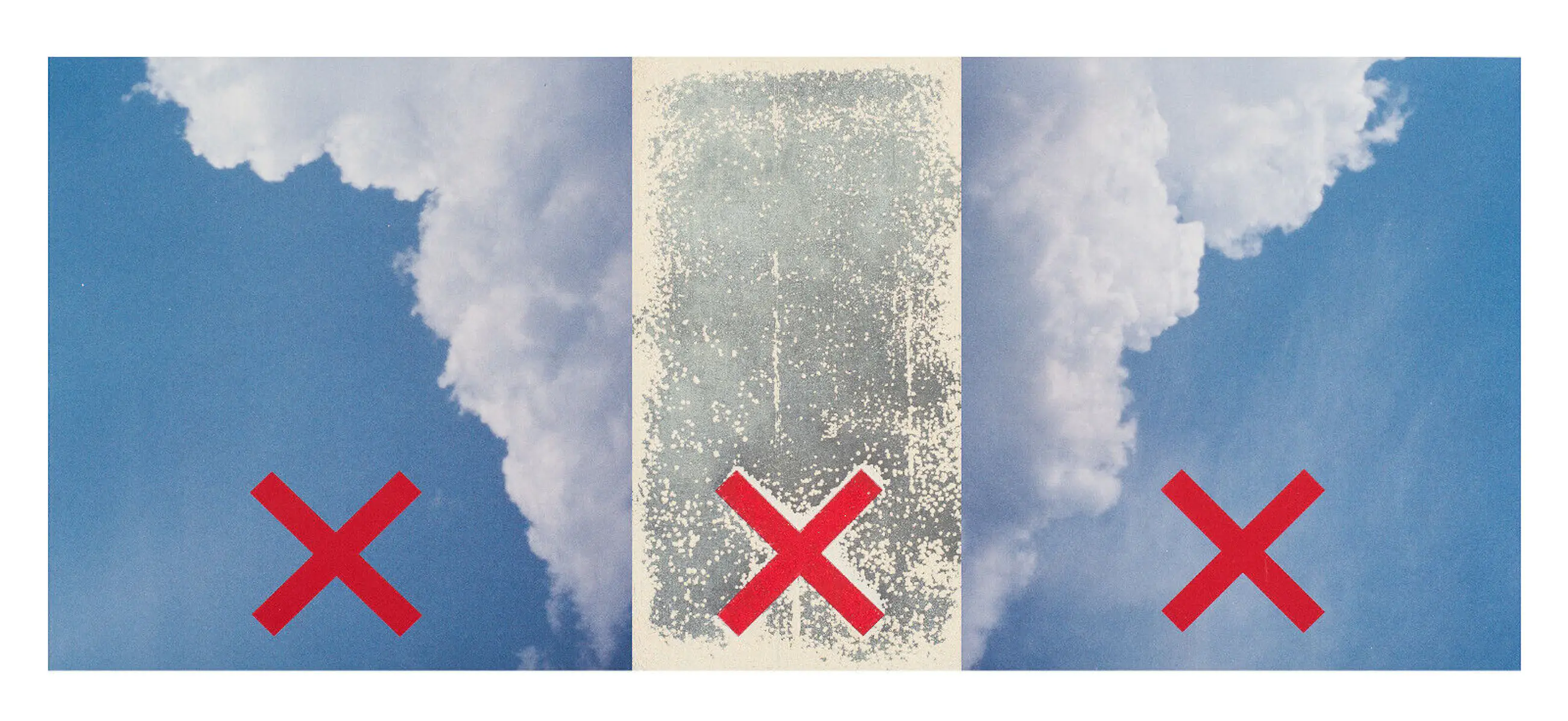 Drie aluminium panelen. Een omkleed met lood (middelste) en twee met een foto C print Het lood is door de jaren heen geoxideerd zoals bedoeld door Robert Longo. Krijgt zo ook de afbeelding van een wolk met viltstift gesigneerd dit is nr. 37/200 nummer op de foto kan afwijken