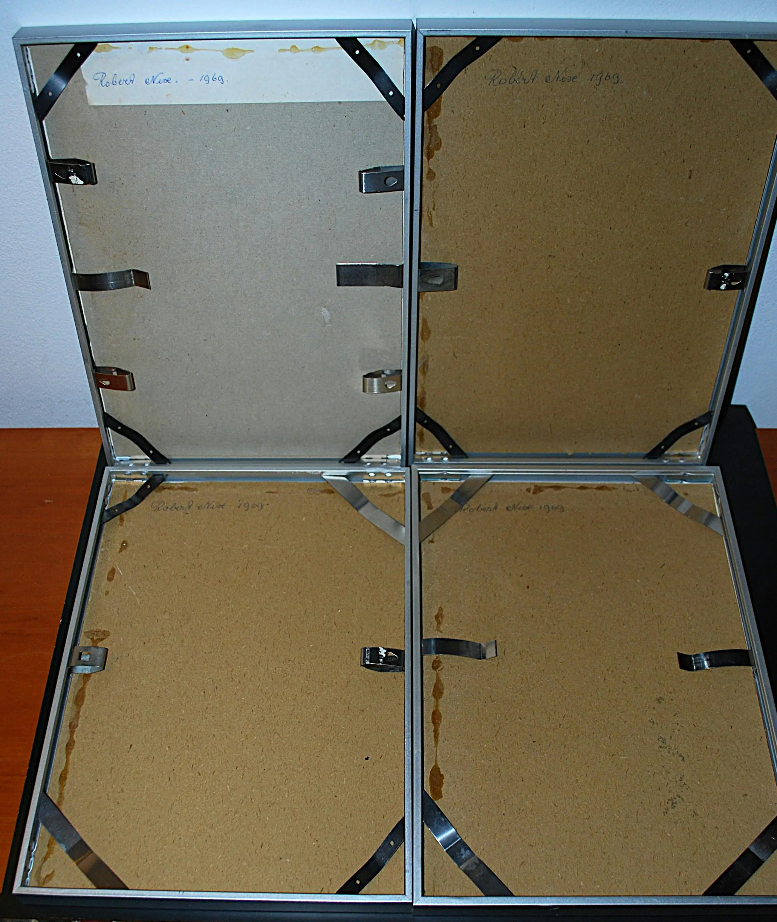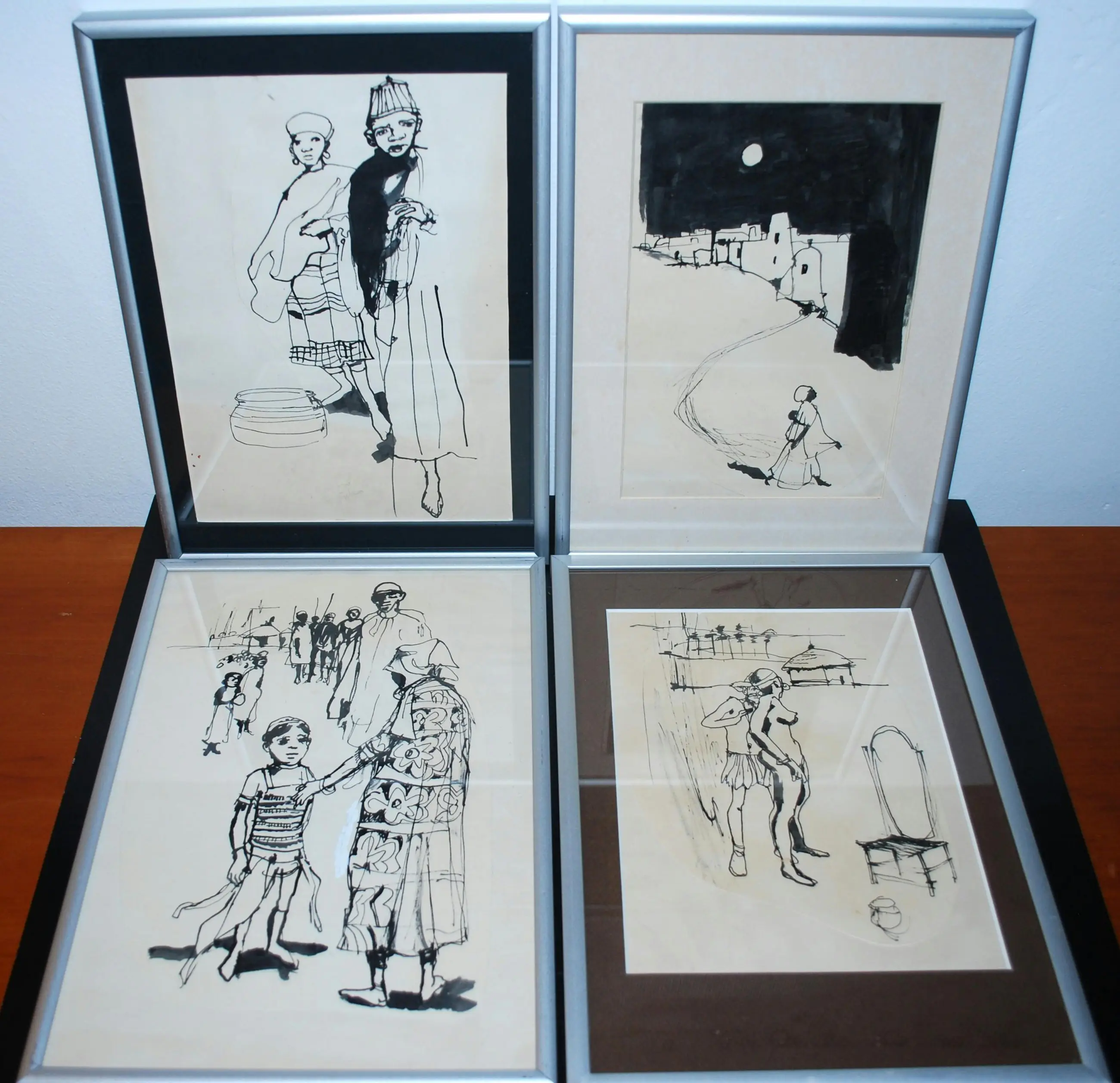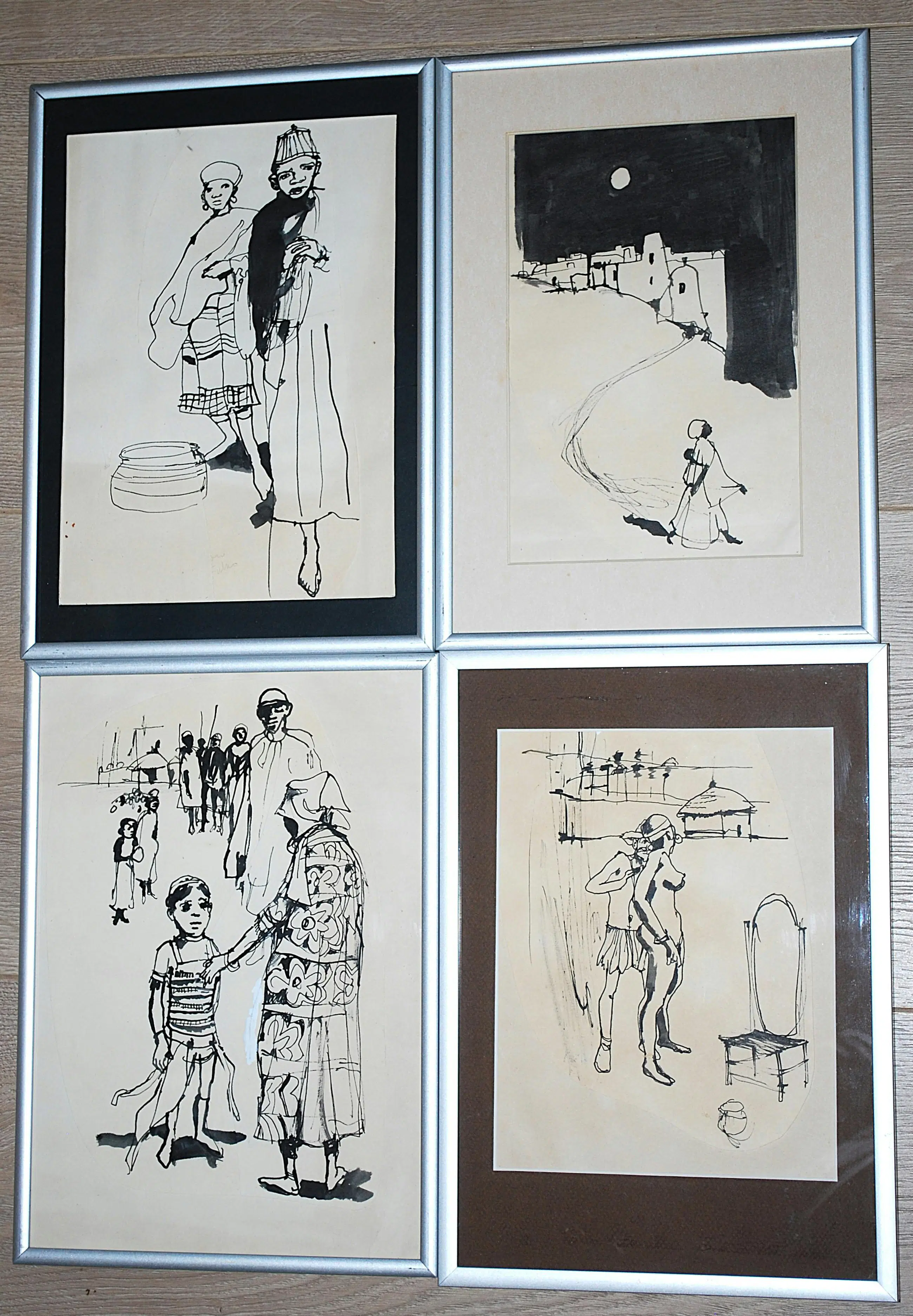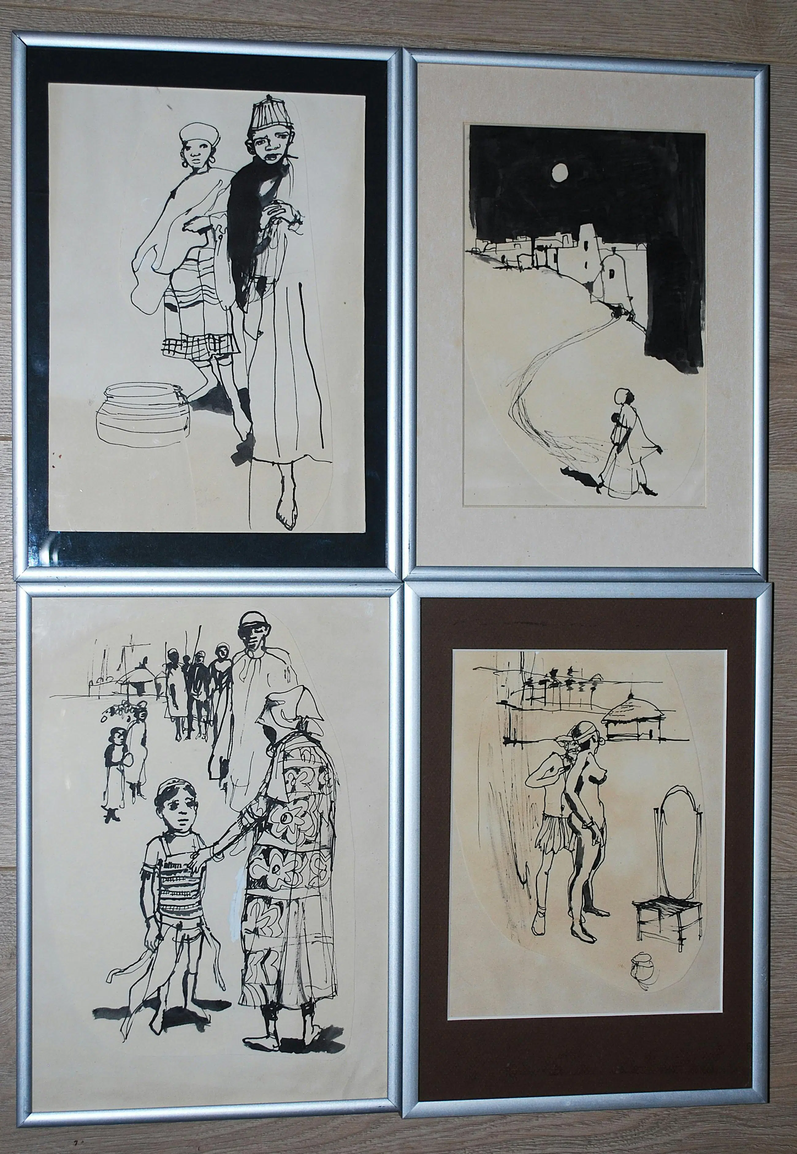Tekeningen, gecollageerd met extra papier. Los geplaatst (3x) achter passepartouts. Bladmaten 40x30 cm, en 1x ca. 30x30 cm. Alle 4 gesigneerd en gedateerd op het achterkarton, In alu lijsten.