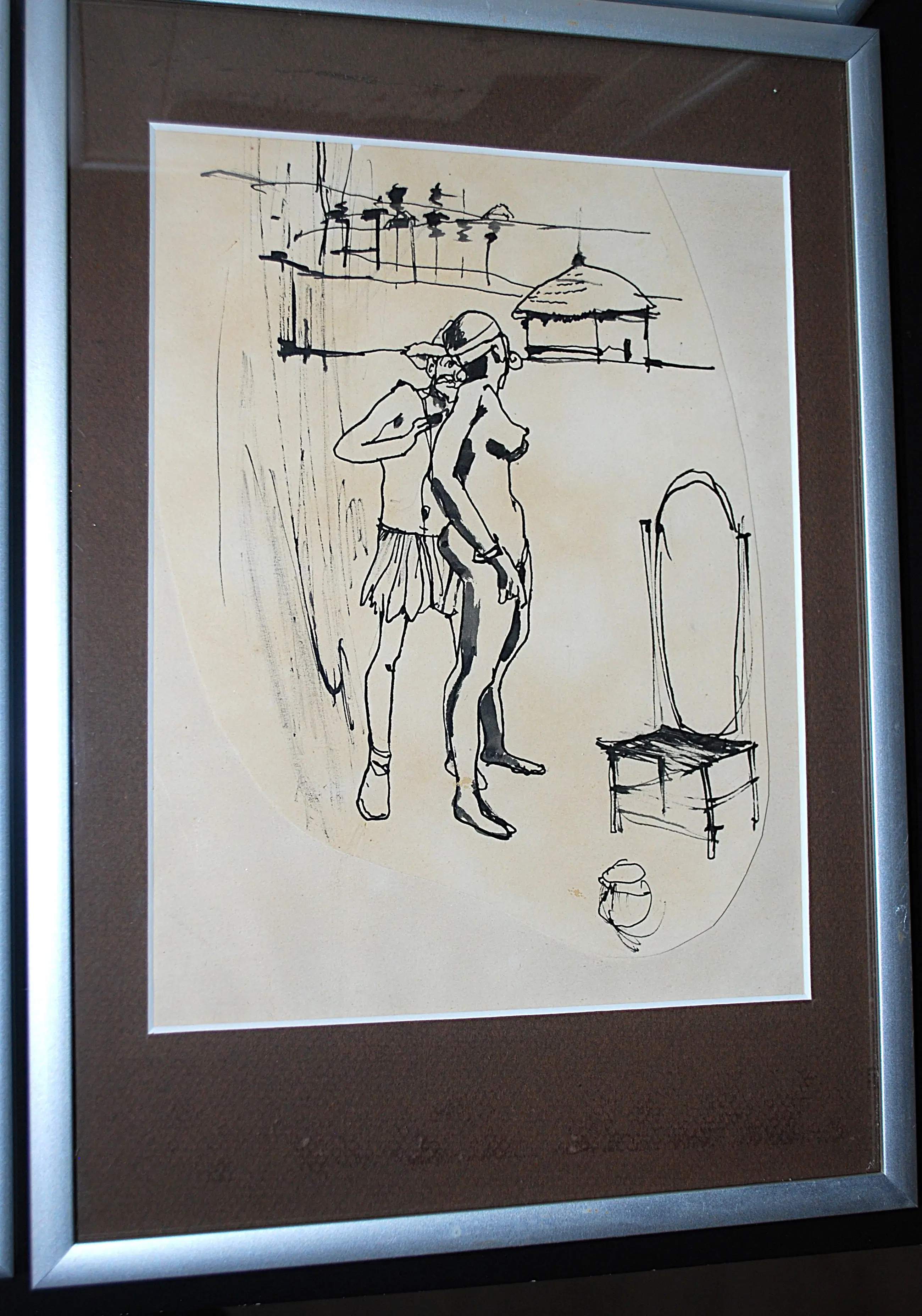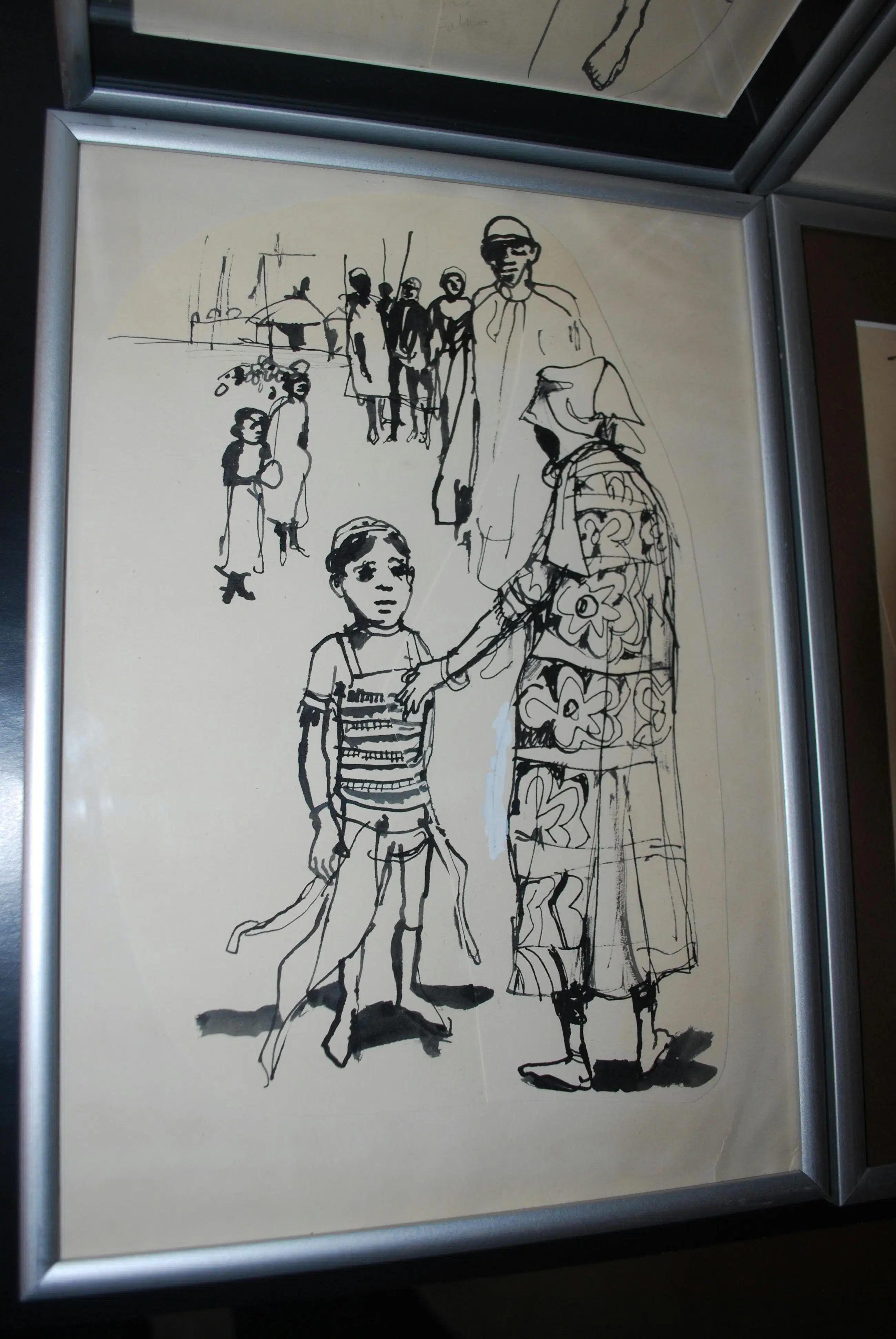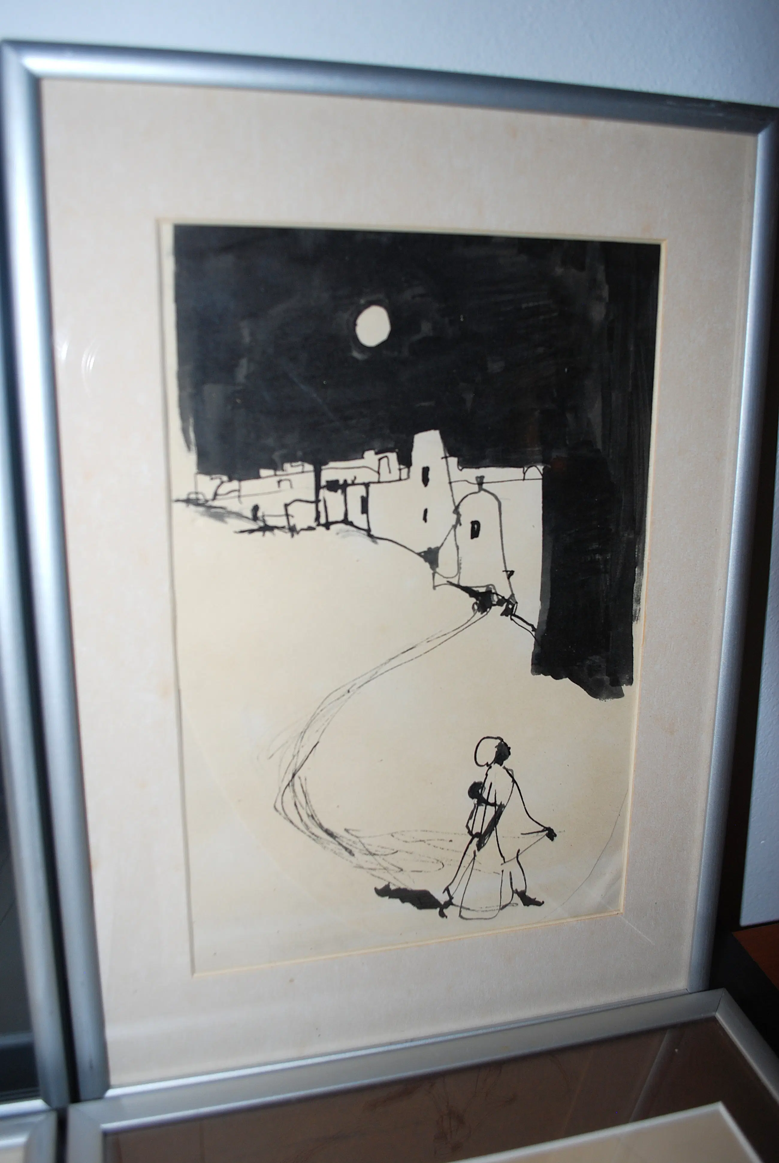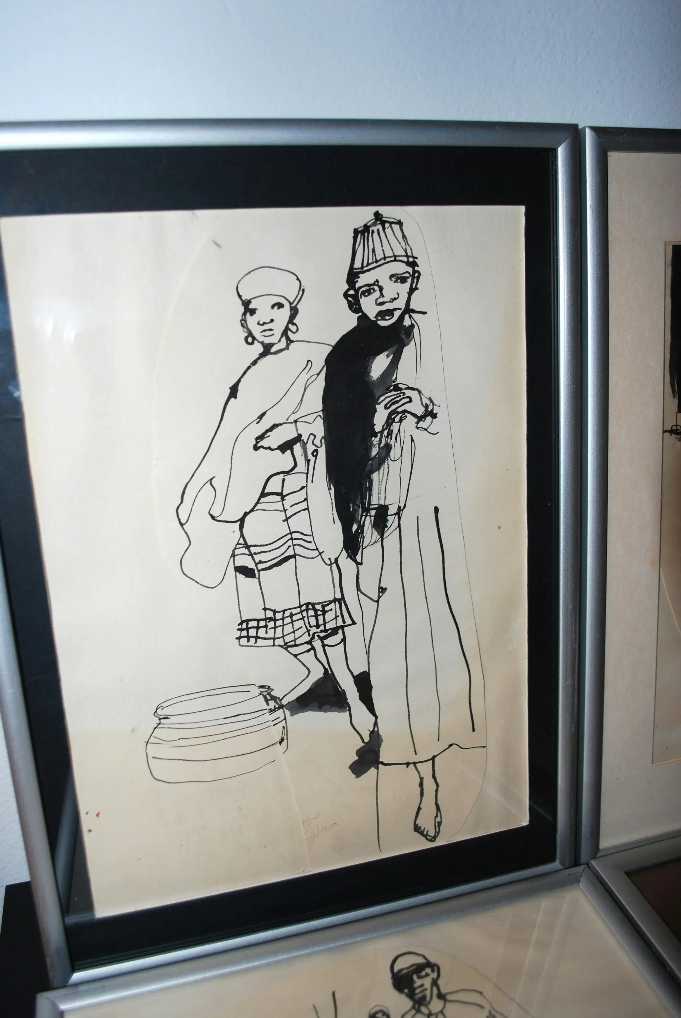 Tekeningen, gecollageerd met extra papier. Los geplaatst (3x) achter passepartouts. Bladmaten 40x30 cm, en 1x ca. 30x30 cm. Alle 4 gesigneerd en gedateerd op het achterkarton, In alu lijsten.