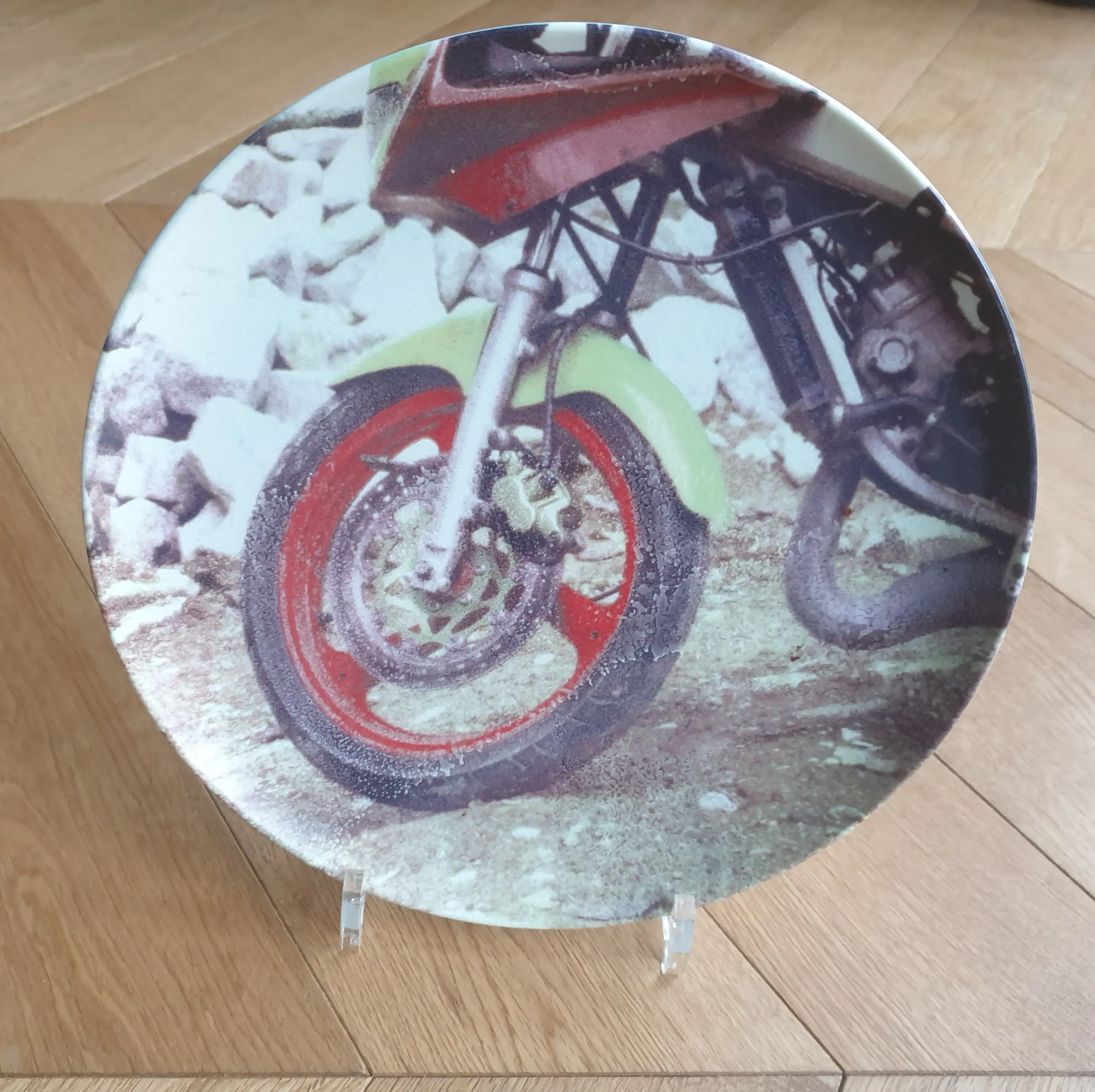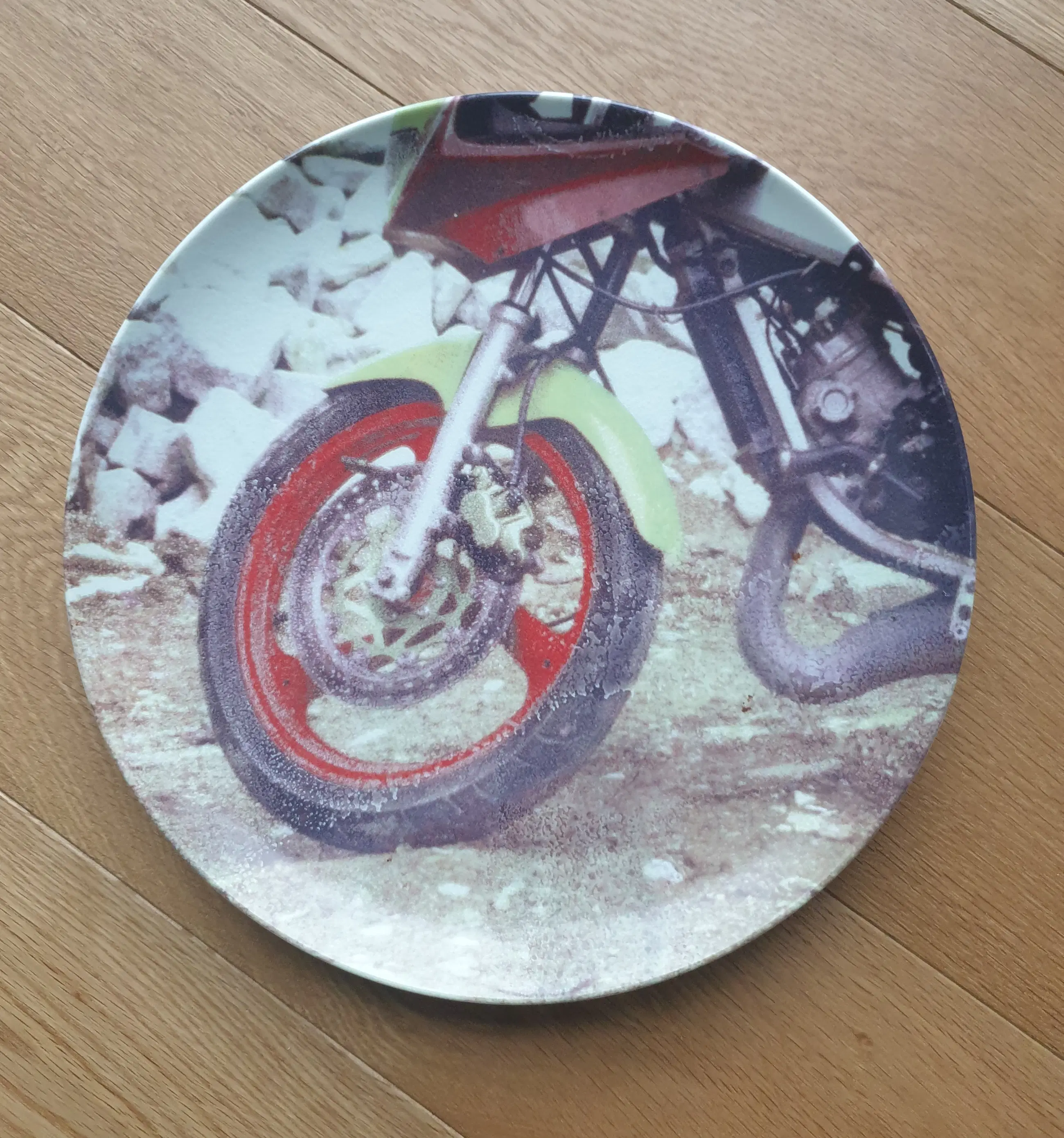 Porseleinen (Uitgave Guggenheim New York) bord van Robert Rauschenberg uit 1997. Het bord heeft als voorstelling een voorwiel van een motor. Het is een exclusieve editie van het Guggenheim te New York. Drukgesigneerd. Diameter 26 cm. Het bord wordt aangetekend verstuurd, maar kan ook afgehaald worden.
