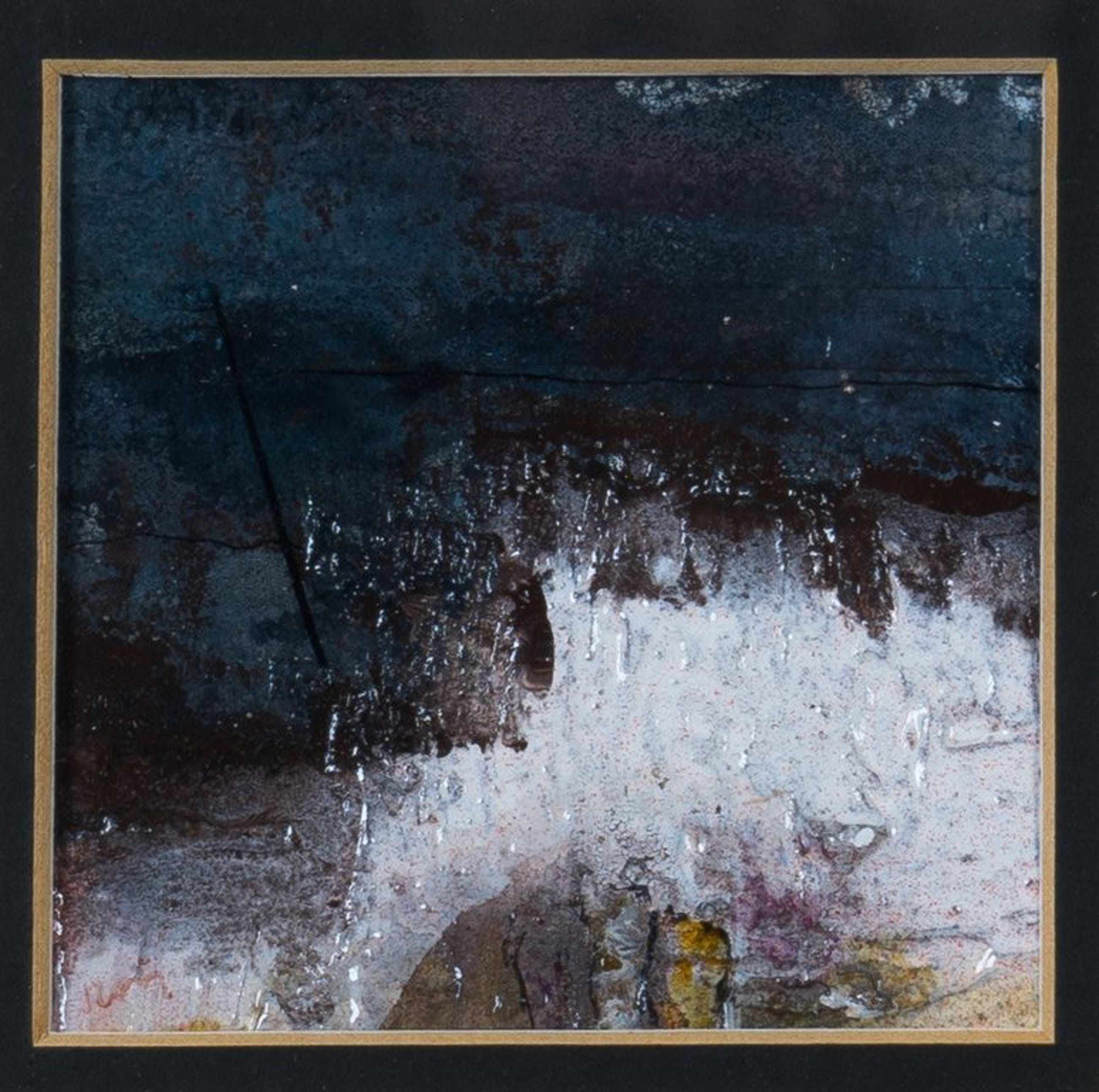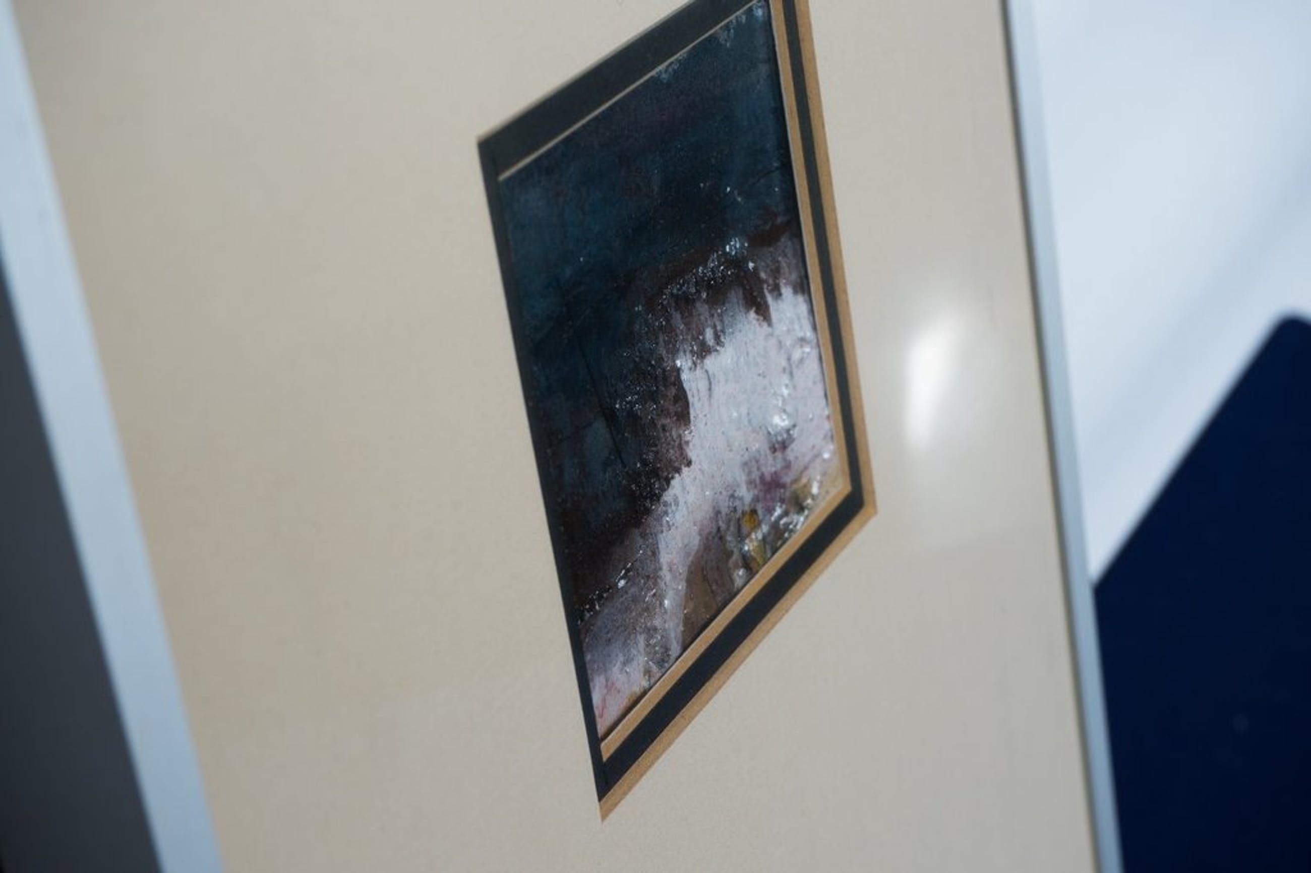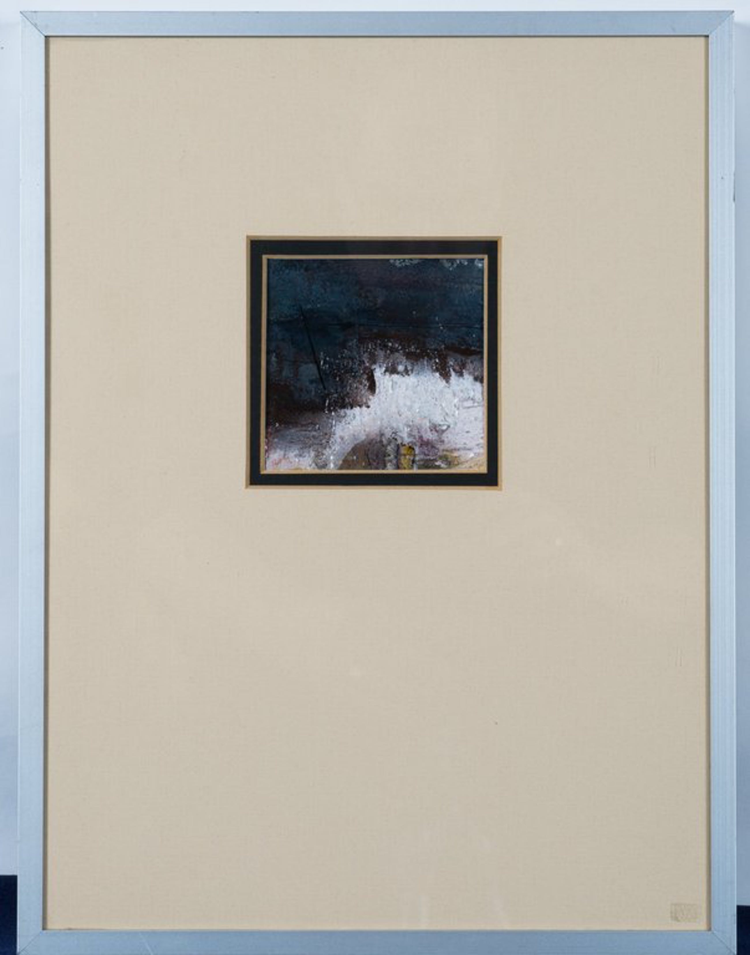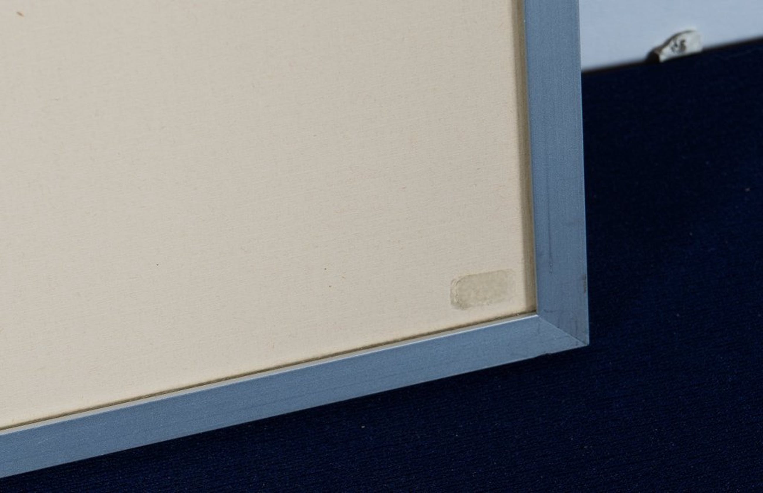 Het werk is ingelijst in een aluminium lijst met een glasplaat.