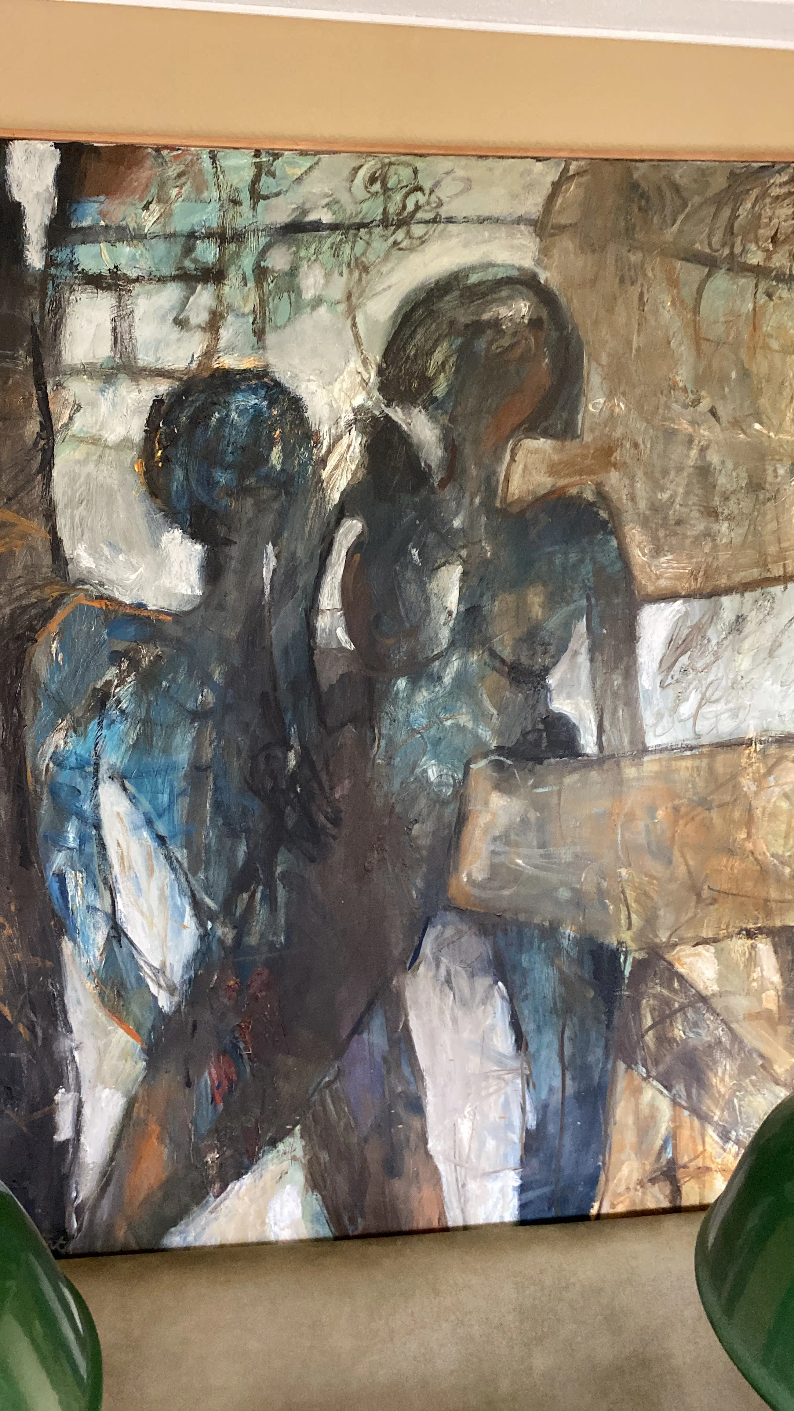 Dit schilderij toont twee menselijke figuren in een halfabstracte, ruwe stijl. Ze lijken dicht bij elkaar te staan, misschien in een omhelzing of een intiem moment, maar hun vormen zijn vervormd en niet scherp afgebakend. Gezichten en lichamen zijn slechts gedeeltelijk herkenbaar, alsof ze oplossen in de achtergrond.