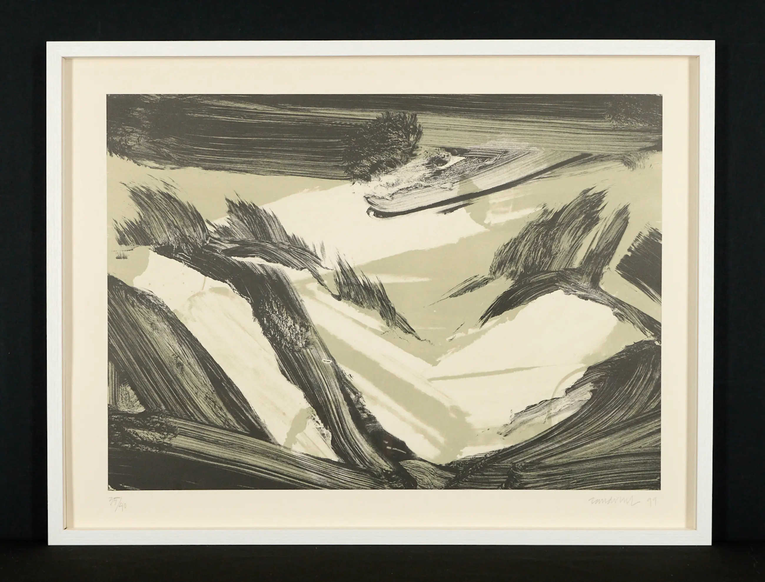 Diese beeindruckende Farblithografie des renommierten niederländischen Künstlers Robert Zandvliet wurde im Jahr 1999 geschaffen und zeigt eine abstrahierte Interpretation einer typisch niederländischen Dünenlandschaft. In weichen Beige- und Grautönen und mit expressiven Pinselbewegungen erzeugt Zandvliet eine kraftvolle Komposition zwischen Natur und Geste. Die Dynamik der Linien und die Spannung zwischen Fläche und Struktur sind charakteristisch für sein Werk.