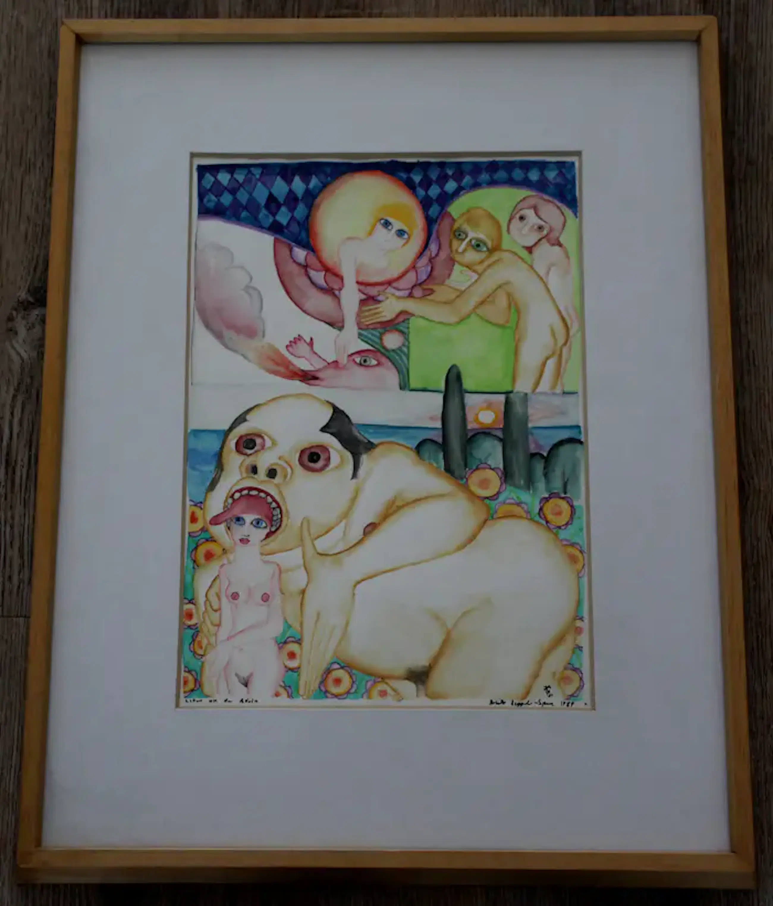 Aquarel van Robert Zeppel - Sperl. Afbeelding van een surrealistische compositie met figuren. Jaar: 1989. Afmetingen incl lijst: H51 x b40cm. Afmeting beeld: H33 x b23cm. Het werk is rechts onderaan, gesigneerd met potlood, door de kunstenaar. De authenticiteit van het aangeboden werk wordt volledig gegarandeerd. Een certificaat van echtheid kan, op aanvraag, worden gemaild.