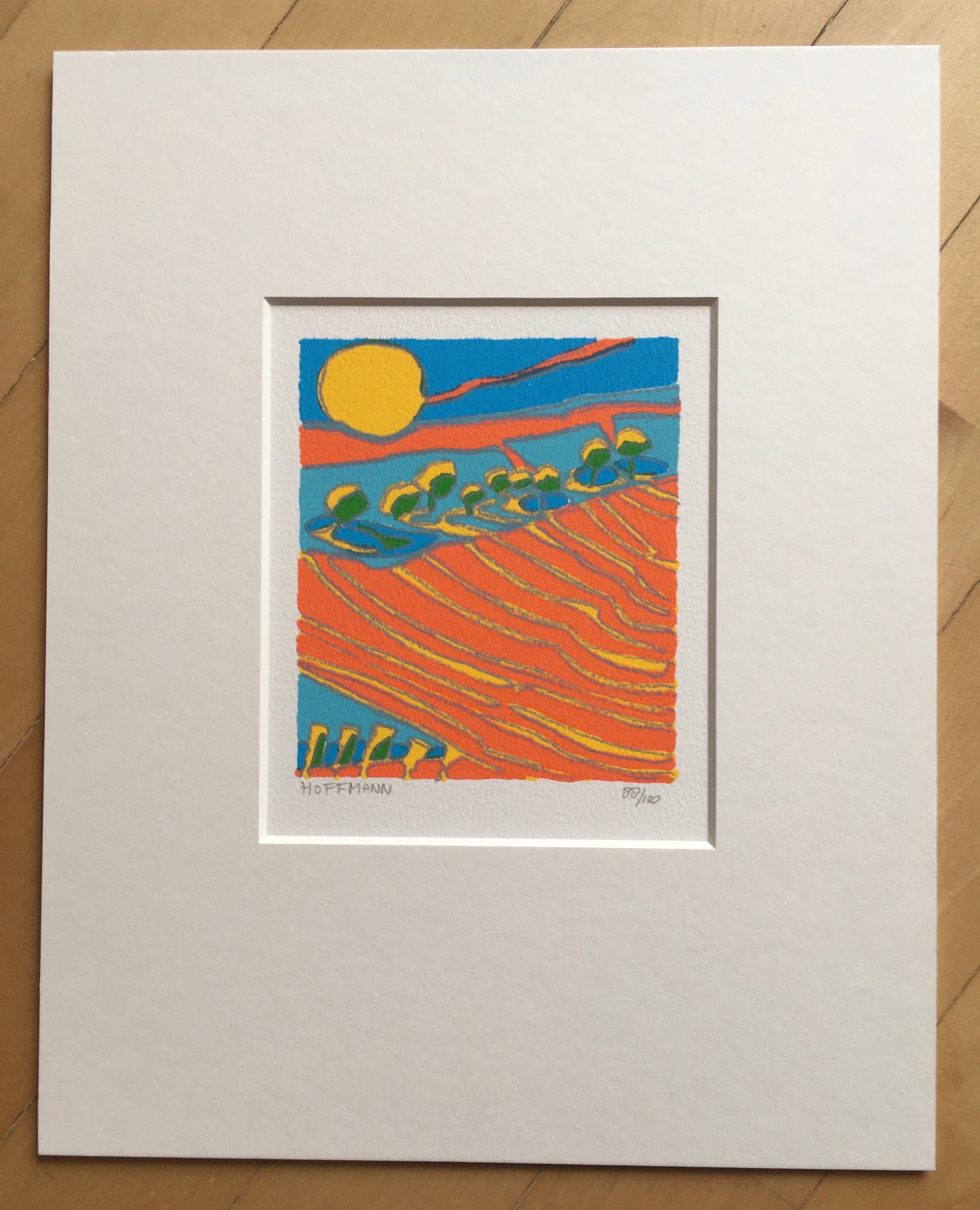 Zomerse litho van een landschap uitgevoerd in krachtige en vrolijke kleuren. De andere, hier eveneens aangeboden litho 'Polderlandschap', is een variant op hetzelfde thema. Beide werken vormen - naast elkaar opgehangen - een mooi geheel...