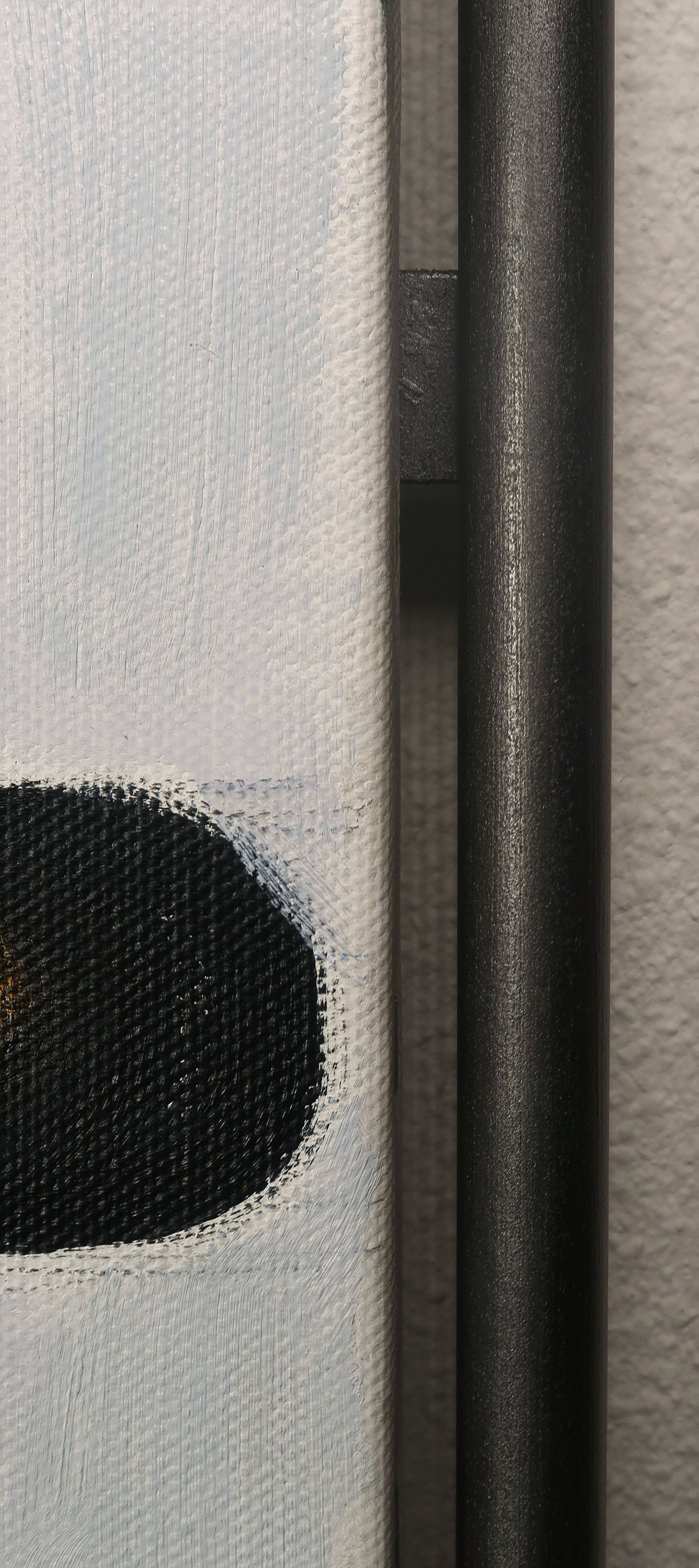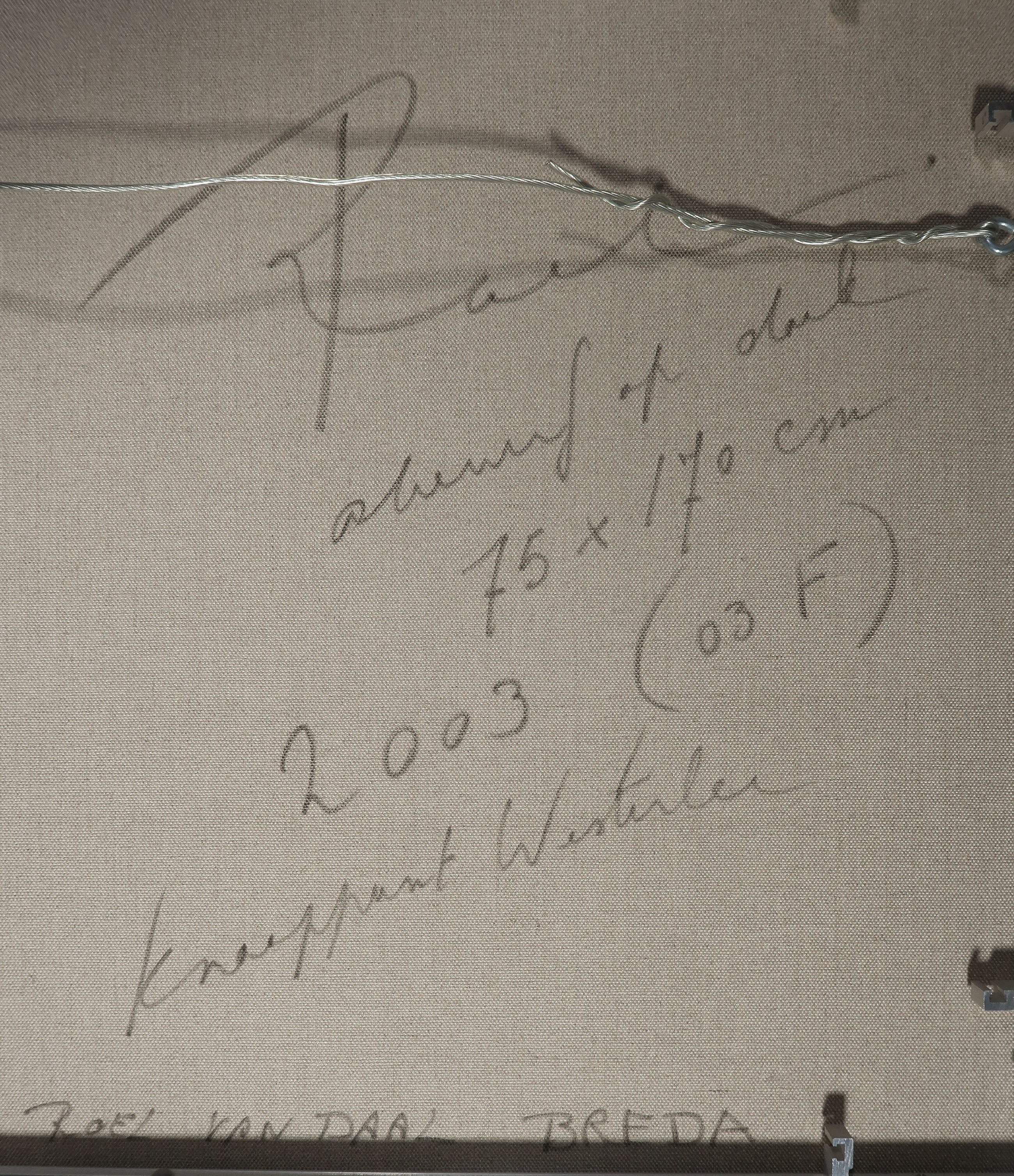 Het werk is ingelijst in soort ''buisframe'' van geschilderd hout. De lijst zit, op een paar bevestigingspunten na, ongeveer een centimeter van het doek. Zie hiervoor de detailfoto.