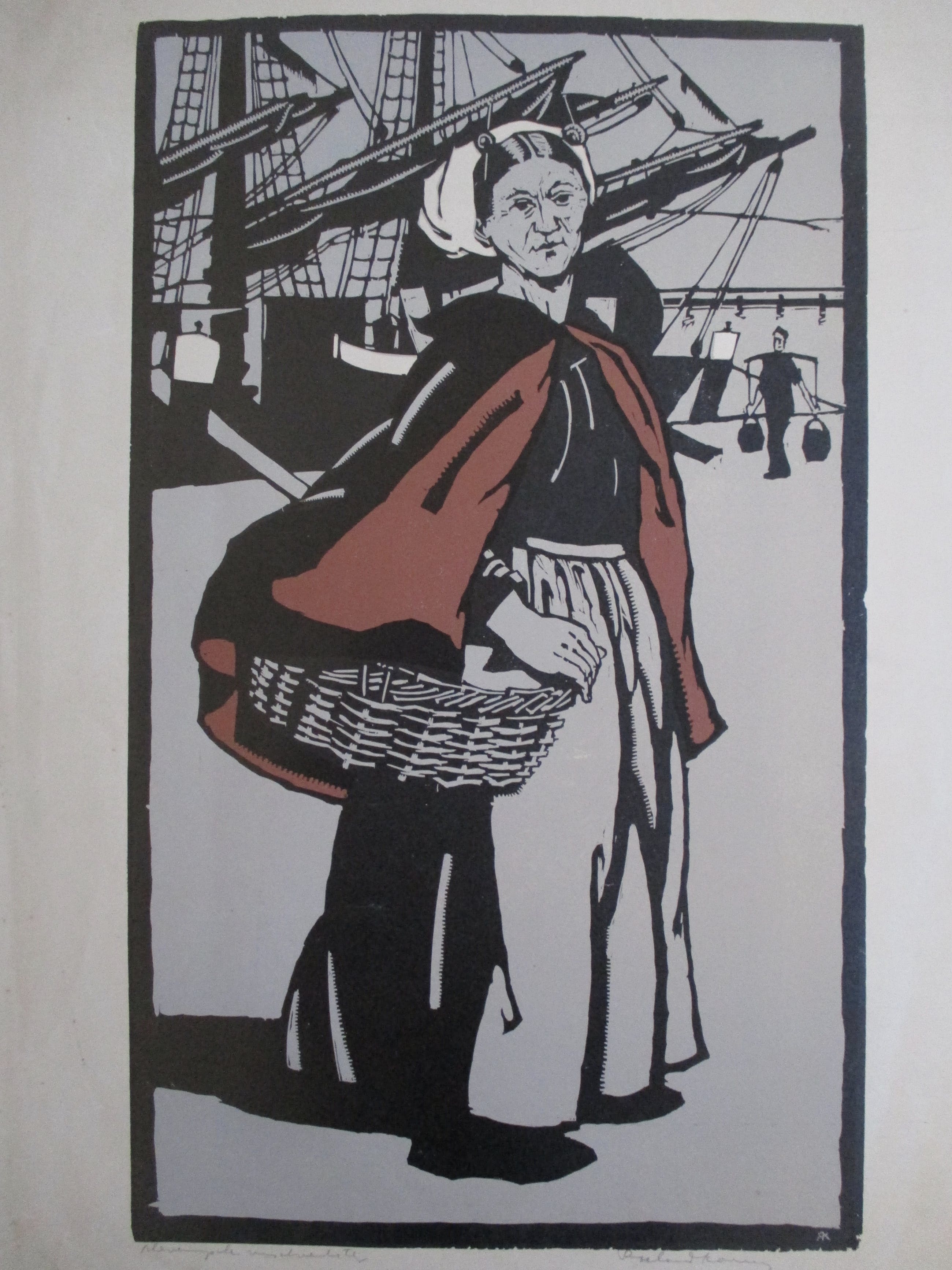 Houtsnede van Roeland Koning, gesigneerd en getiteld in potlood. Verzending tussen twee platen, 8,50, aangetekend 10,15