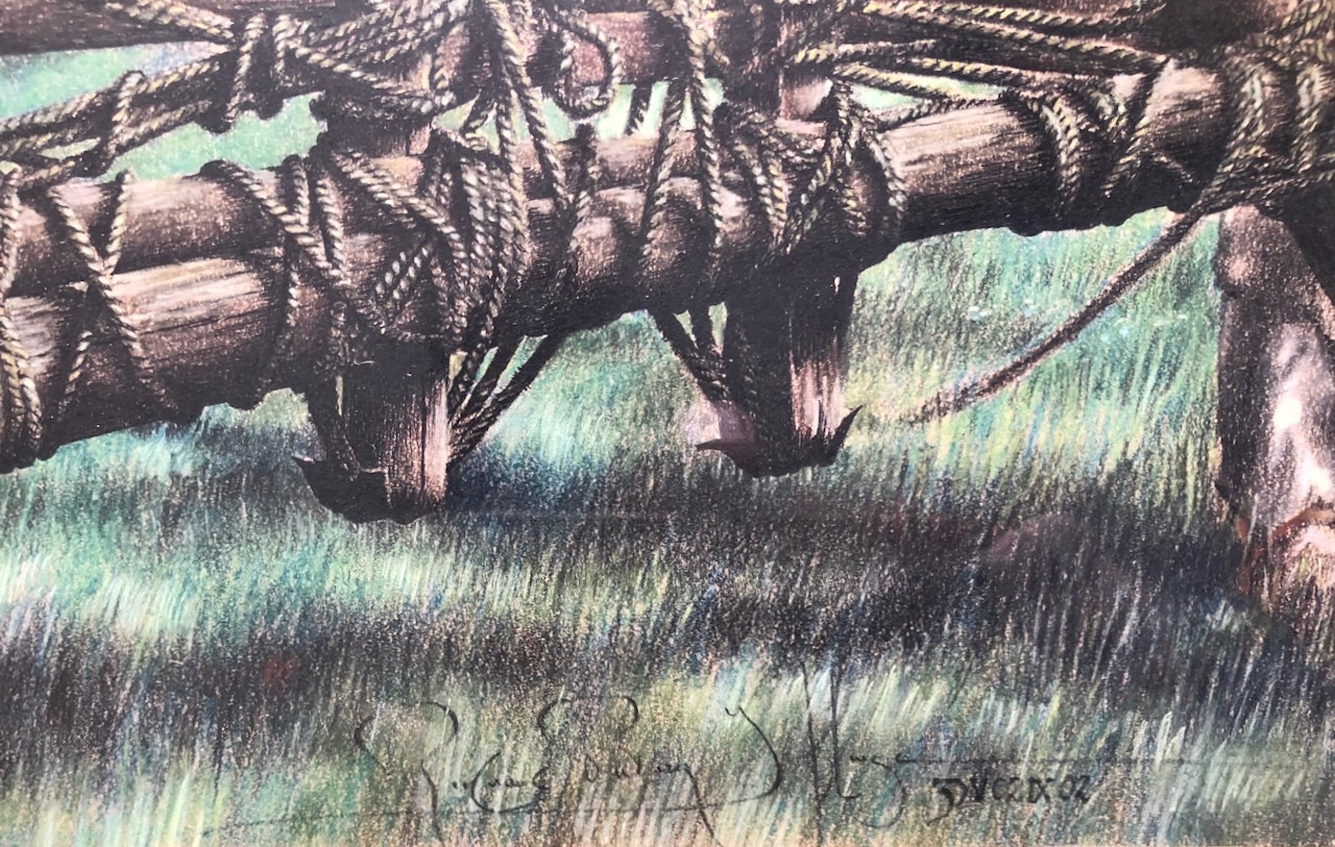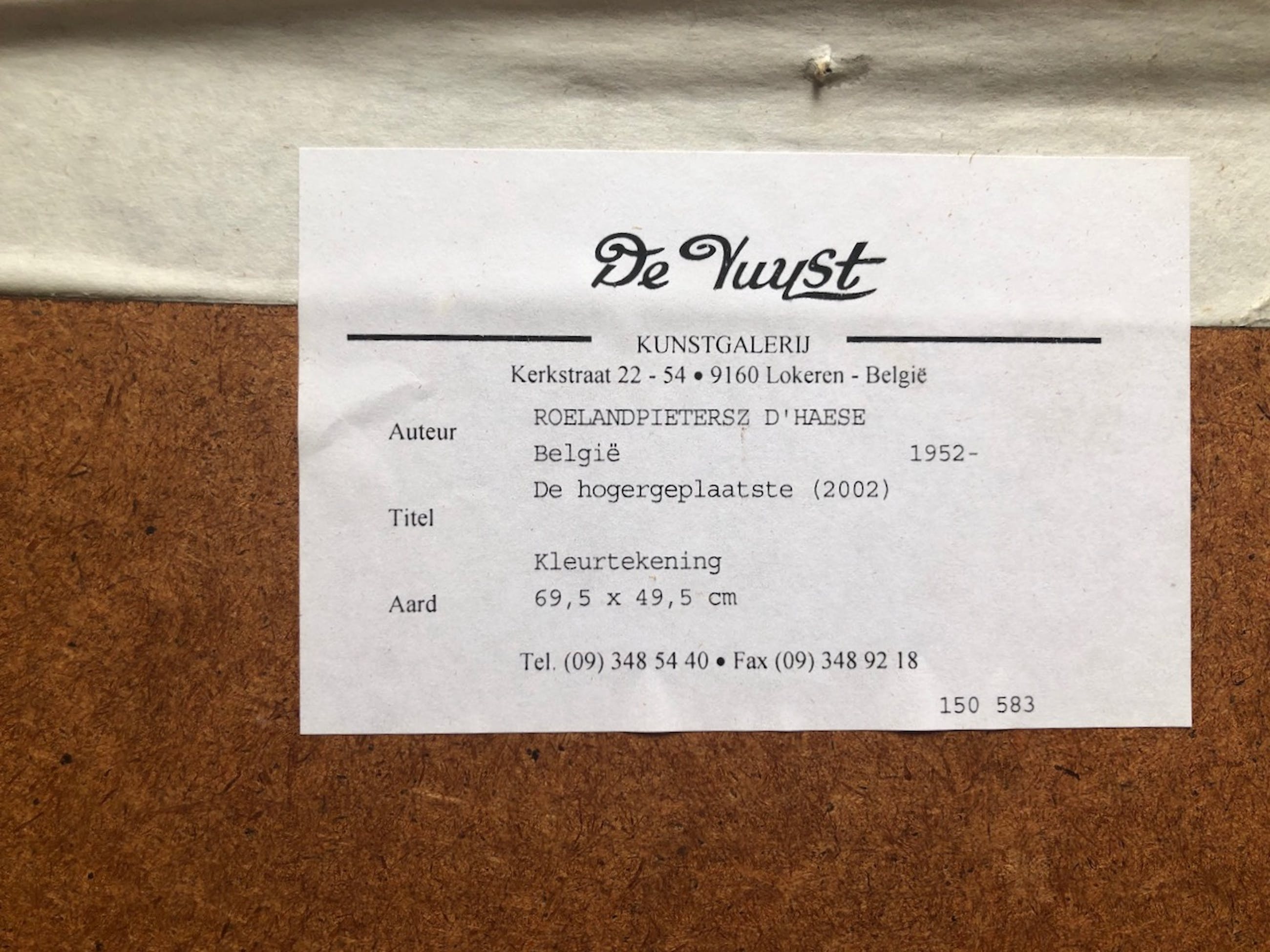 Natuurlijk leuk voor een directiekamer (met een knipoog) gezien de titel van het werk "De Hogergeplaatste" oftewel "L'Eminentissime" uit 1981. Het werk is gemaakt met behulp diverse technieken zoals uit een van de labels achterop het werk blijkt: Pastelpotkood, pastelkrijt en tekenpotloden. De stijl valt te omschrijven als magisch (sur)realisme.