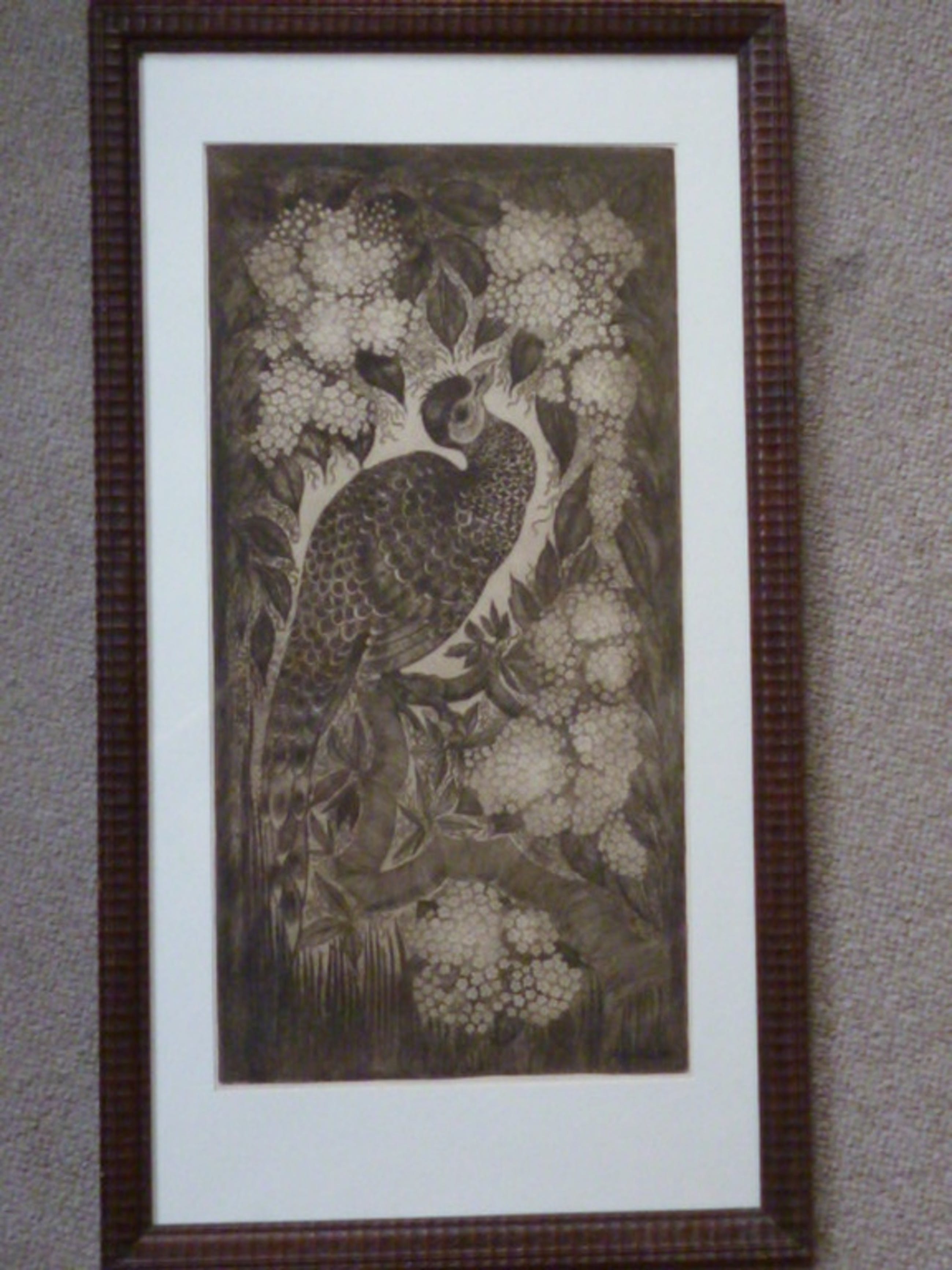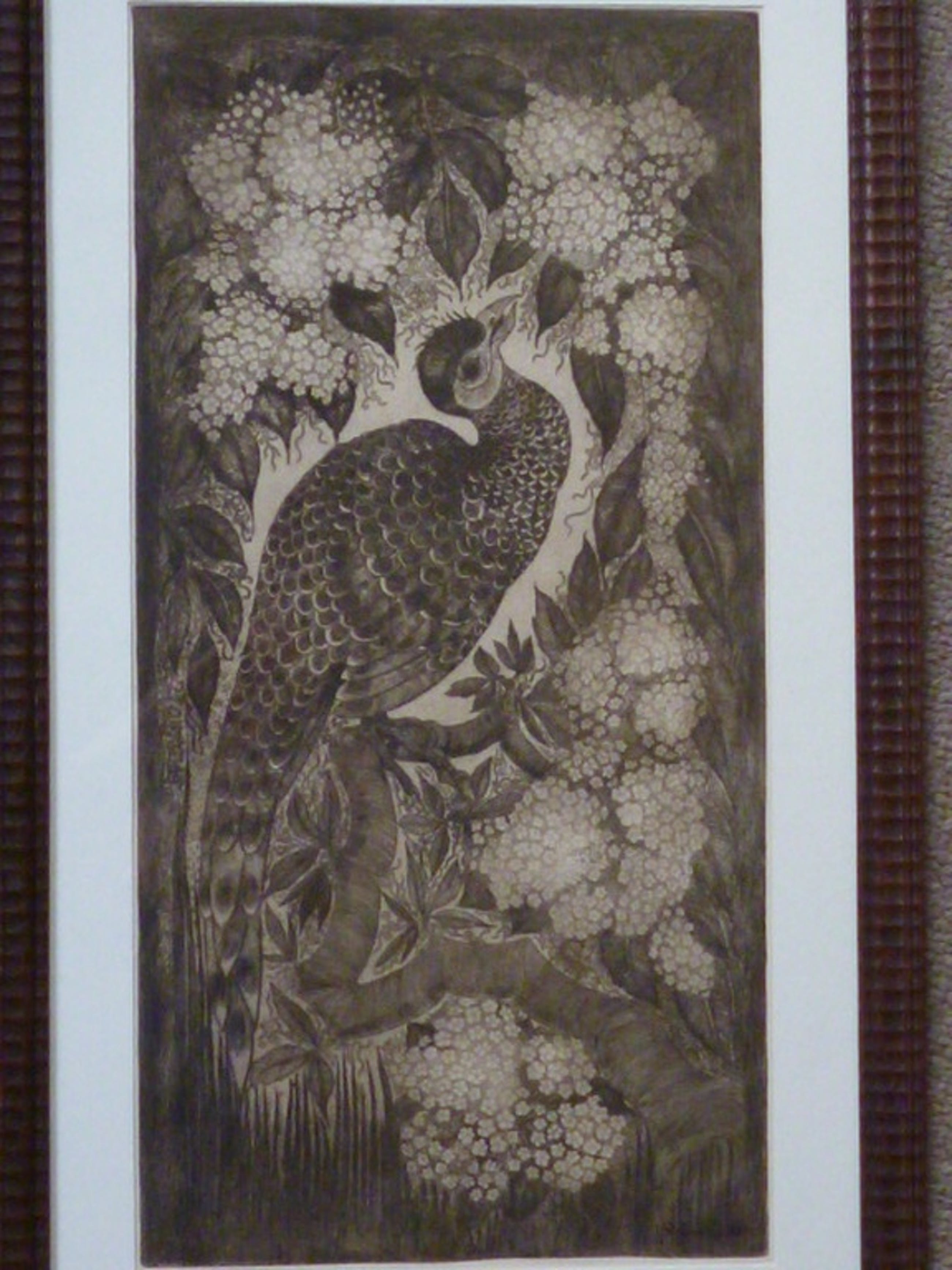 Ets, voorstellende een exotische vogel op tak in Art Deco stijl.