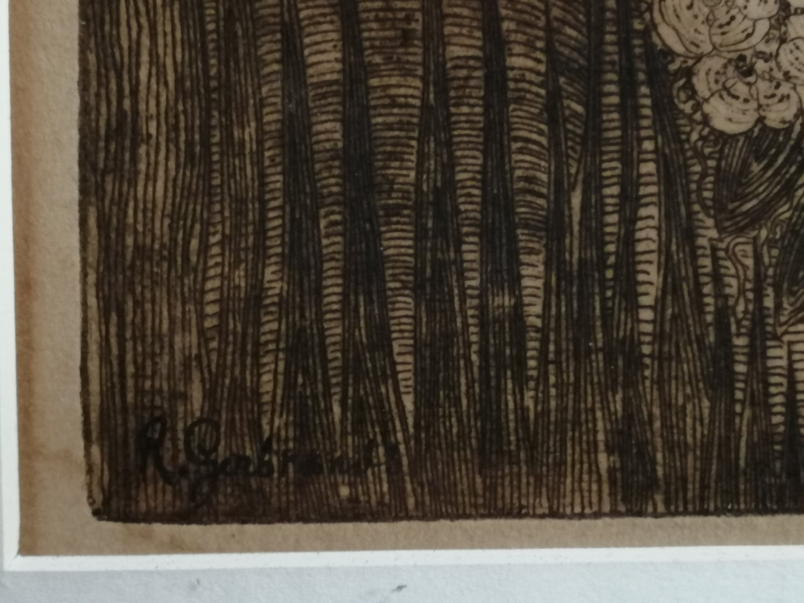 Ingekleurde ets in art deco stijl.Inkt gesigneerd linksonder.Beeldmaat 49,5x25 cm. Lijstmaat 69x51 cm.Fraaie lijst met enige gebruikssporen.Roelf Gerbrands werd geboren te Groningen op 11 november 1891 en overleed te Haarlem op 3 april 1954.