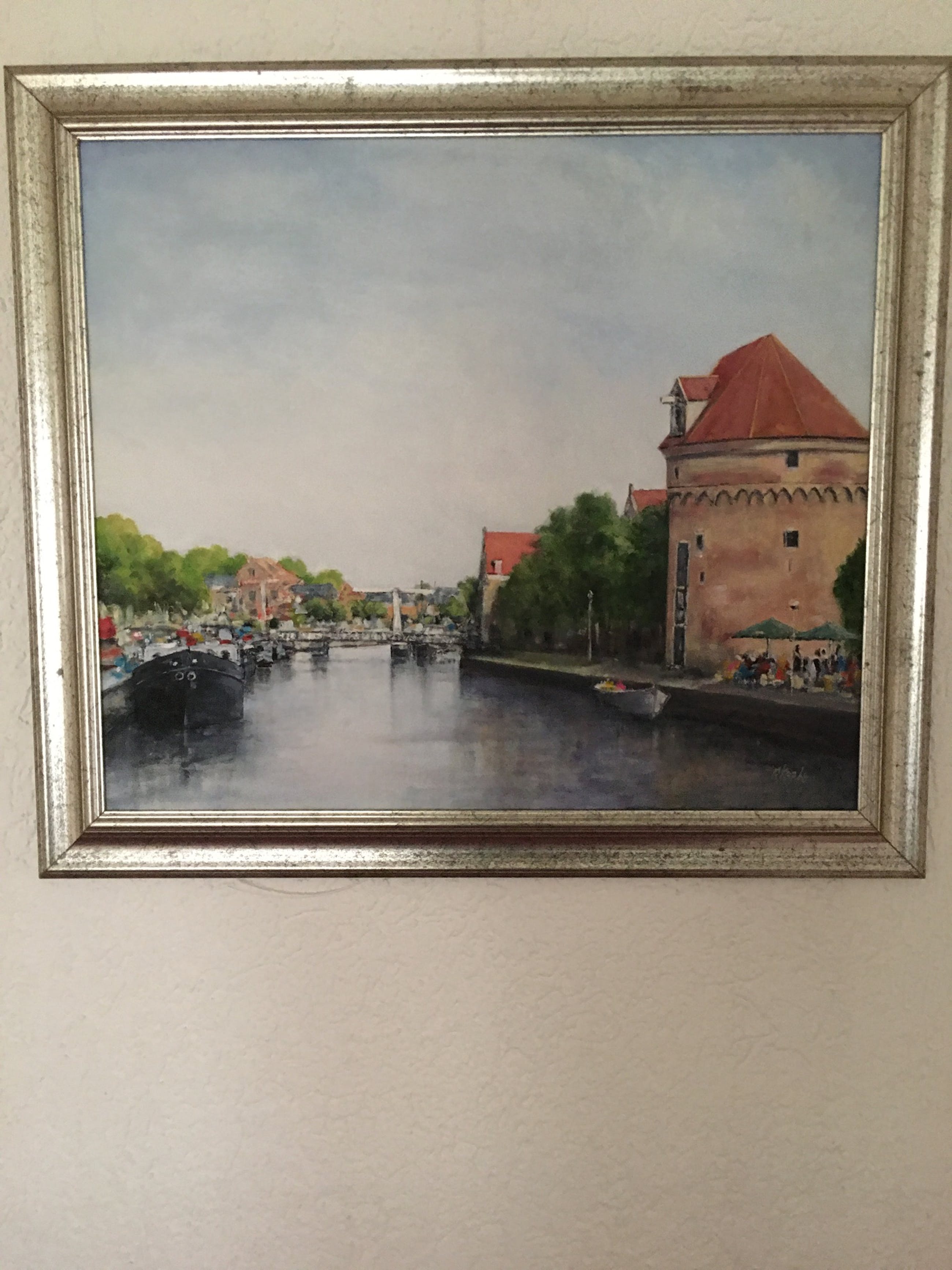 Realistisch/impressionistisch schilderij van de Wijndragerstoren en de Thorbeckegracht in Zwolle door de Drentse kunstenaar Roelf Koobs.
