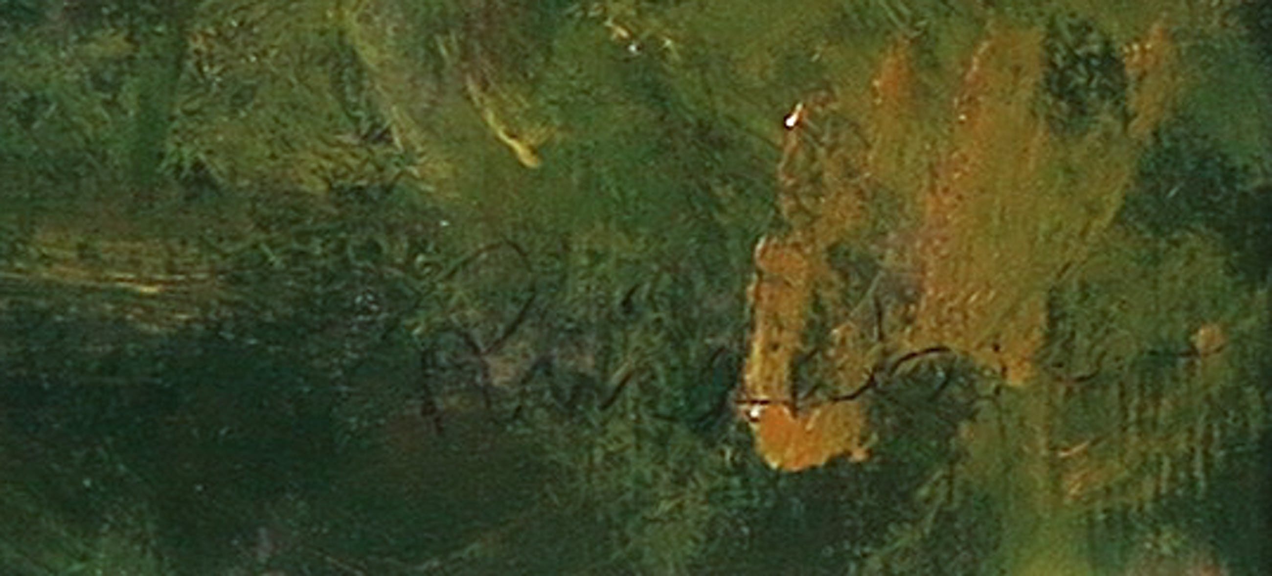 | Doordat de kunstenaar in een vlugge schilderstijl werkt is op kleine plekjes op het schilderij de verf wat dun aangebracht. Daardoor is op deze plekken het paneel enigszins zichtbaar. Door de bruine kleur hiervan is dit niet storend in de voorstelling. | |