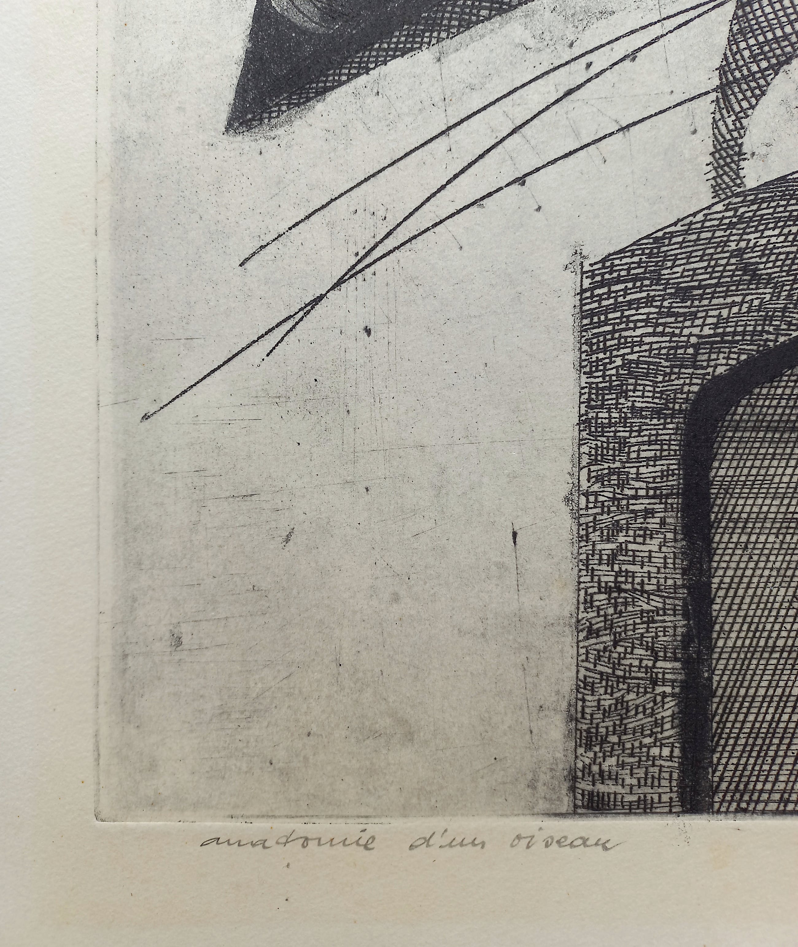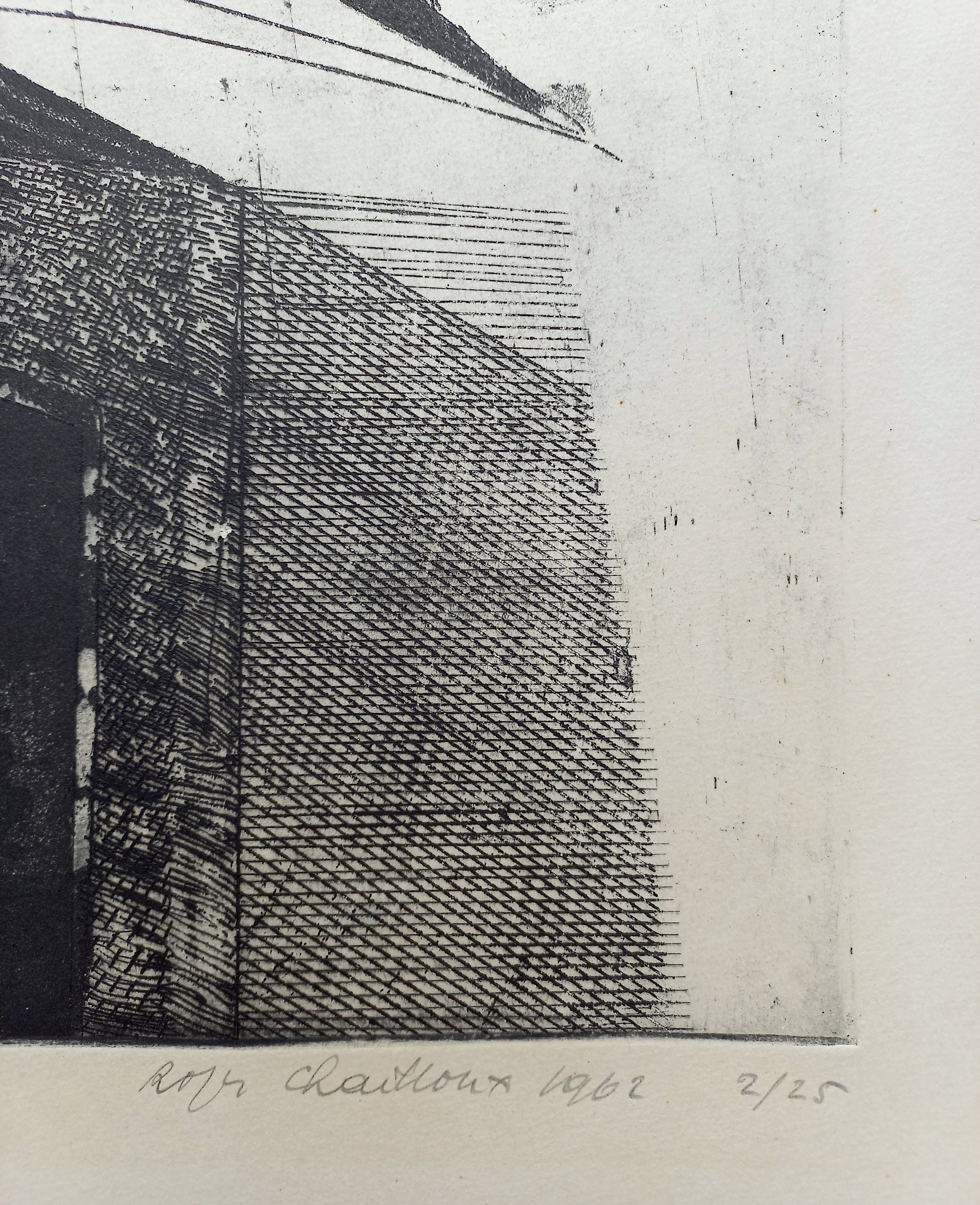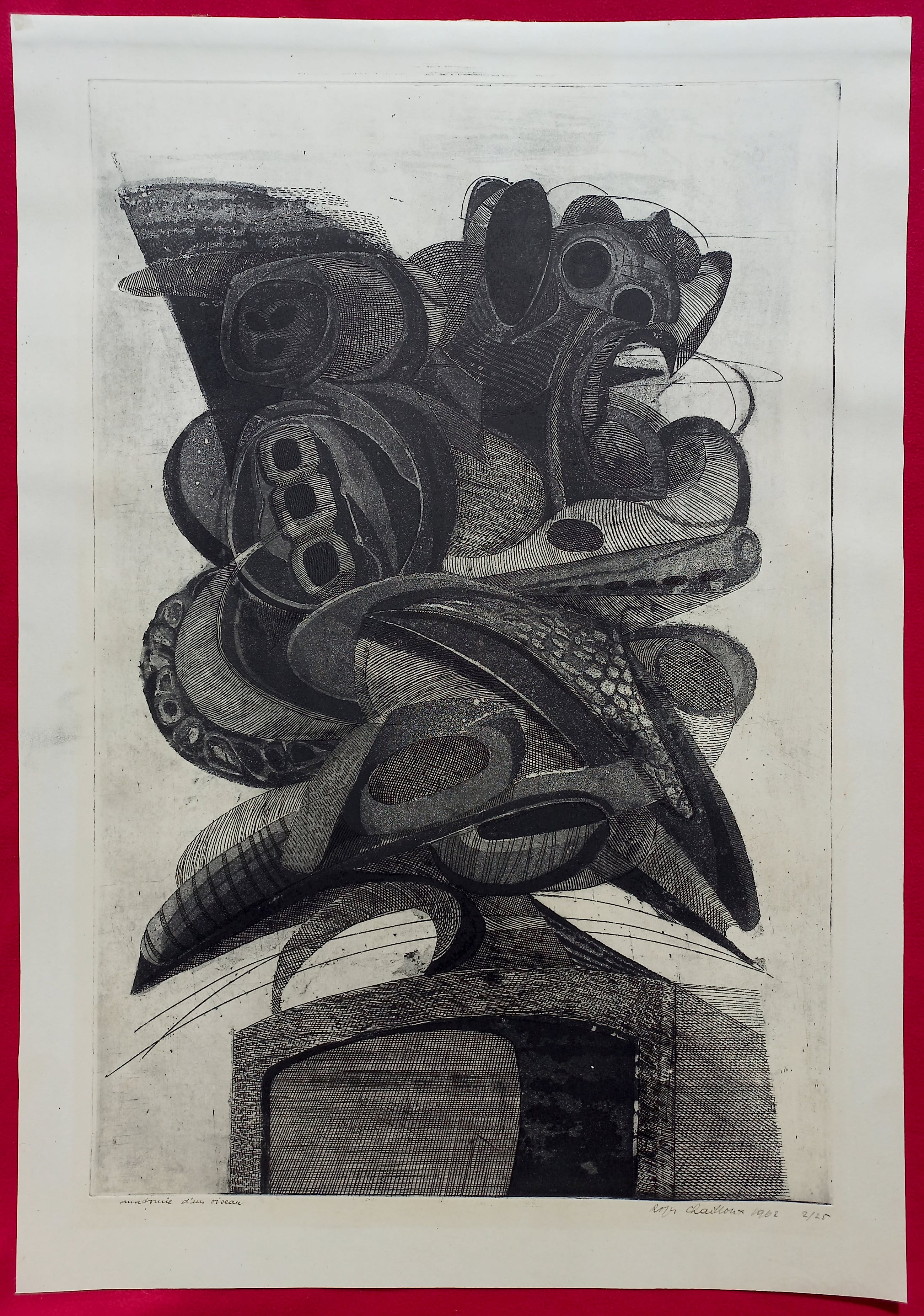 Zeer mooie compositie van Roger Chailloux uit 1962. Aquatint ets op geschept papier, met potlood gesigneerd, getiteld, gedateerd (1965) en genummerd (2/25). In goede conditie.