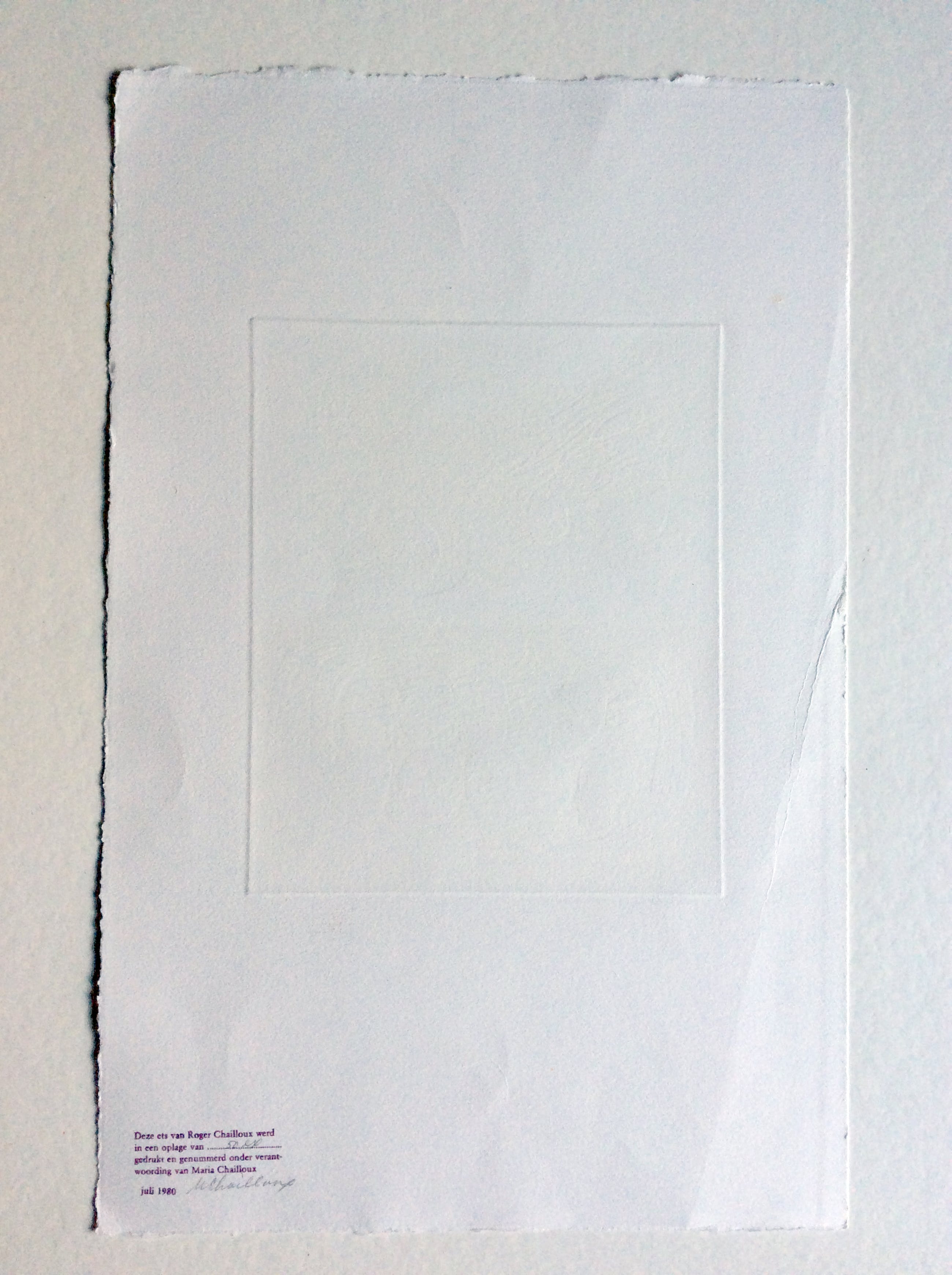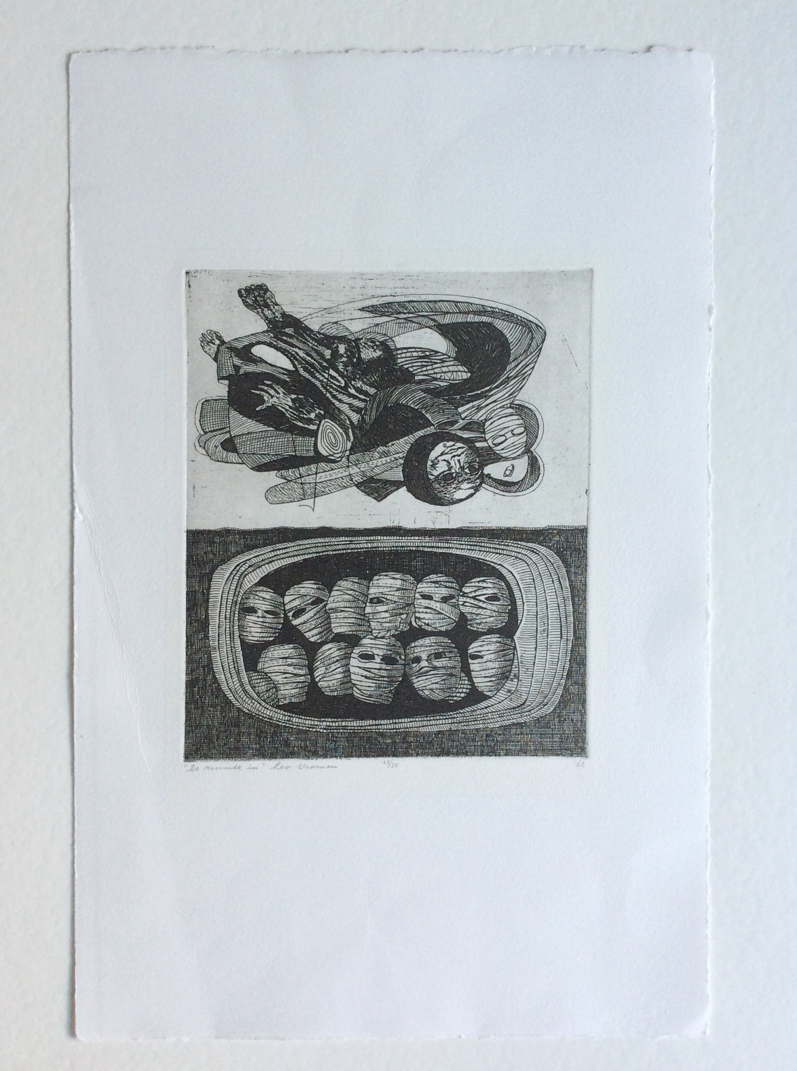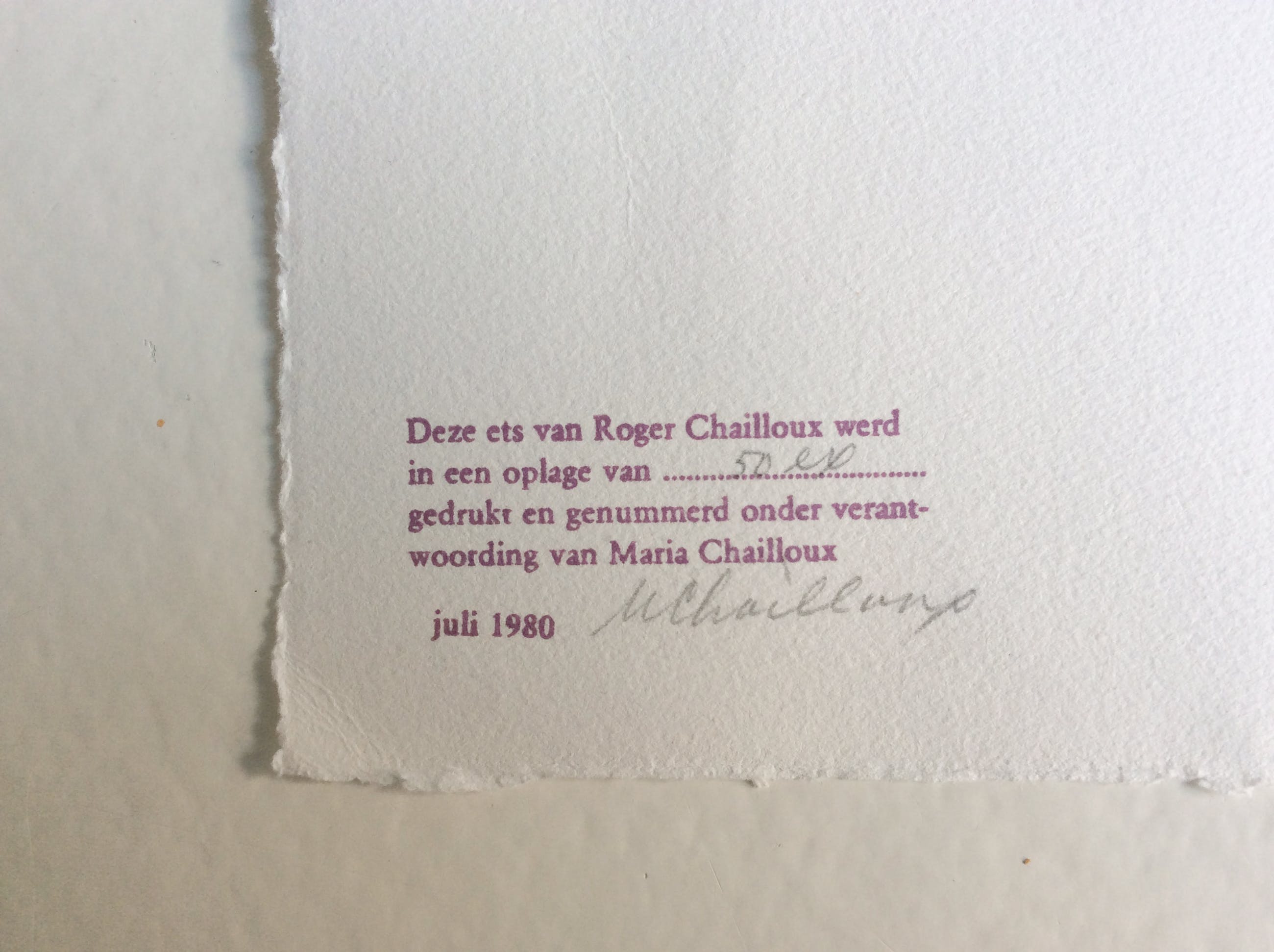 Ets van Roger Chailloux, naar een gedicht van Leo Vroman uit 1962: 'De ruimte in'. Formaat geschept papier 51 x 33 cm, ets grootte 25 x 20 cm. Getiteld onderin met potlood: 'De ruimte in' Leo Vroman - oplage 33/50 - '62. Achterop verantwoording met stempel en potlood door Maria Chailloux, juli 1980. (lichte vouw buiten beeld).