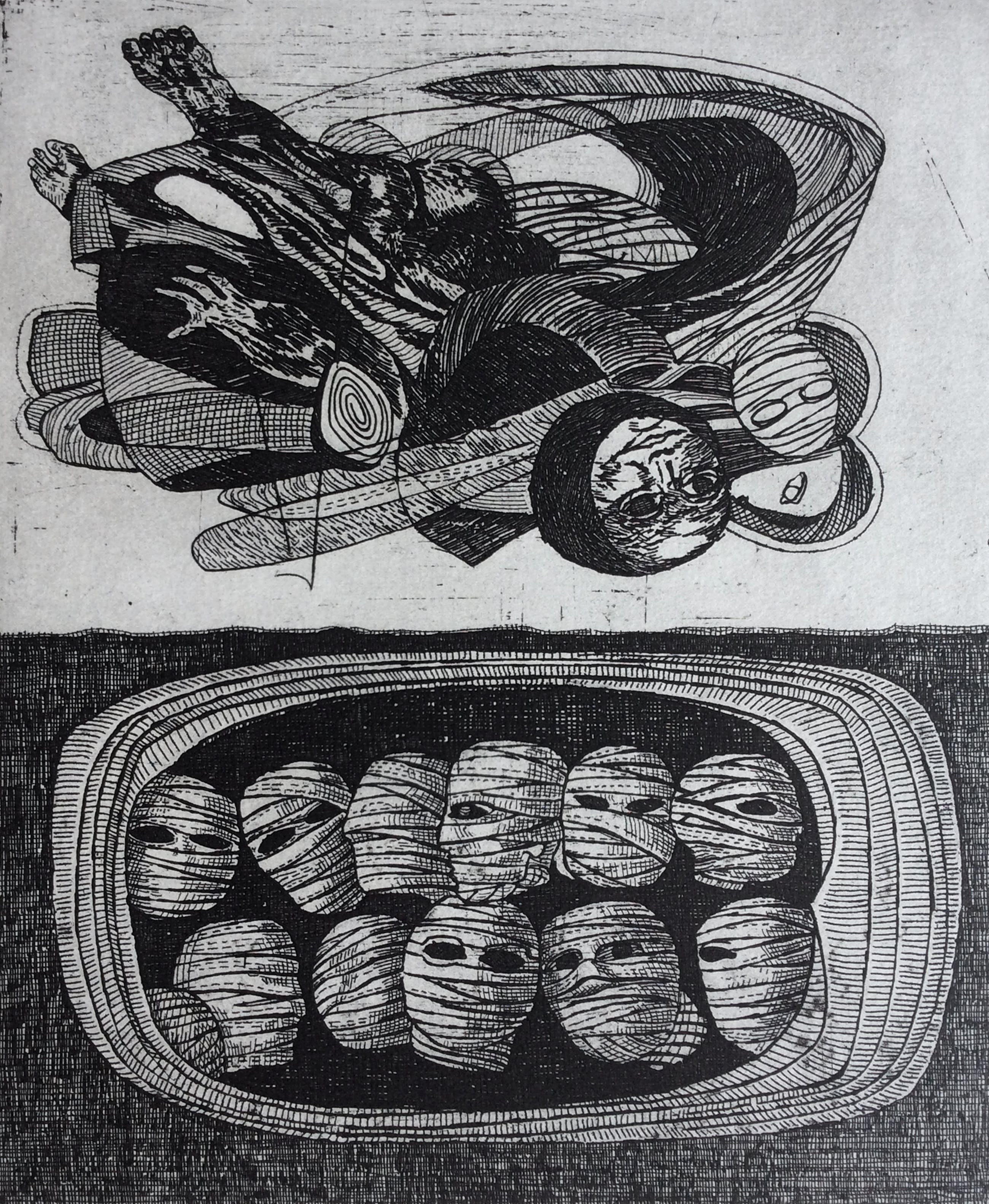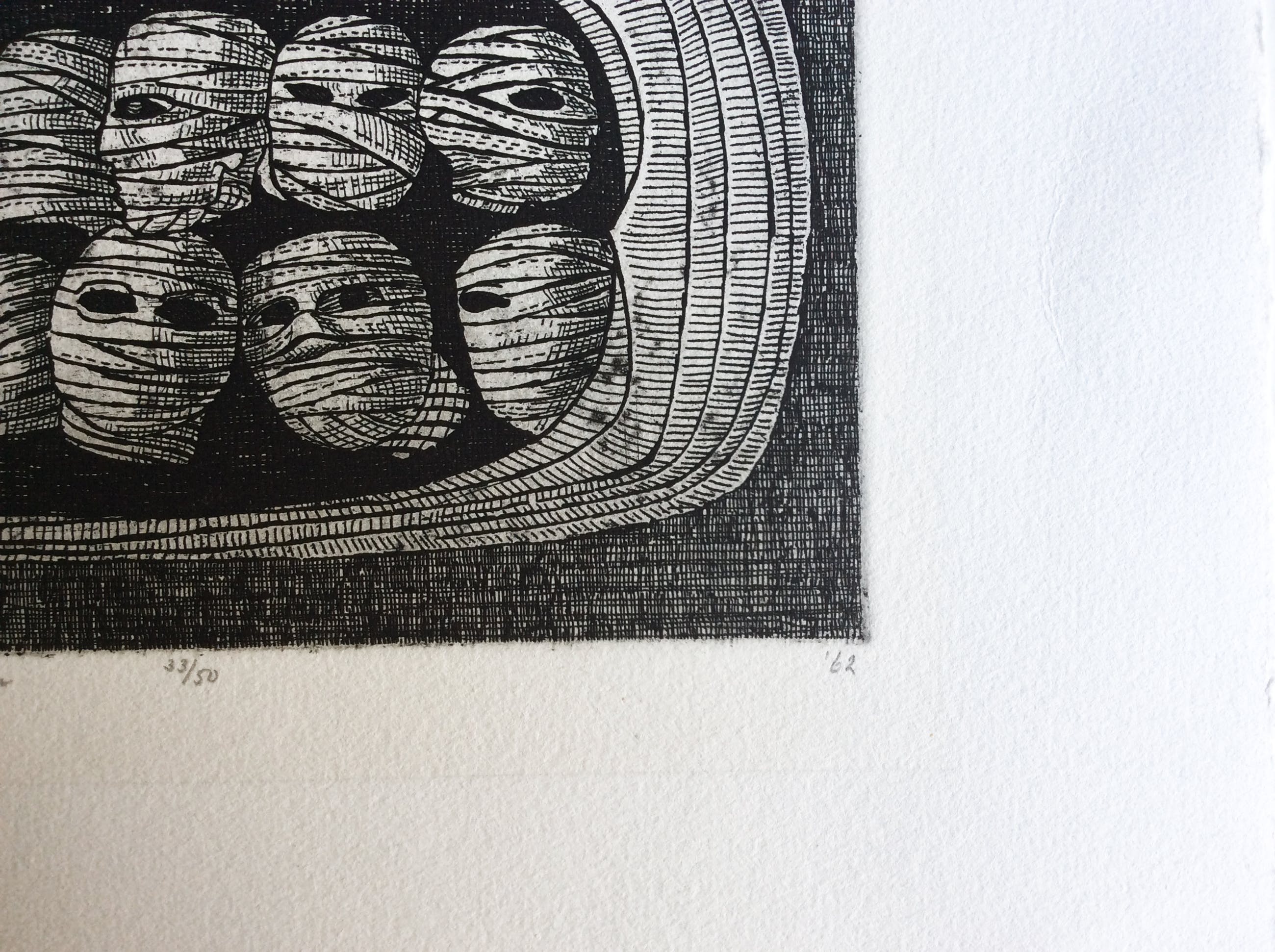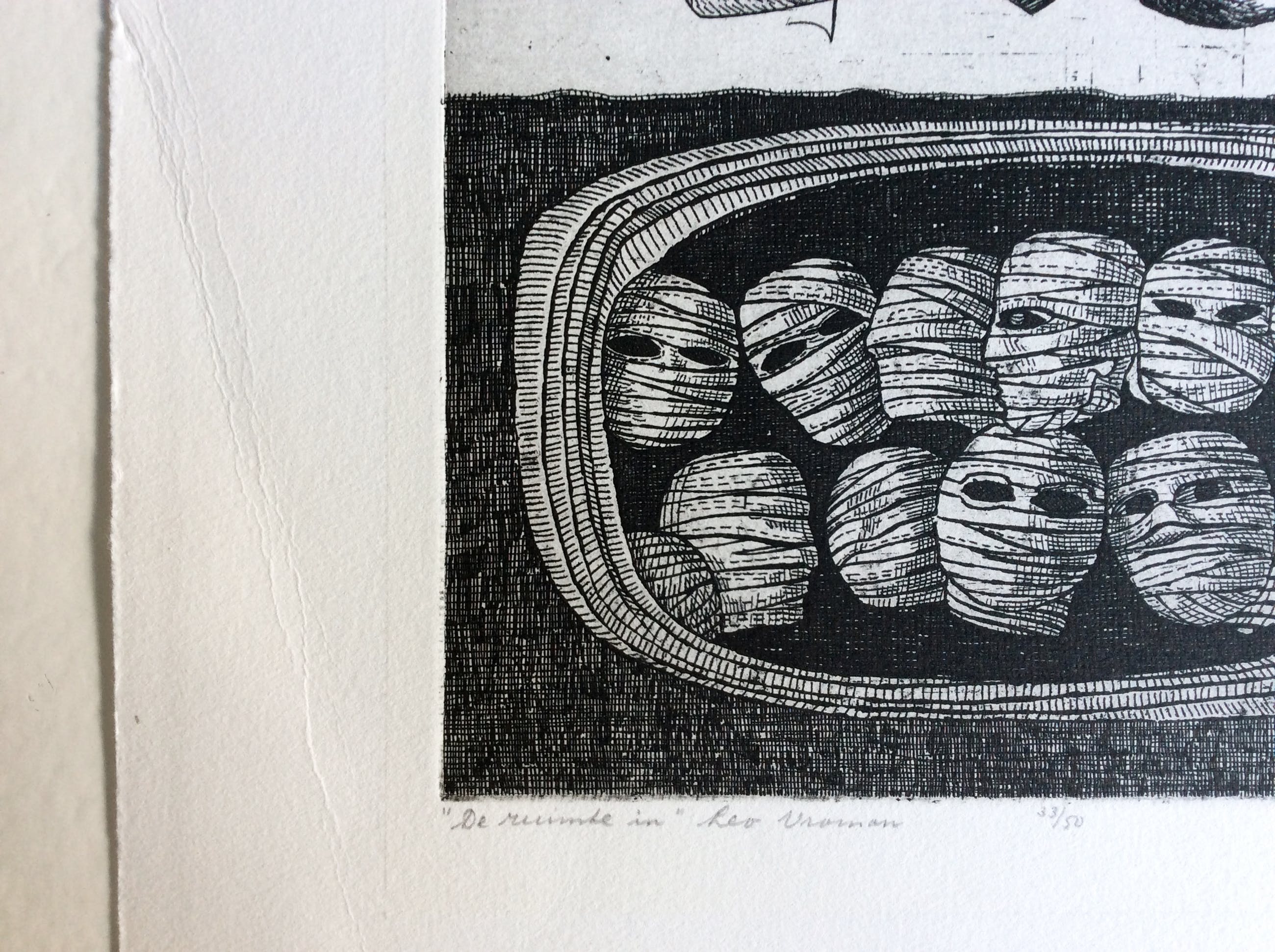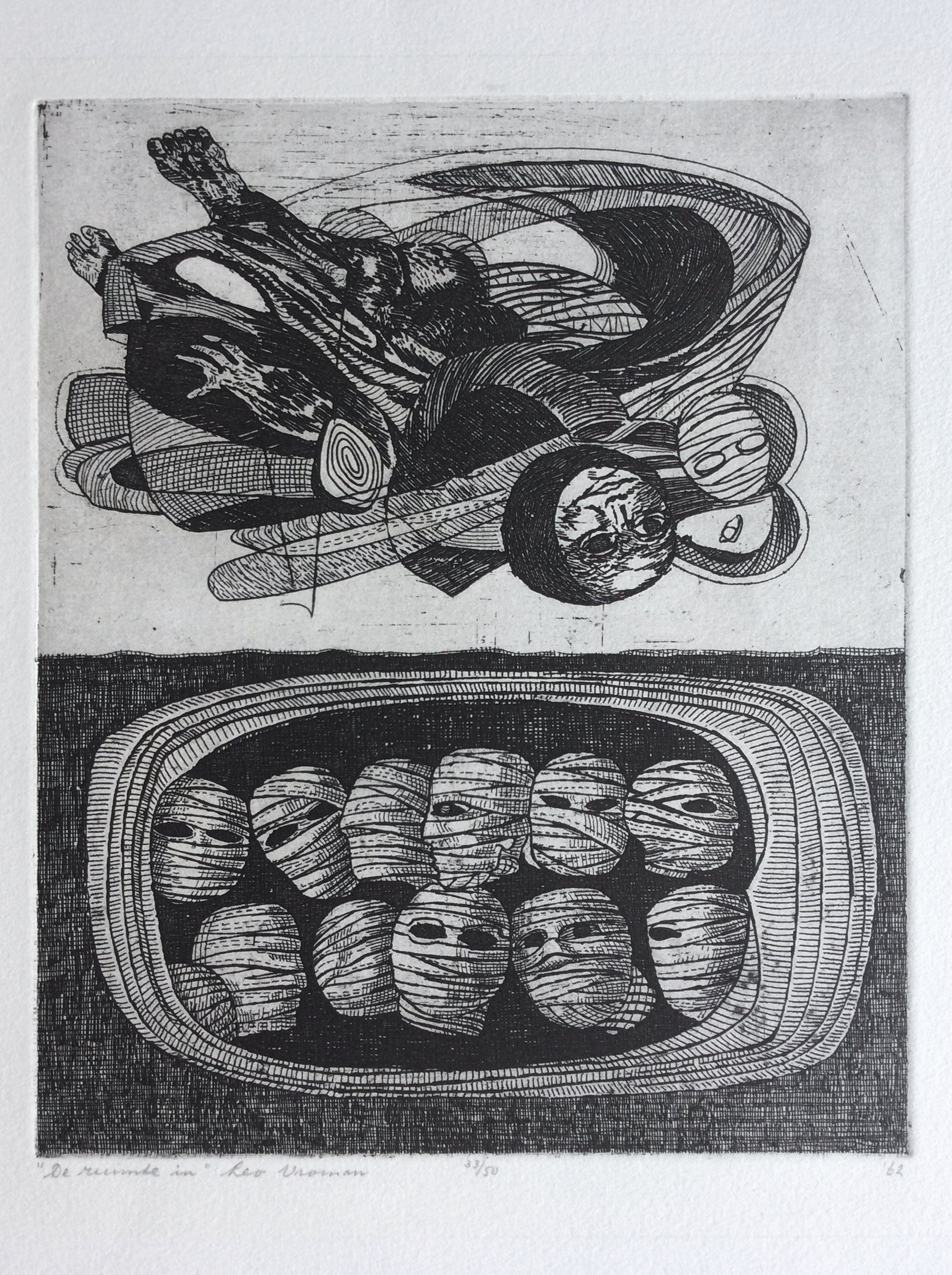 Ets van Roger Chailloux, naar een gedicht van Leo Vroman uit 1962: 'De ruimte in'. Formaat geschept papier 51 x 33 cm, ets grootte 25 x 20 cm. Getiteld onderin met potlood: 'De ruimte in' Leo Vroman - oplage 33/50 - '62. Achterop verantwoording met stempel en potlood door Maria Chailloux, juli 1980. (lichte vouw buiten beeld).