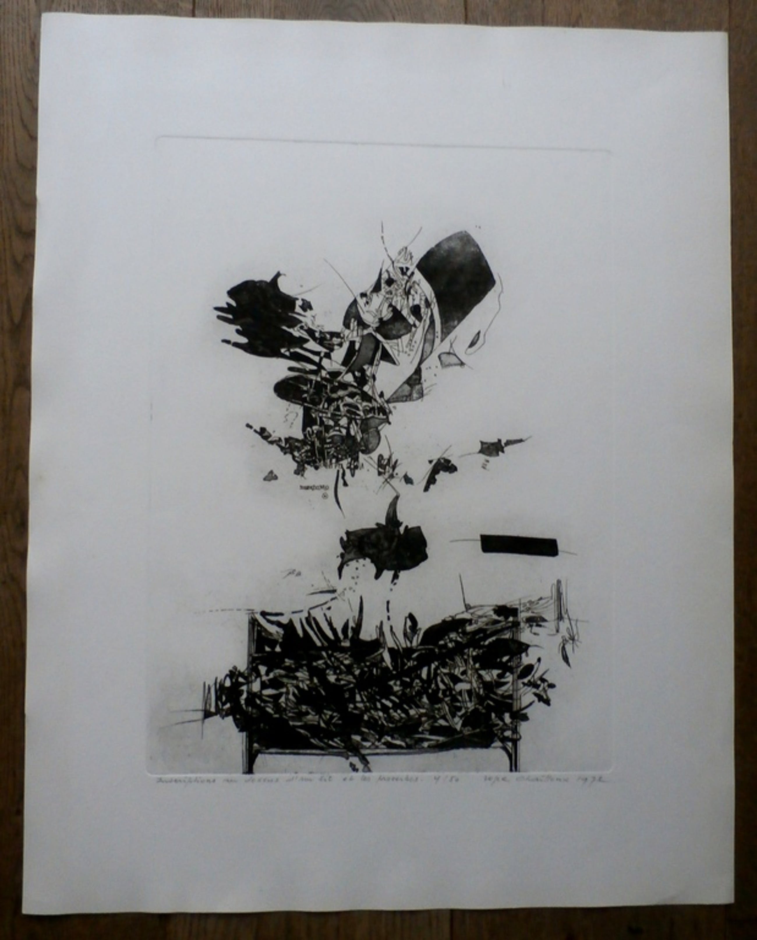 Mooie ets van Roger Chailloux uit 1972. Titel: Inverittions au dessus d'un lit et les proverbes. Nummer: 4/50. Afmetingen blad: H69,5 x b56 cm. Afmetingen voorstelling: H49,5 x b36,5 cm. De authenciteit van dit werk wordt voor 100% gegarandeerd.