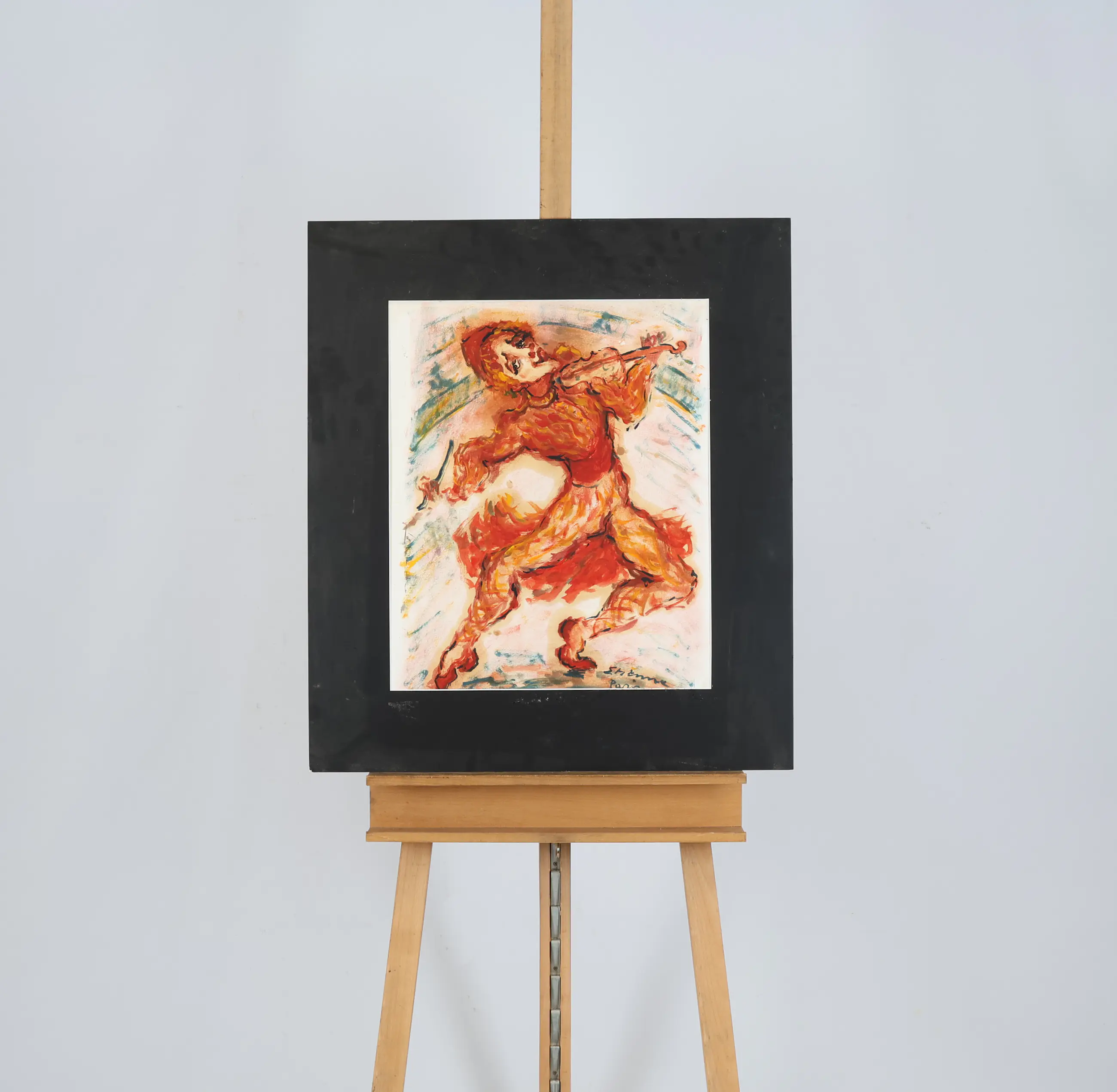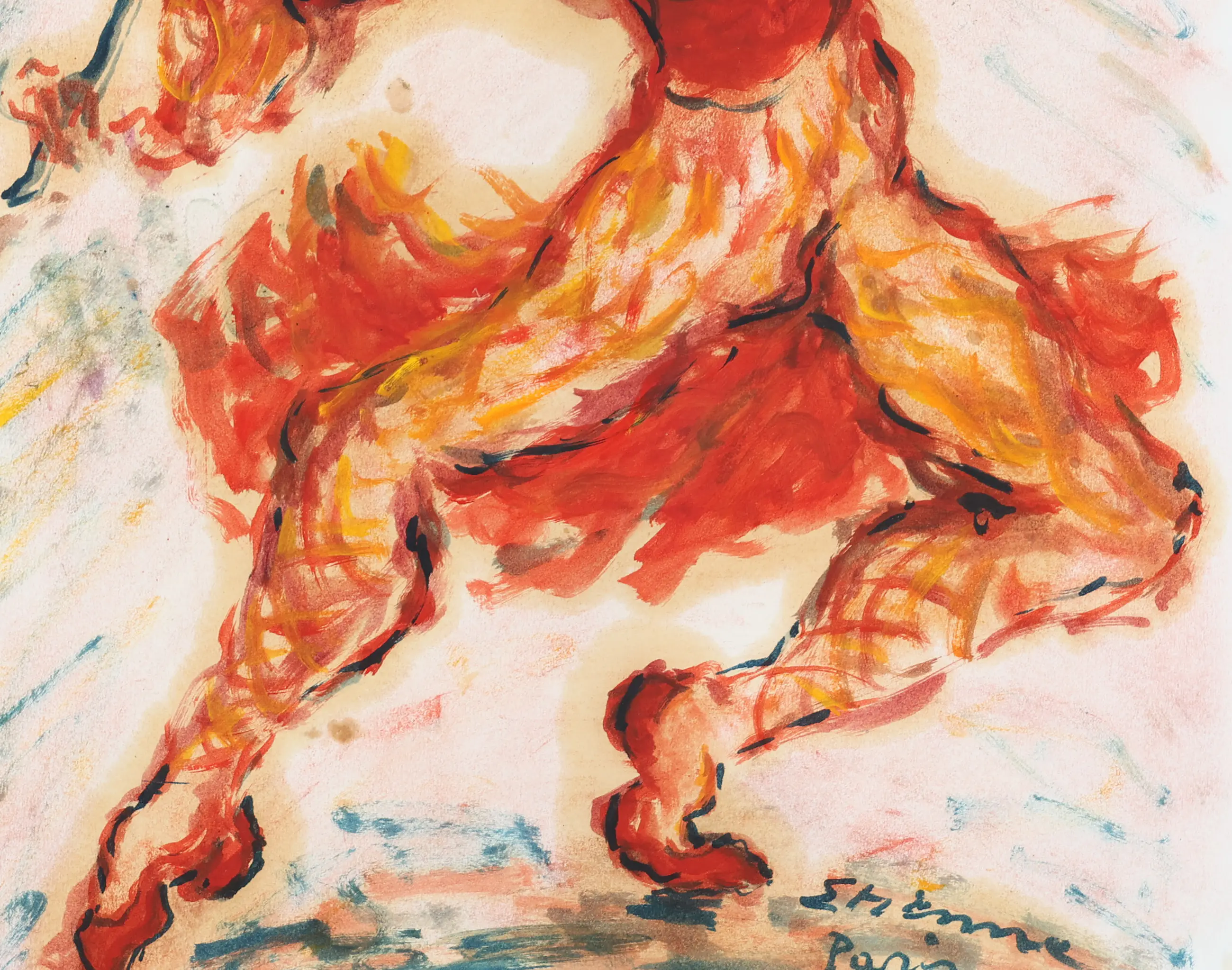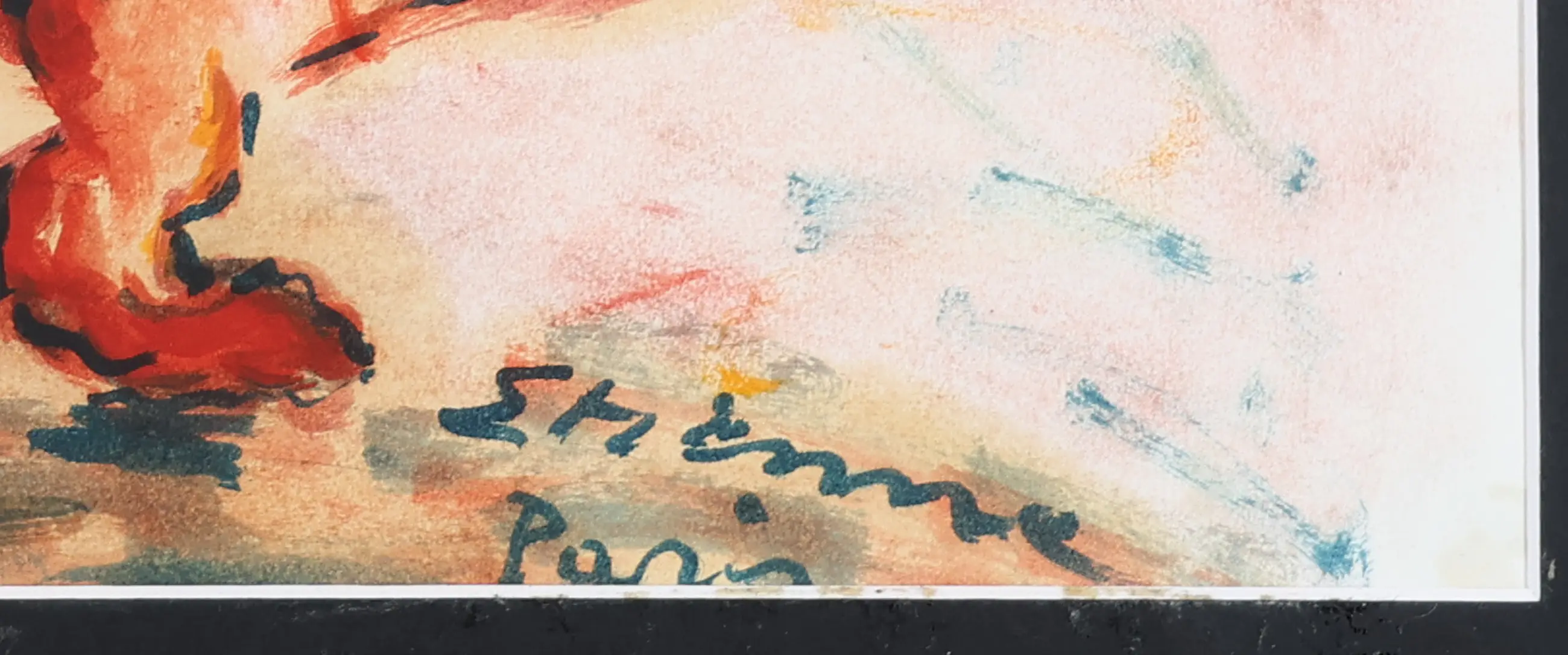 Dit werk is gemaakt met vetkrijt en wordt ook wel wasco genoemd. Het werk is van de kunstenaar Roger Etienne (1922-2011) en is door hem linksonder gesigneerd.'