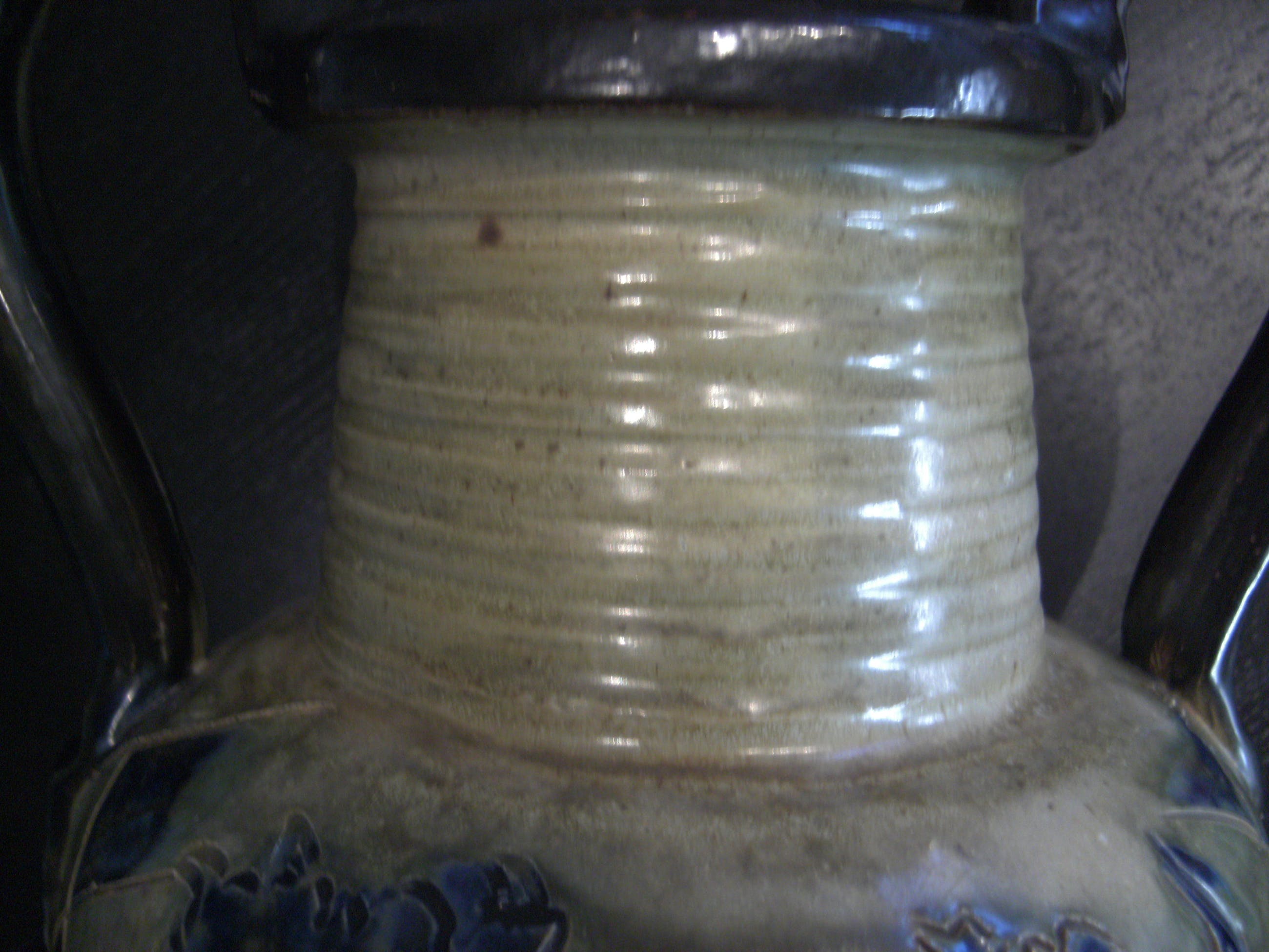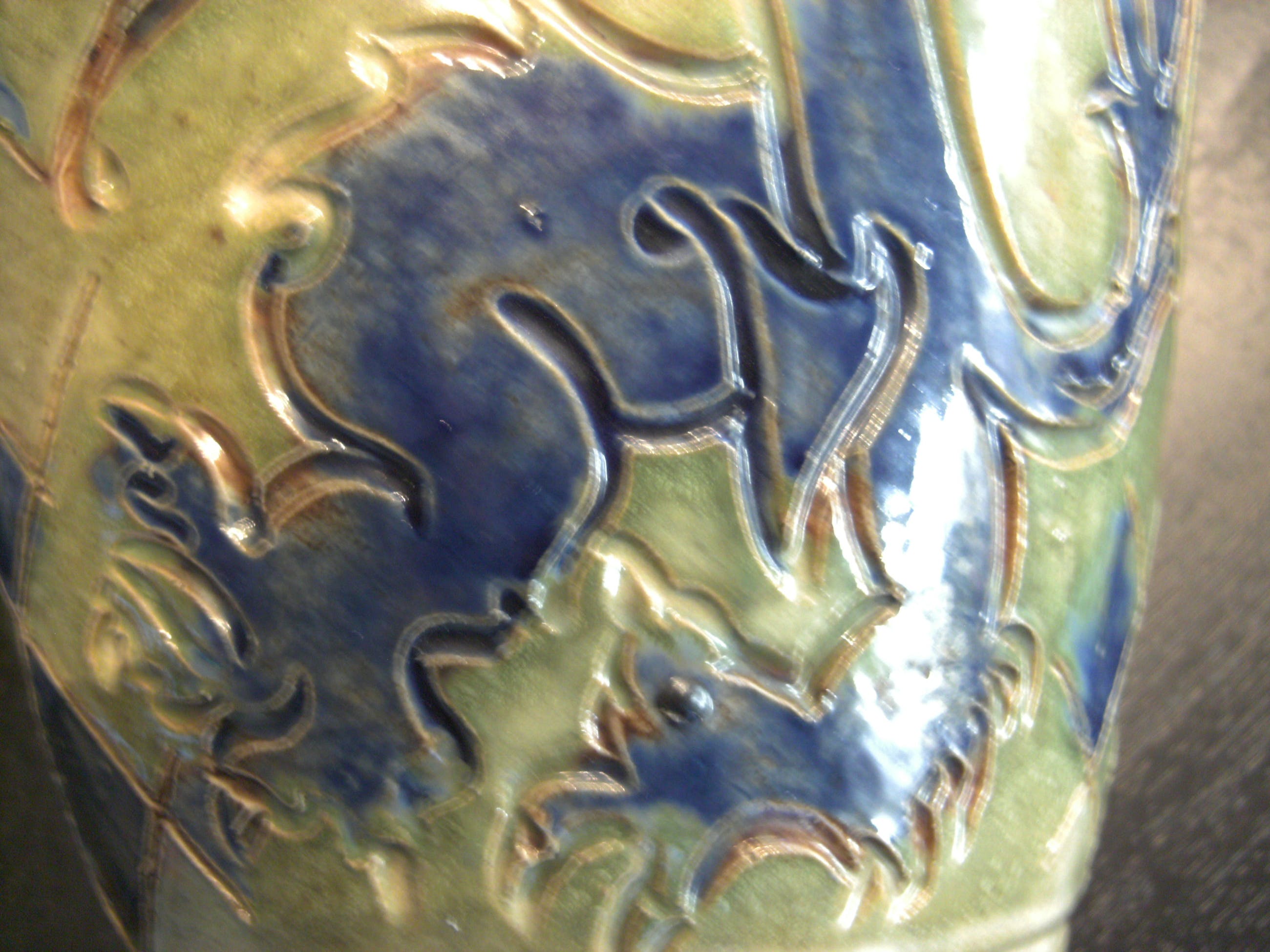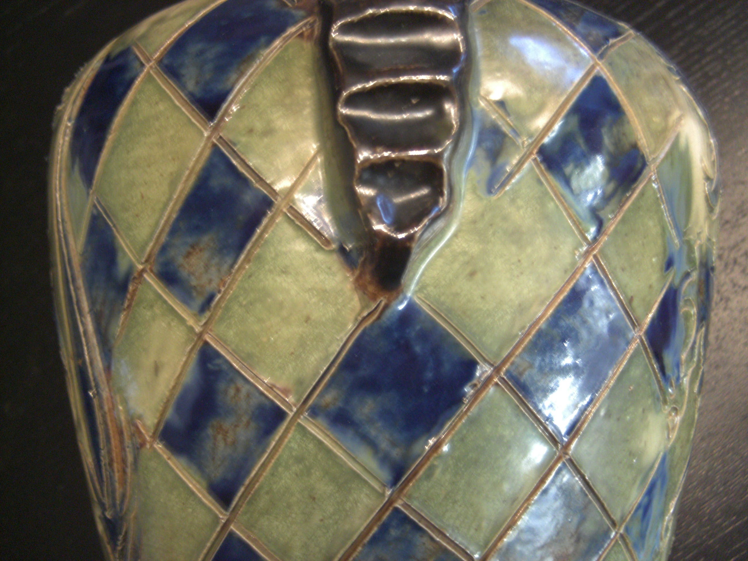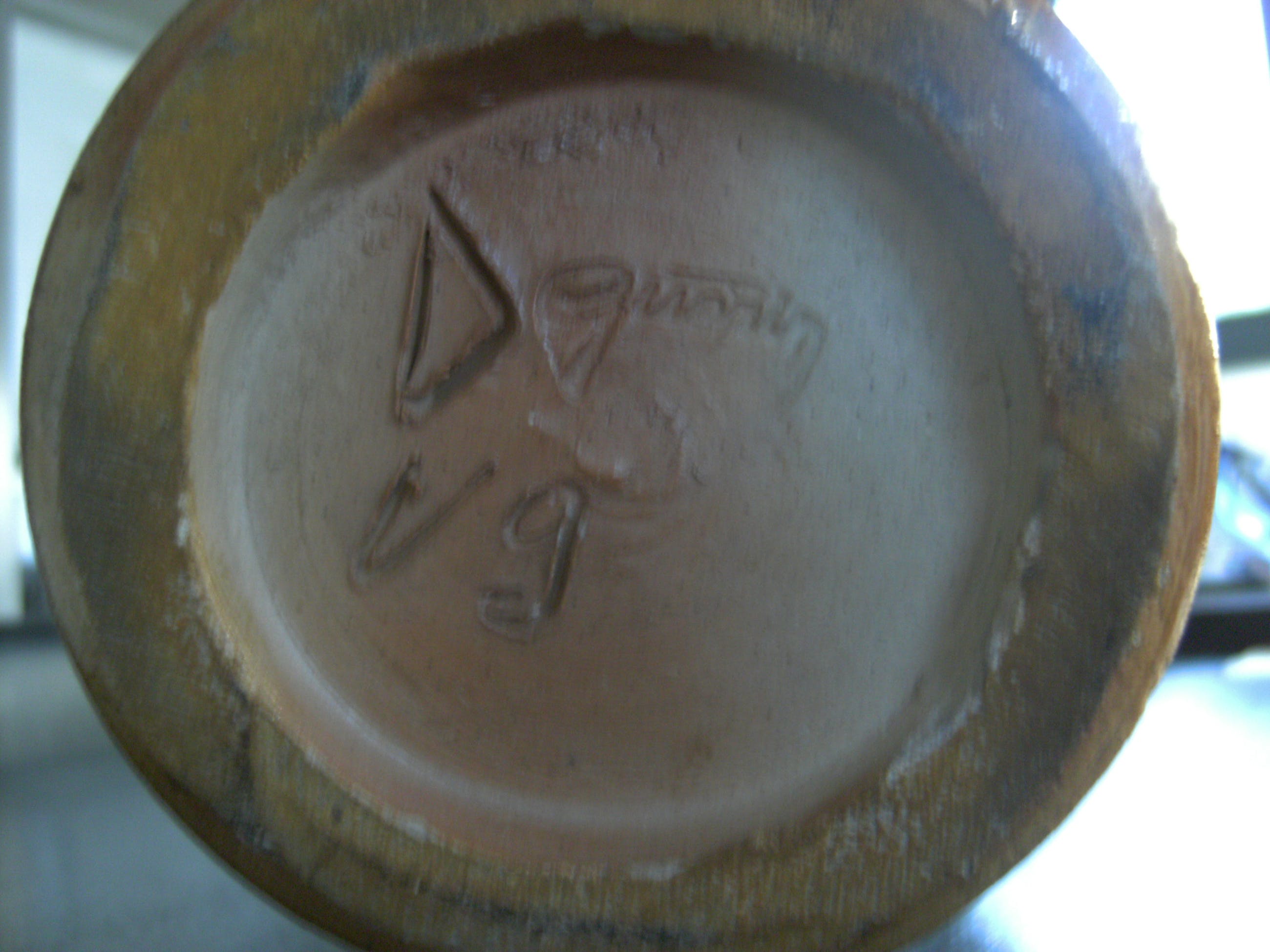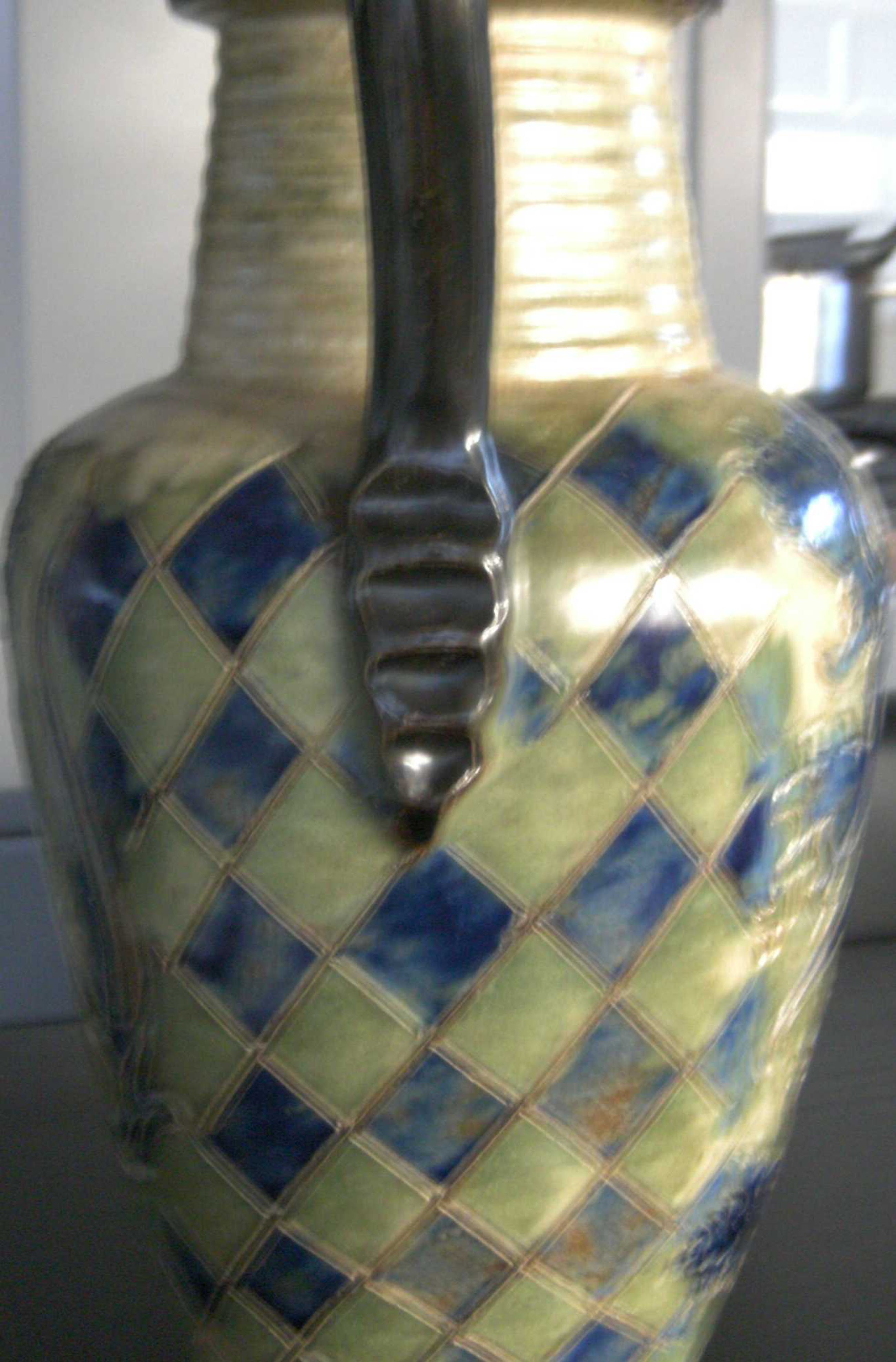 Zeer prachtige vaas/kruik twee oren van Roger Guerin.(1896-1954) Onderaan gemerkt Guerin. Op twee kanten afbeelding leeuw met kroon,met klauwen en staart. Tekening in reliëf,twee zijkanten ruitvormig patroon lichtgroen/blauw.(Zie foto's)