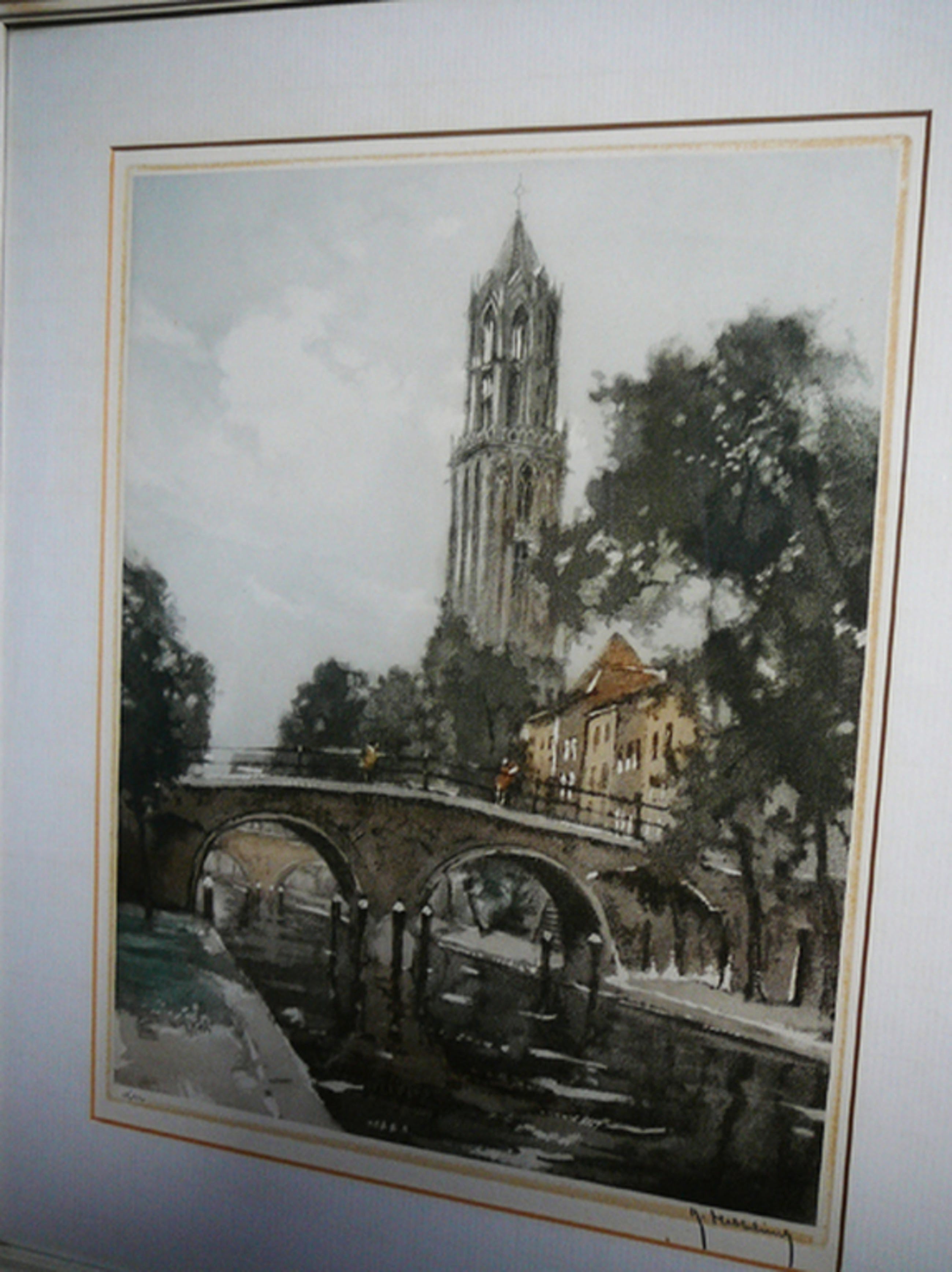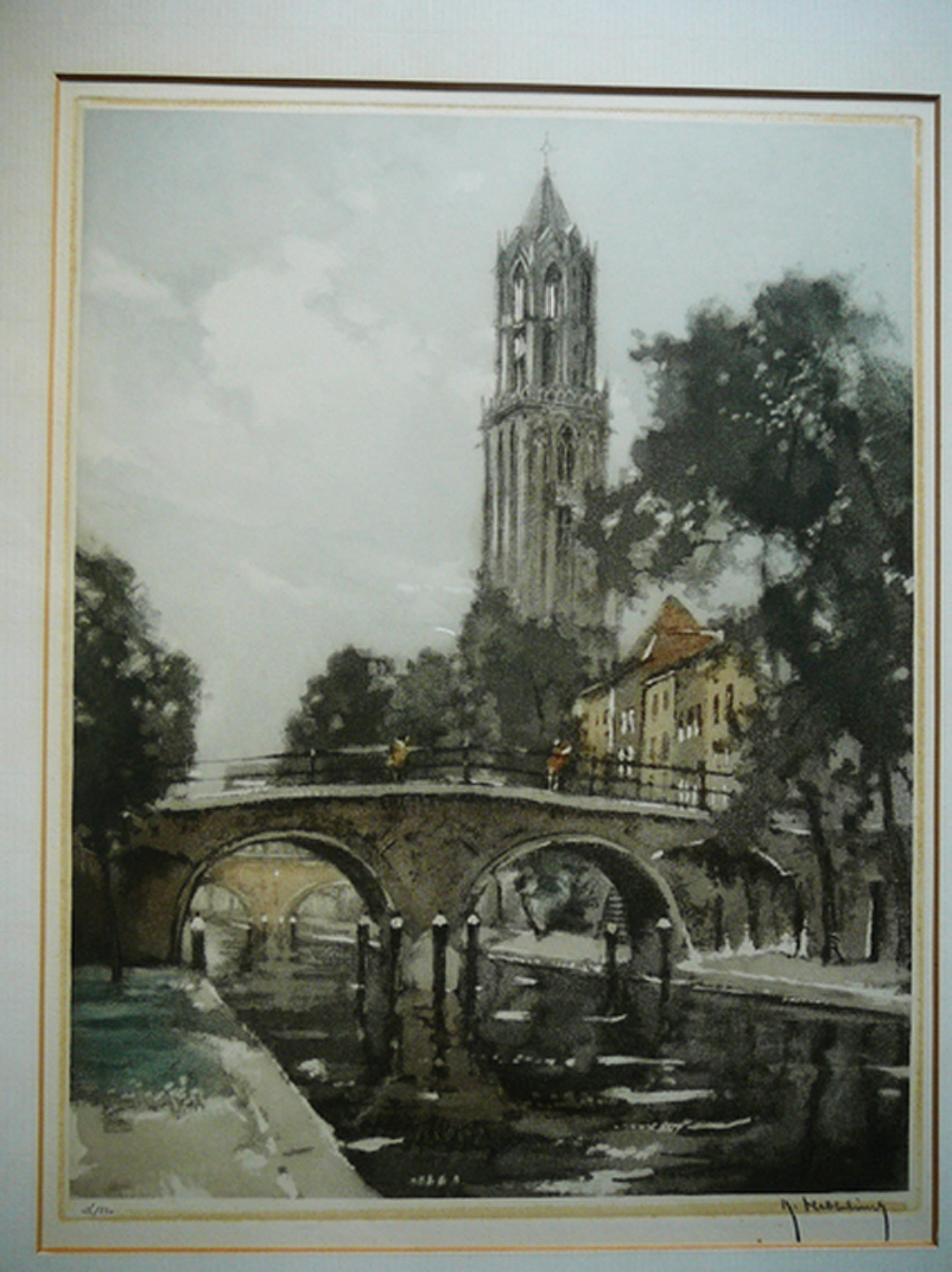 Mooie kleurenets van de Belgische kunstenaar Roger Hebbelinck met zicht op de Utrechtse Oude Gracht, linksonder met potlood genummerd en rechtsonder gesigneerd.