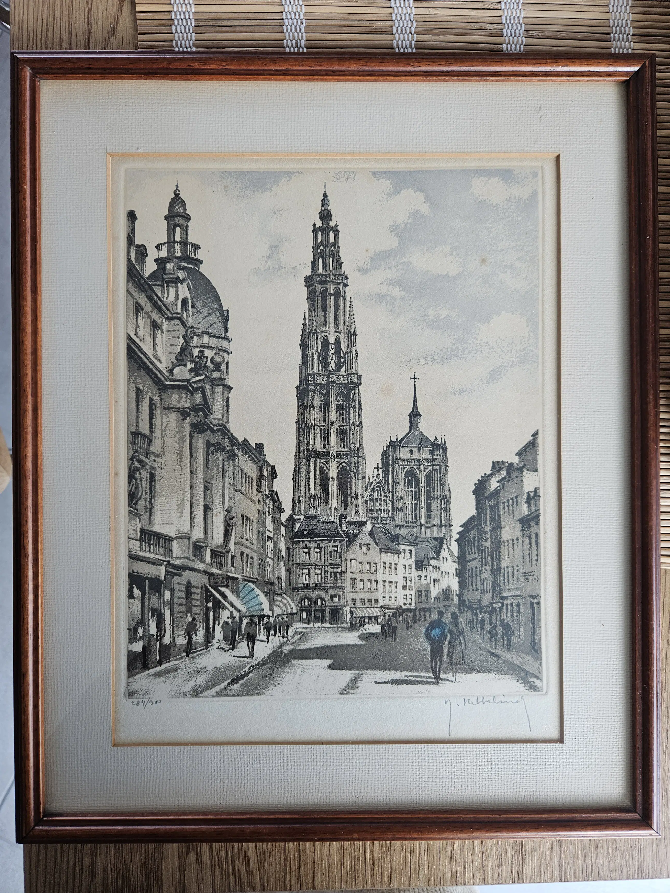Sfeerbeeld Suikerrui in Antwerpen, zicht op Onze-Lieve-Vrouwekathedraal. Gesigneerd