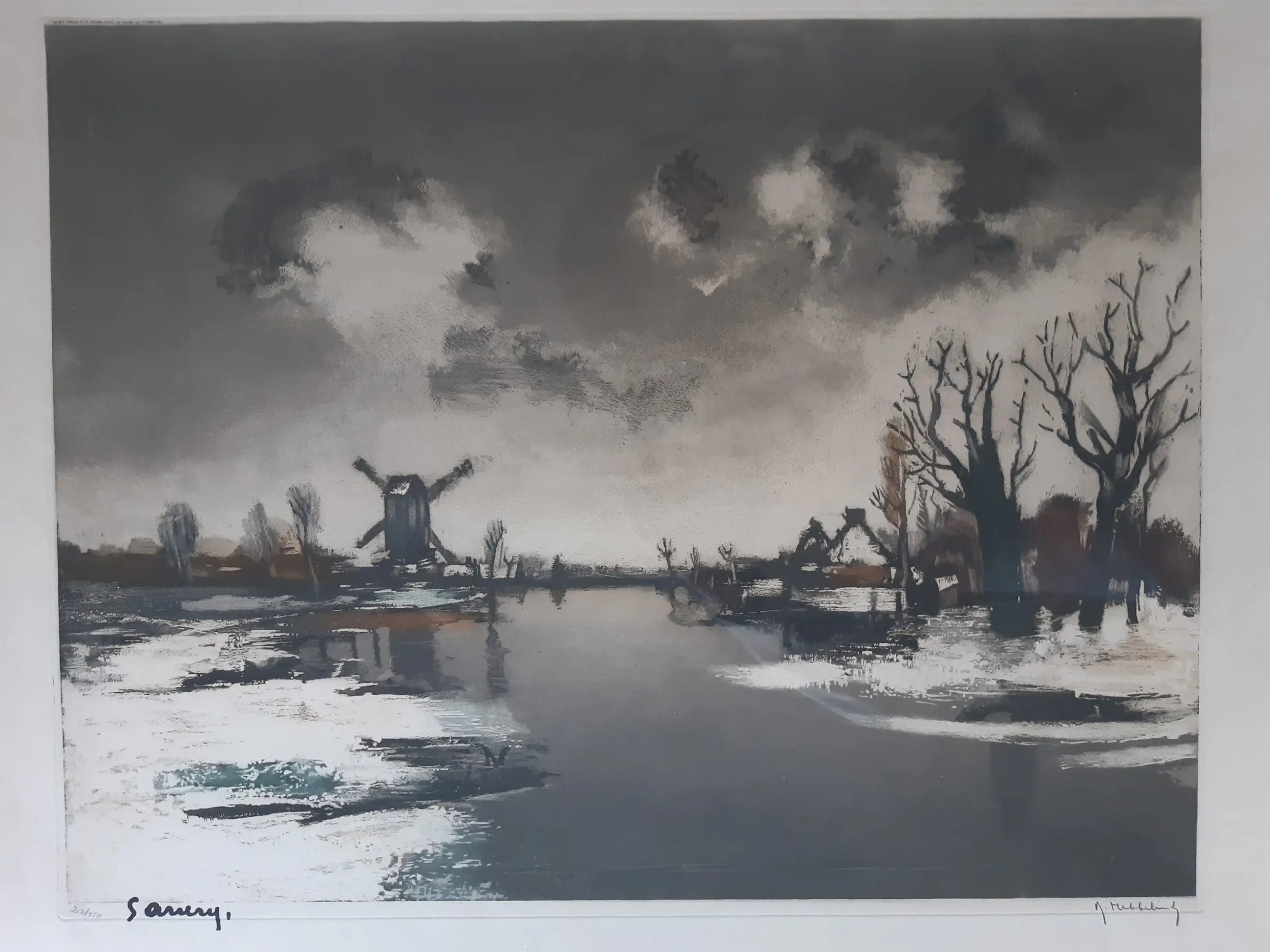 Mooie, grote, ingelijste kleuren lithografie van Roger Hebbelinck. Naar een schilderij van Albert Saverys. Rechtsonder gesigneerd. Nummer 202 van 350.