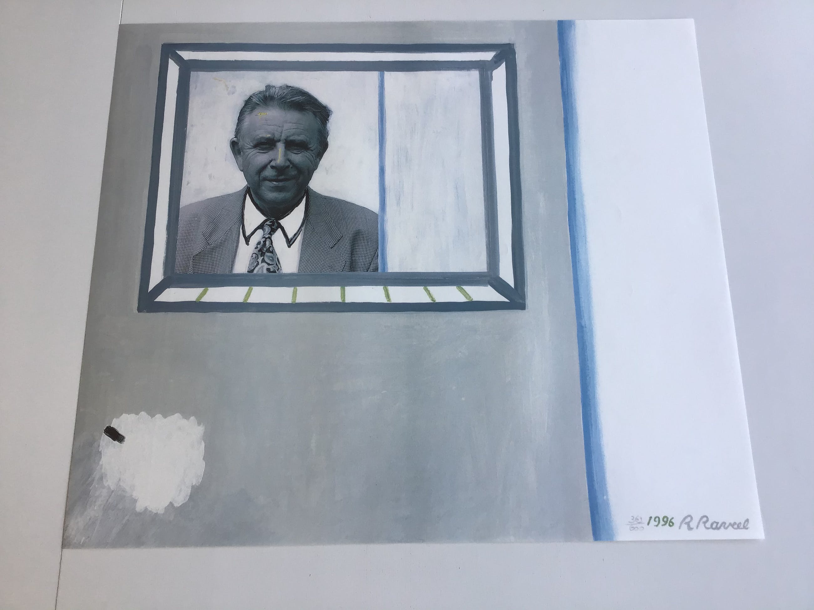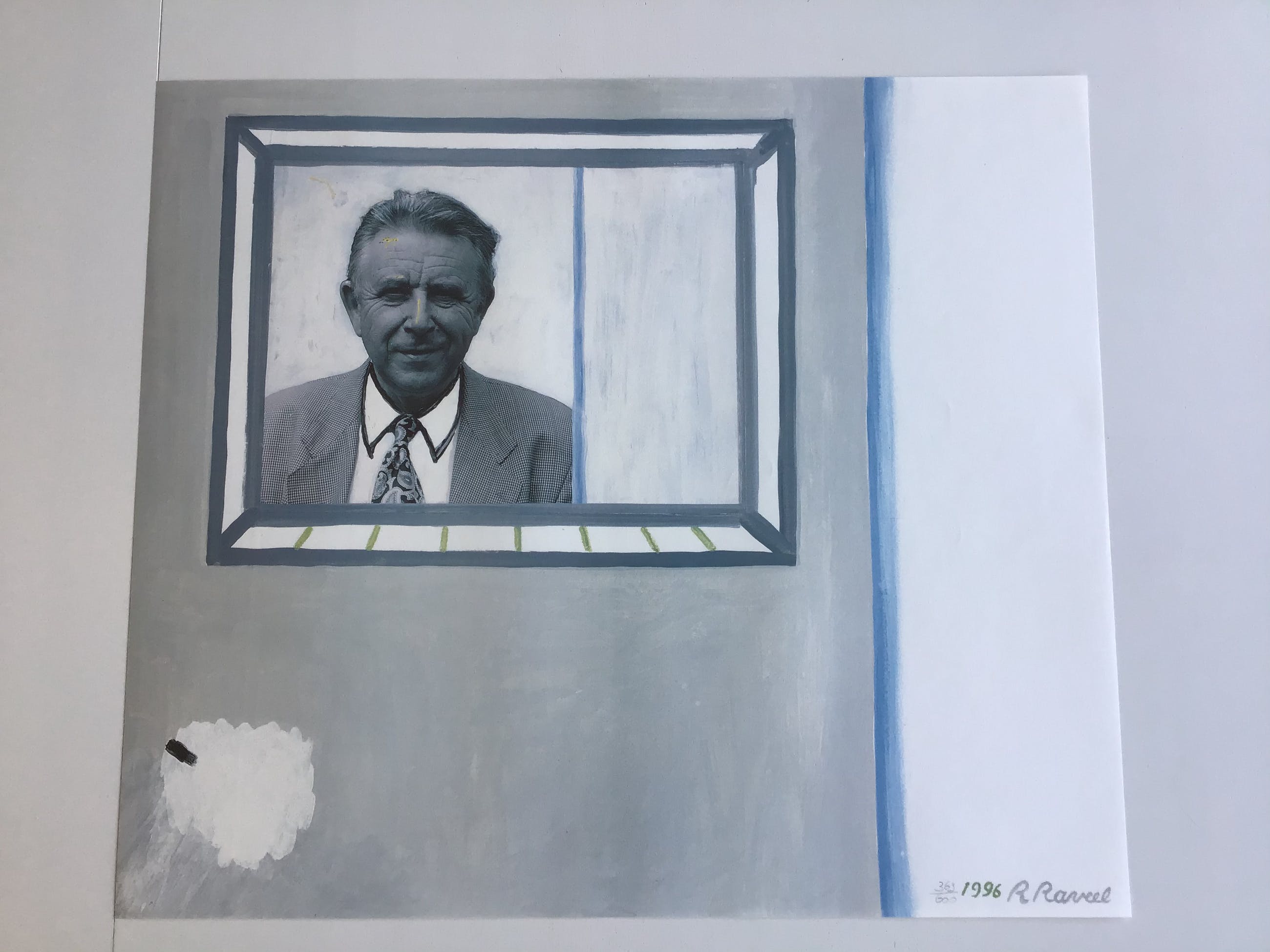 Een kleurenlitho van roger raveel. Het betreft een genummerde oplage van 600 exemplaren met het portret van georges peirs. Hij was burgemeester van de gemeente zulte van 1970 tot 2006. Deze editie werd uitgegeven naar aanleiding van een jubileum.
