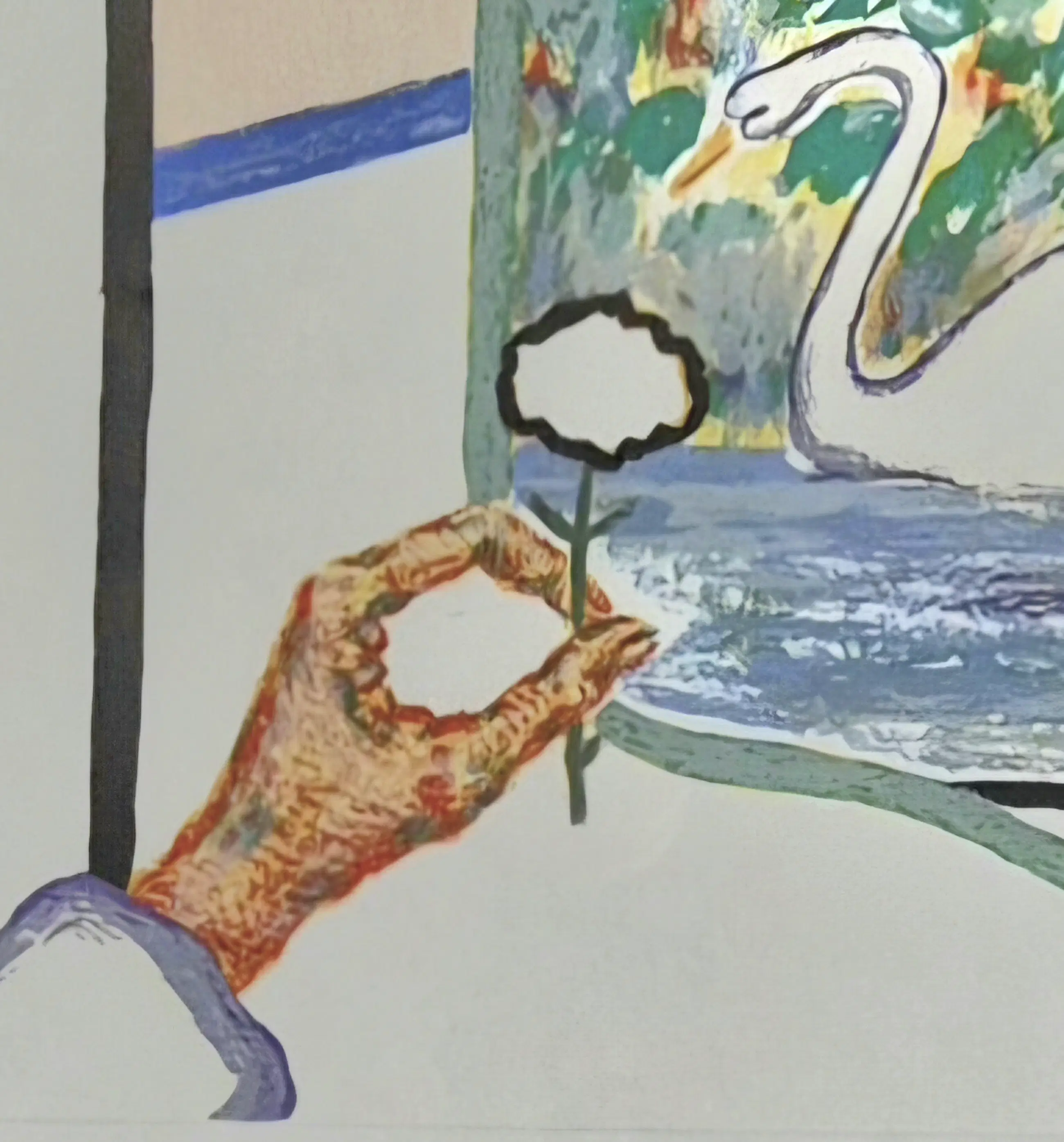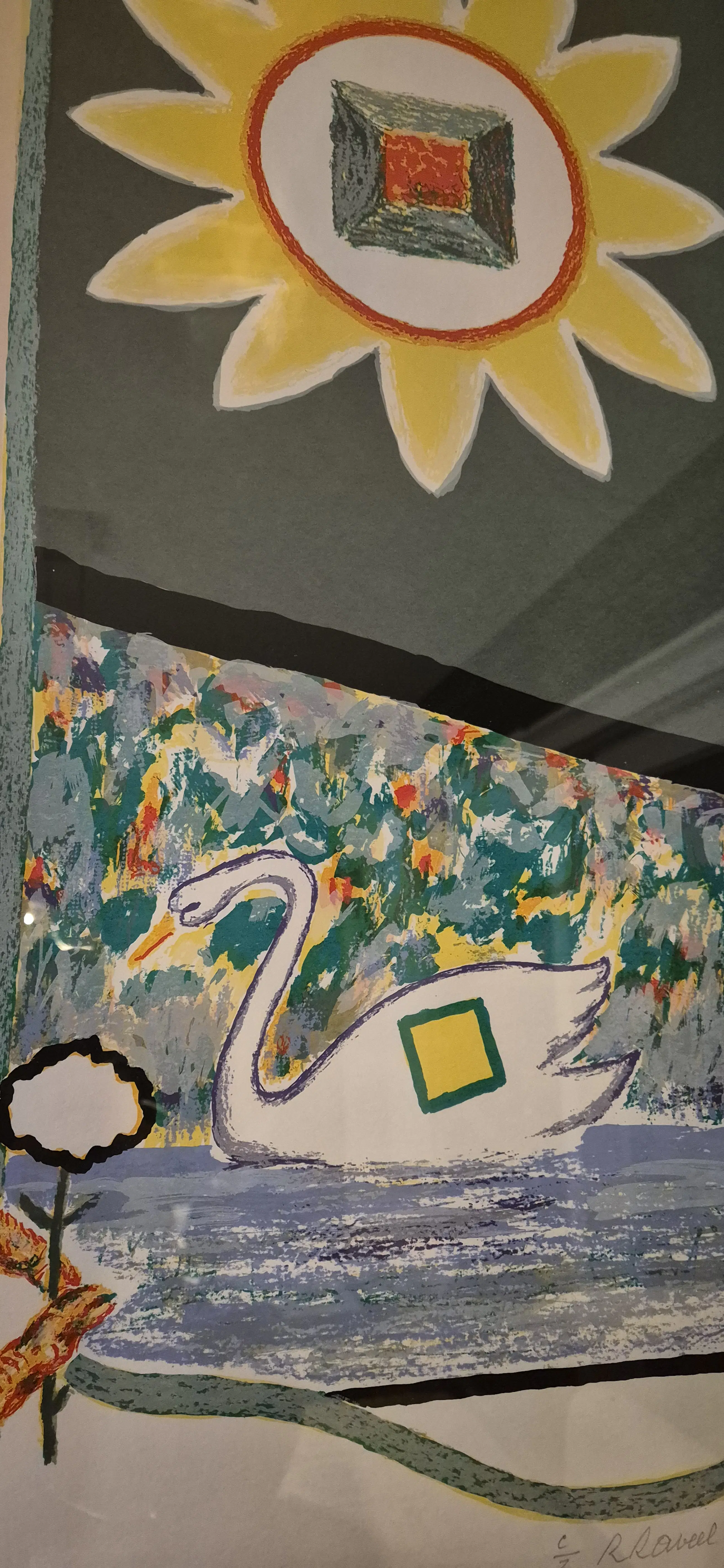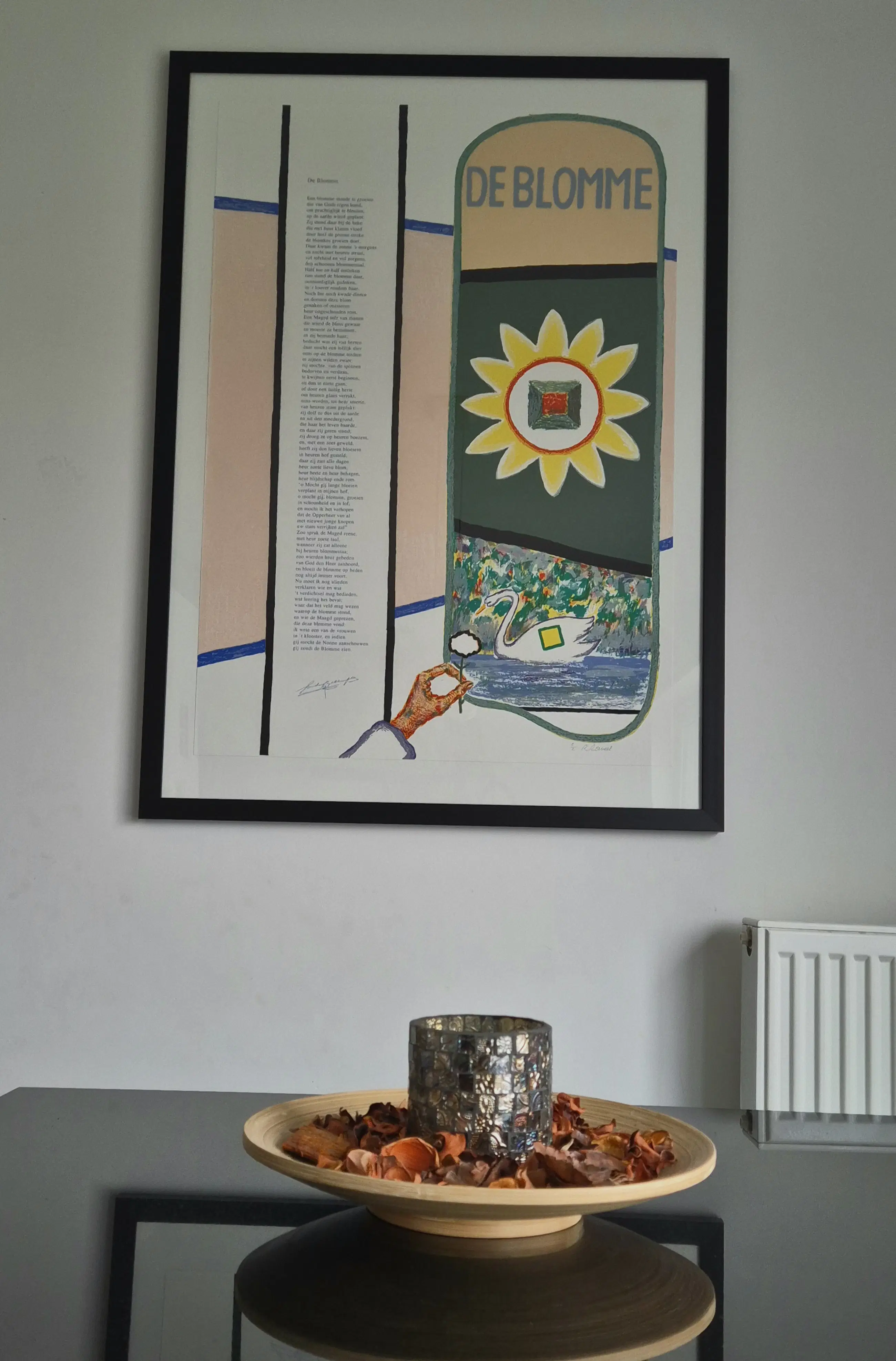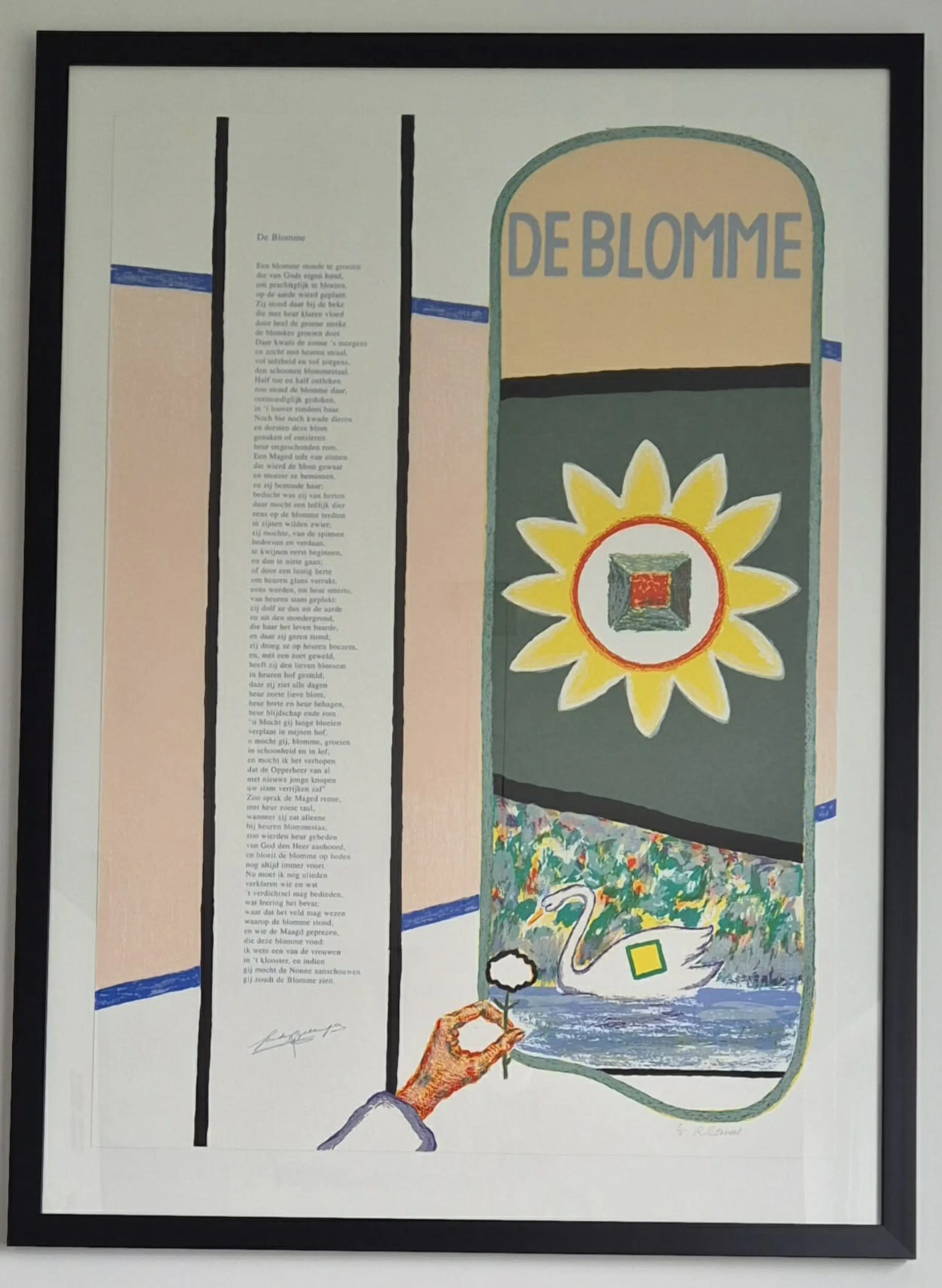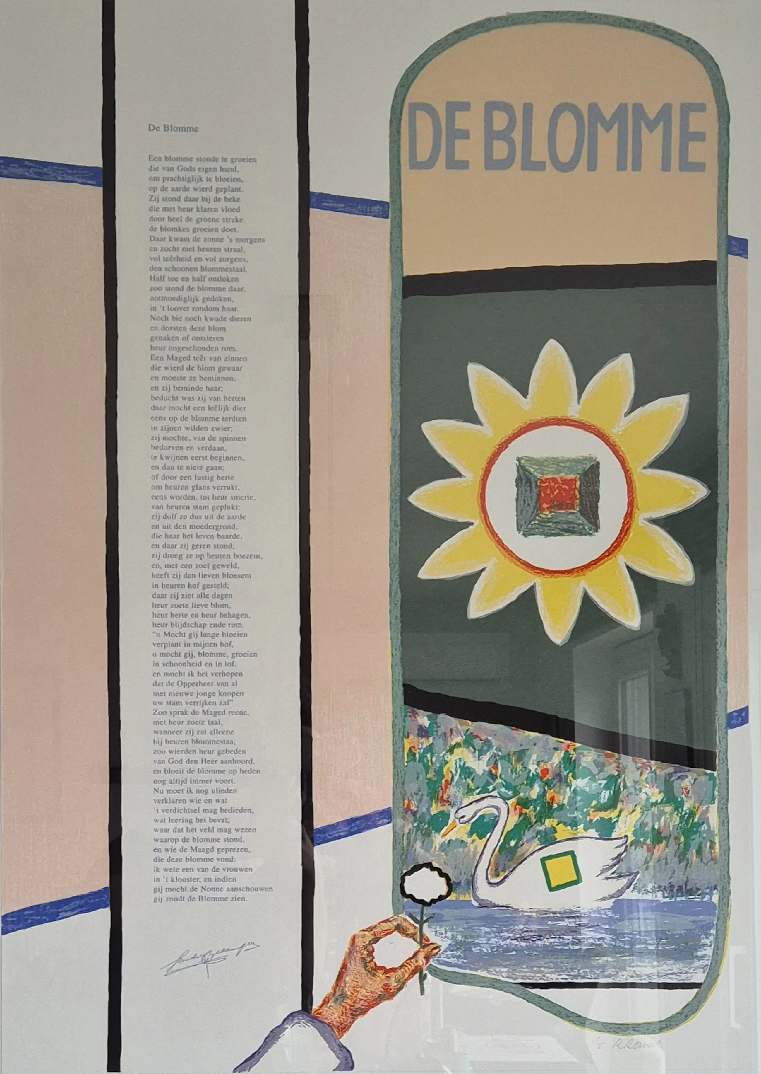 Een meesterlijke dialoog tussen kunst en poëzie. Haal een uniek stuk Belgische kunstgeschiedenis in huis met deze monumentale kleurenzeefdruk. In "De Blomme" komen de meest herkenbare symbolen uit het oeuvre van Roger Raveel samen in een harmonieus en kleurrijk geheel. Iconische Beeldtaal: Het werk toont de klassieke Raveel-elementen: de gestileerde zwaan (verwijzend naar zijn actie in de Brugse reien), de getekende hand die een bloem reikt, en de zonovergoten "blomme" met het kenmerkende vierkante gat. Artistieke Samenwerking: Het kunstwerk bevat het volledige gedicht "De Blomme" wat het tot een uniek verzamelobject maakt waarin beeldende kunst en literatuur elkaar versterken.