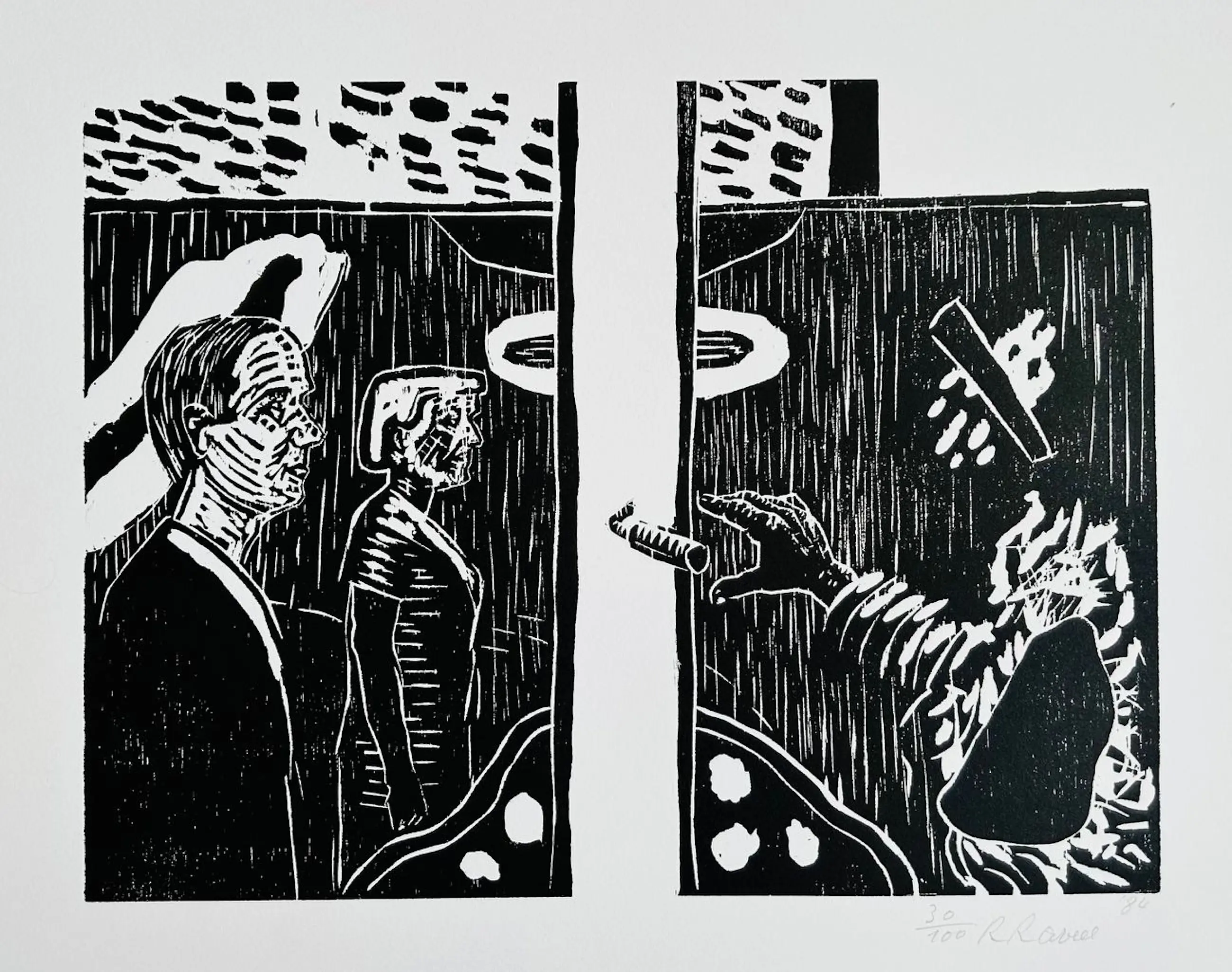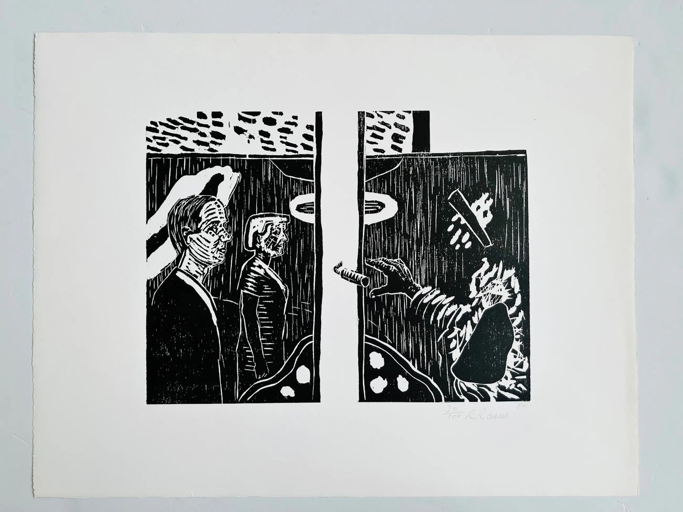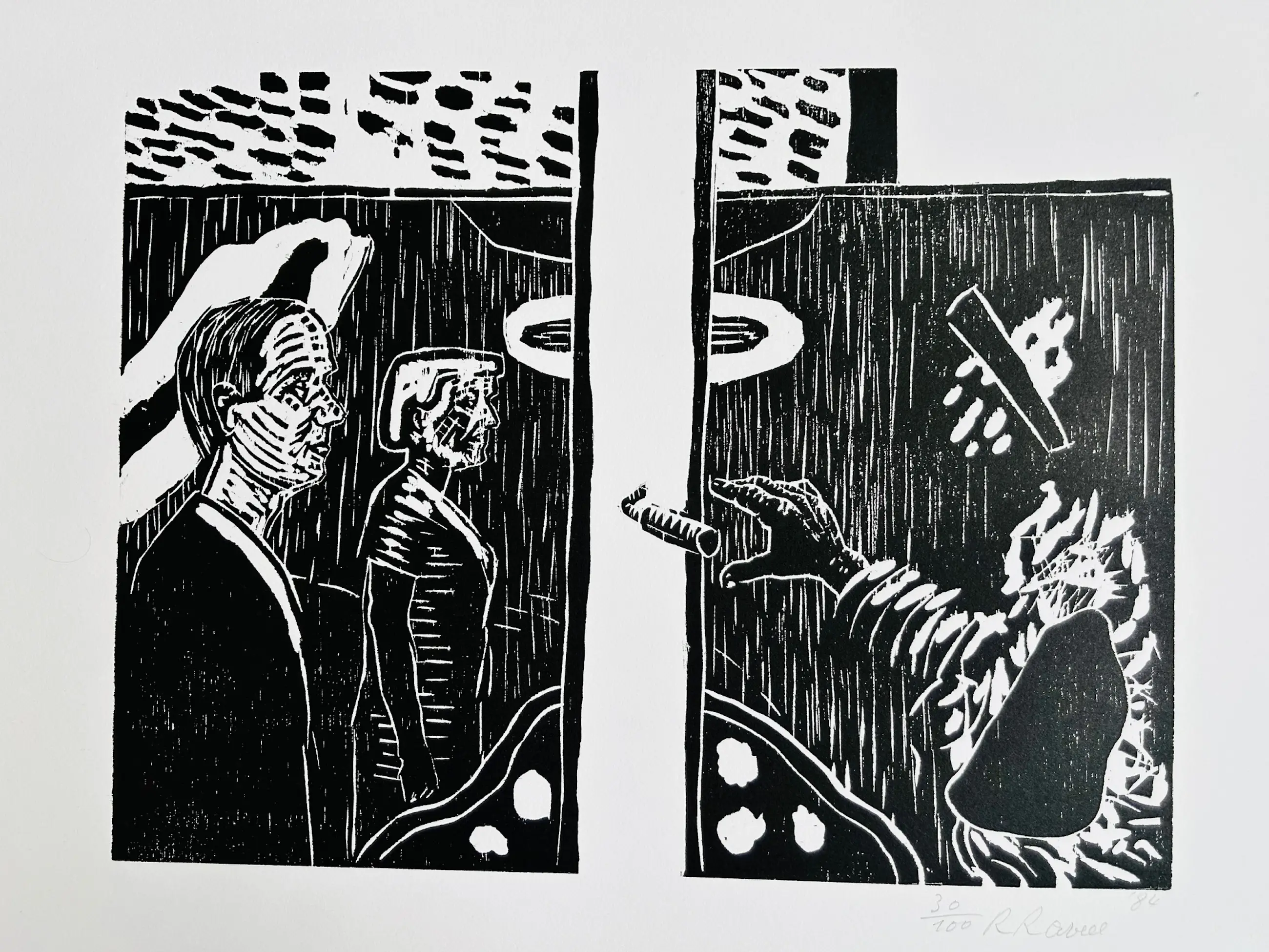 Fraaie houtsnede van de Belgische topkunstenaar Roger Raveel. Uitgebracht in samen werking met SBK, Gelderland en gedrukt door Piet Clement. Mooi werk uit 1984. Gesigneerd door de kunstenaar. Beschreven in RR het grafische oeuvre nr 144.