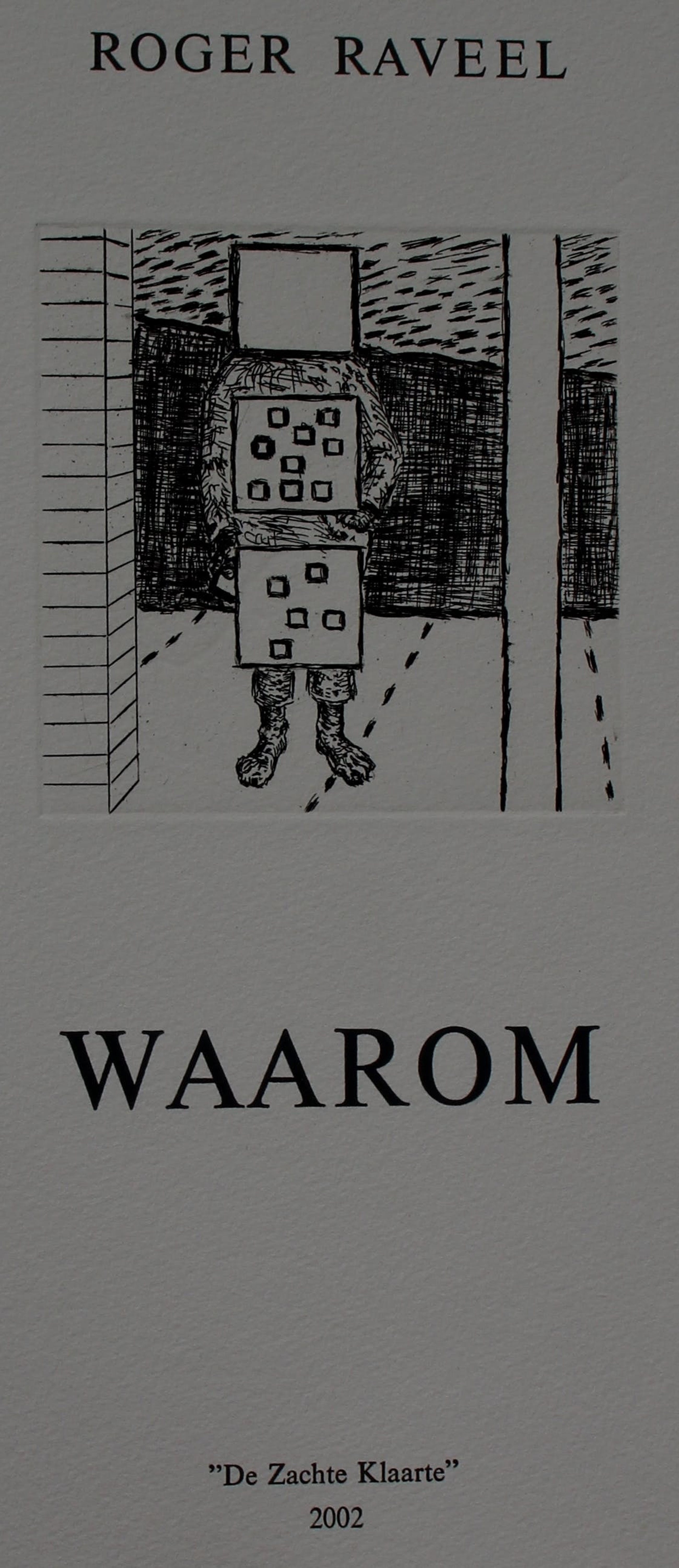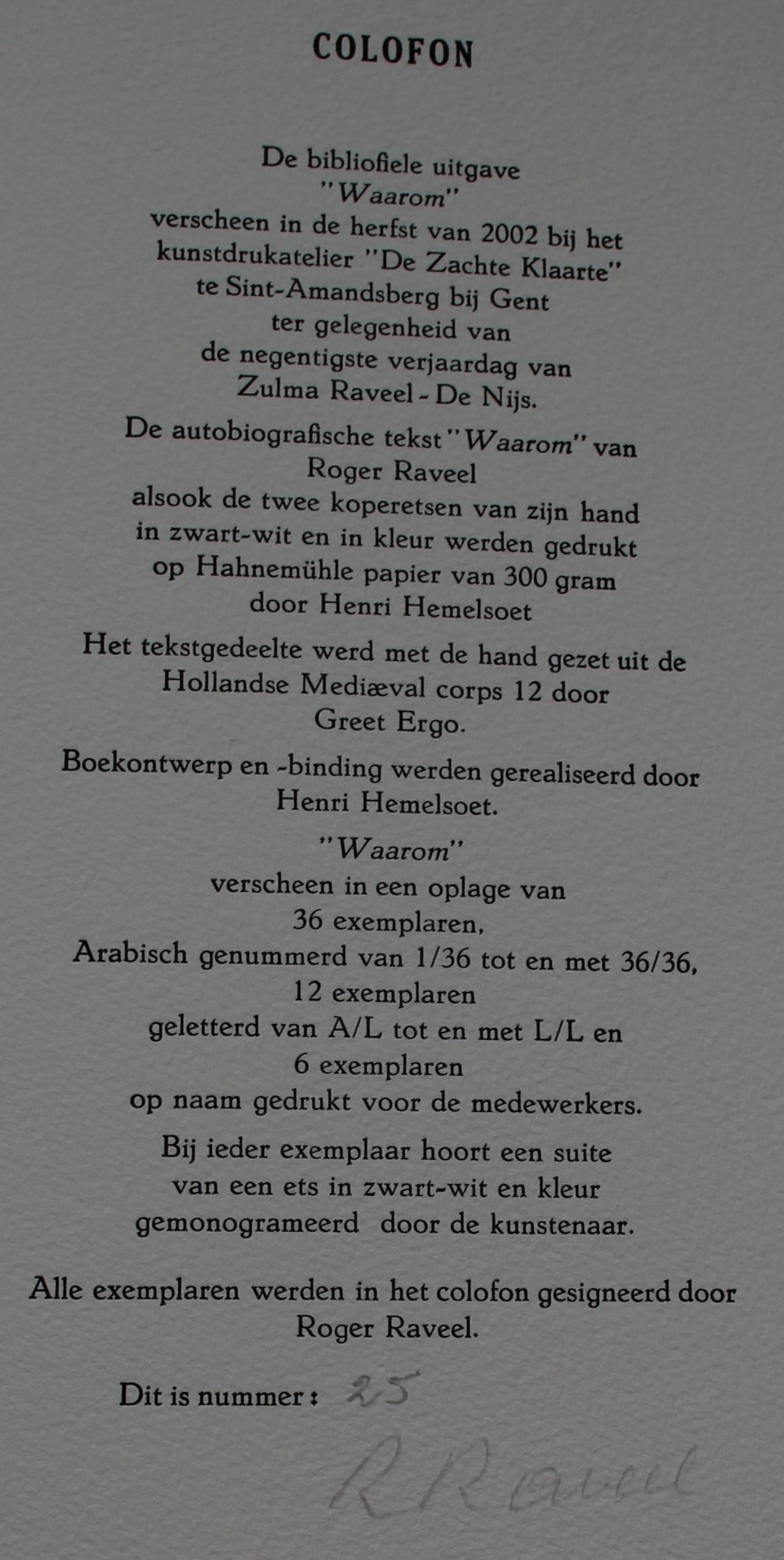 Bibliofiele uitgave van Roger Raveel: "Waarom", verscheen in 2002 bij het kunstdrukatelier "de zachte klaarte" ter gelegenheid van de negentigste verjaardag van Zulma Raveel-de Nijs. Twee etsen, plus de colophon is handgesigneerd door Roger Raveel. Er zijn van dit werk 36 exemplaren uitgegeven, dit is exemplaar nummer 25.