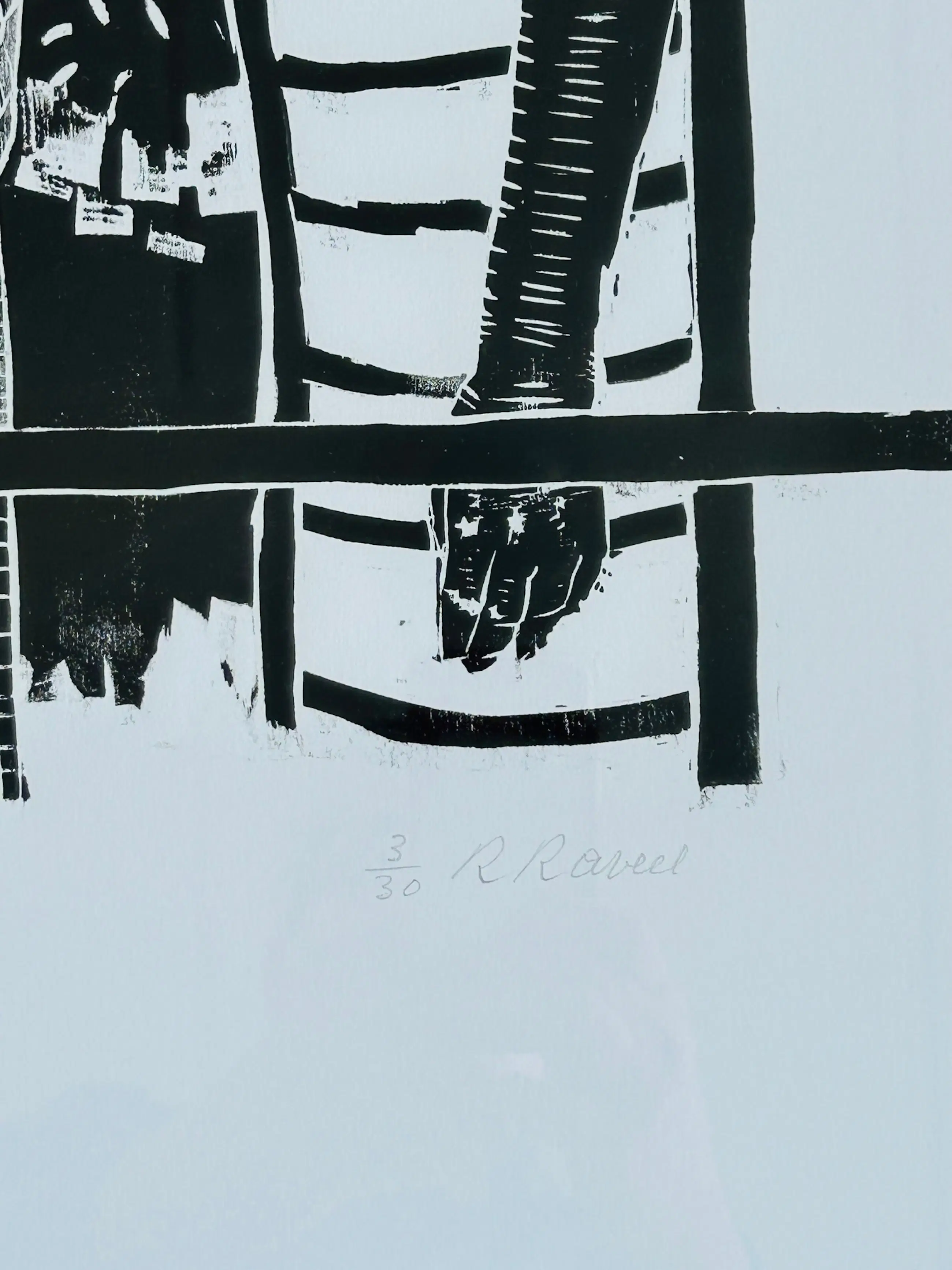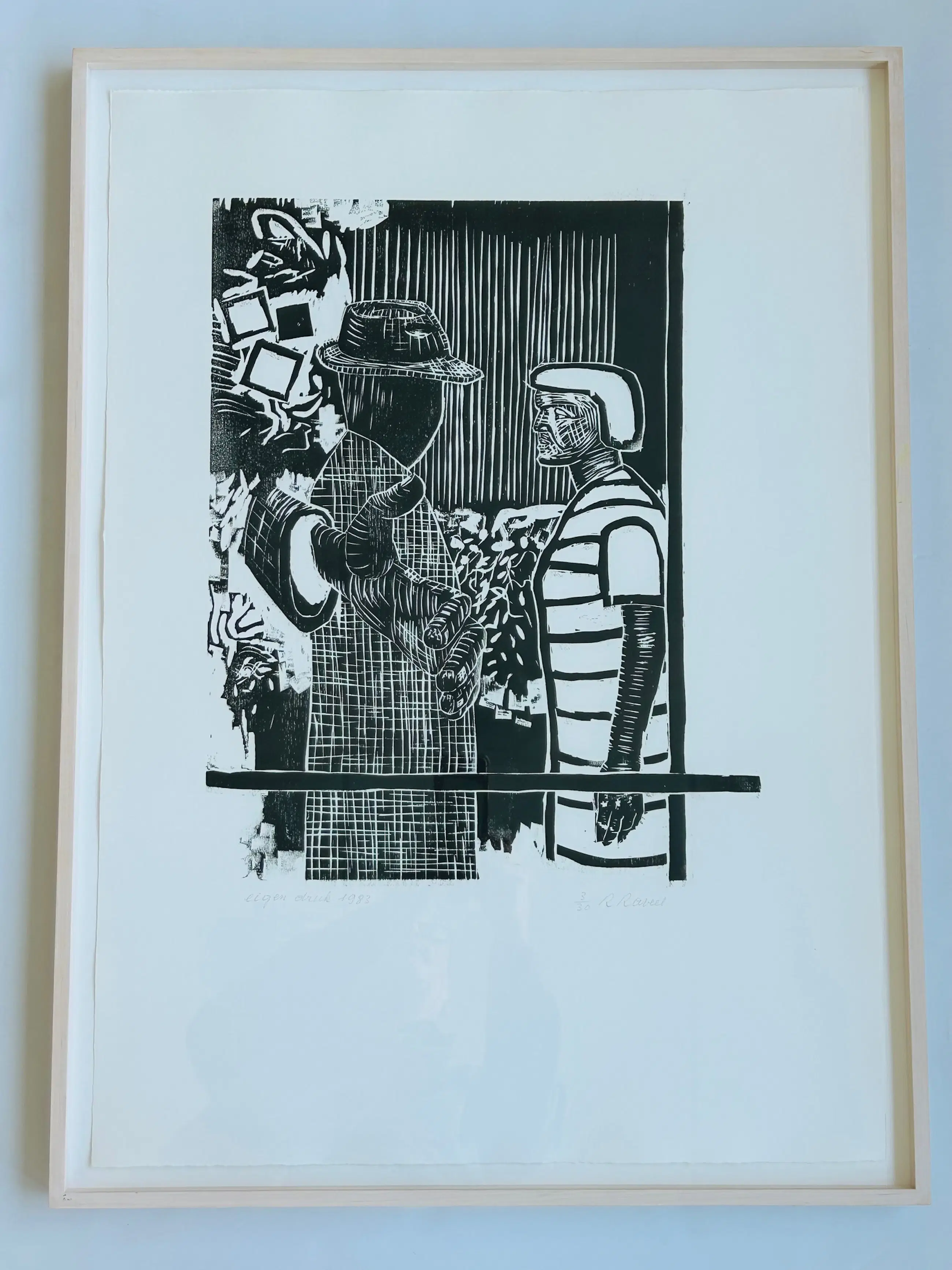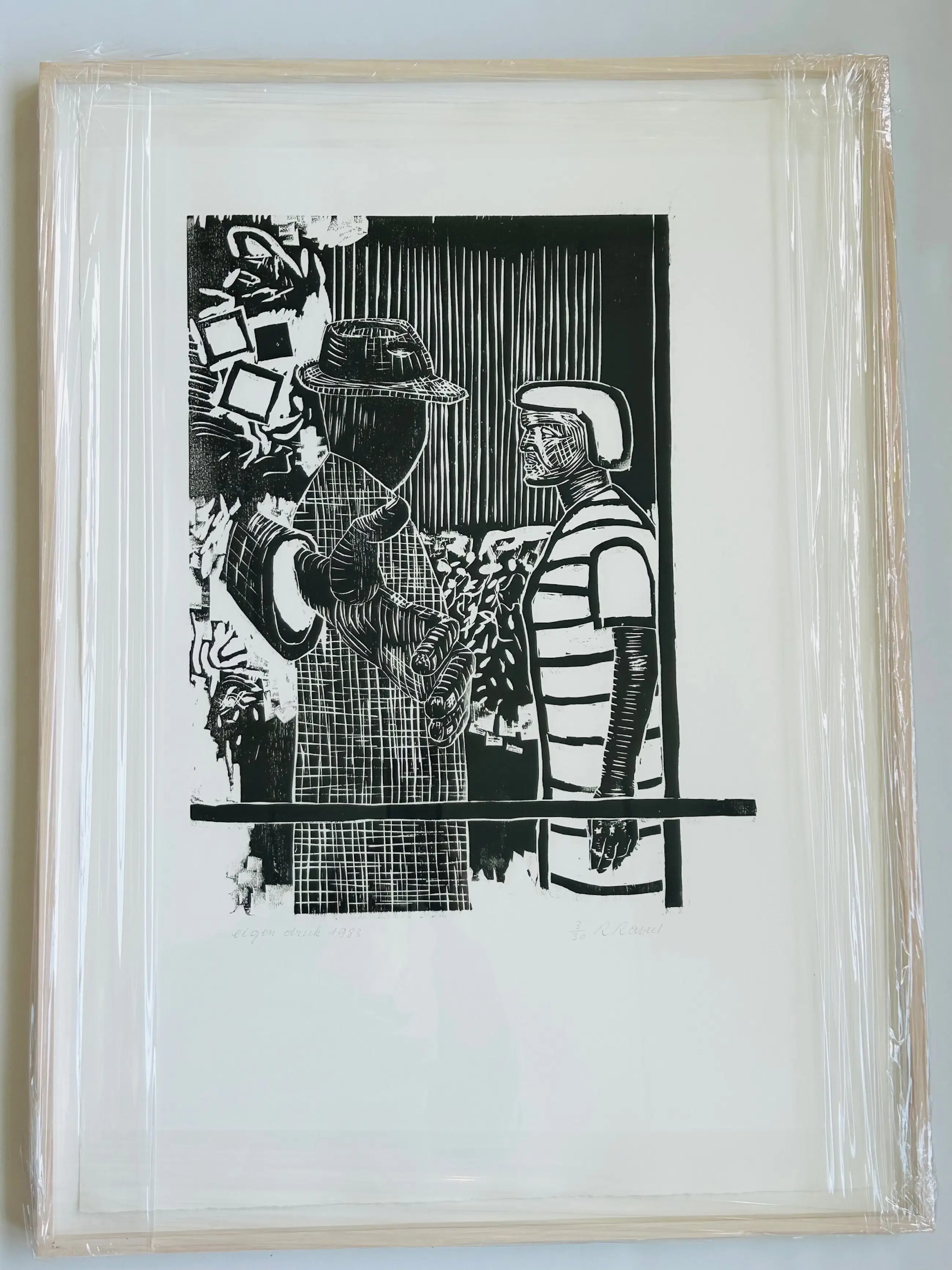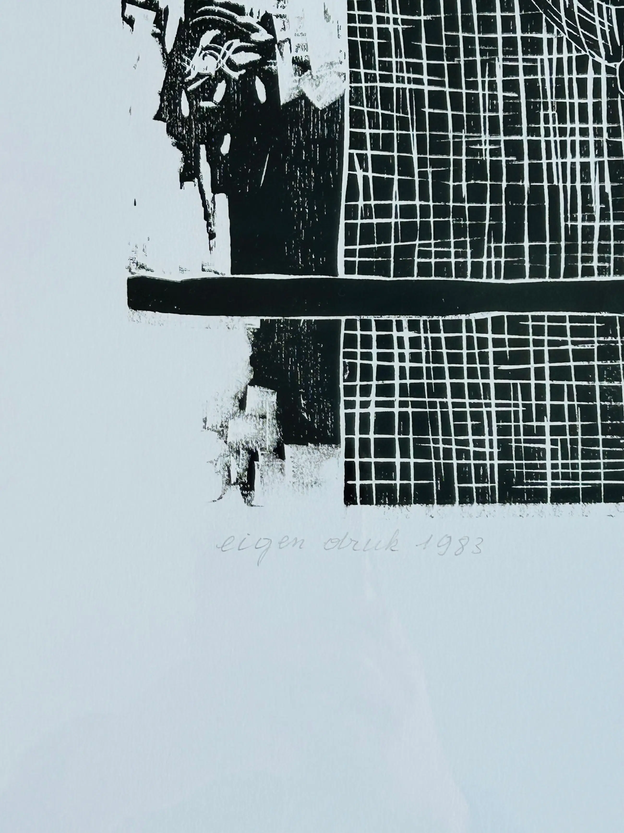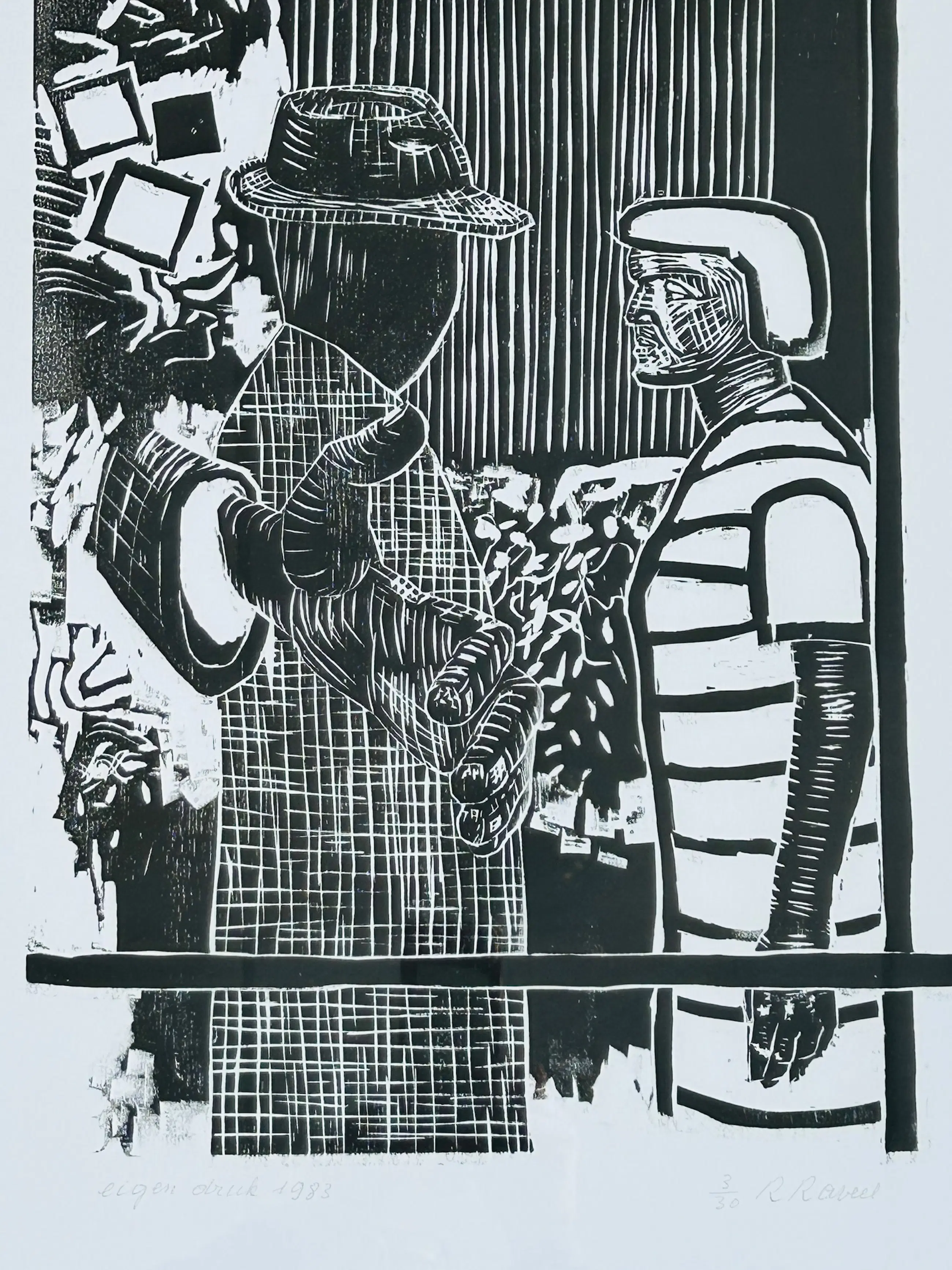Fraaie houtdruk in zeer kleine oplage van de Belgische topkunstenaar Roger Raveel. Het werk is zelf gedrukt door Raveel. Zeldzaam werk uit 1983 en in zeer goede staat! Gesigneerd en genummerd door de kunstenaar. Beschreven in RR het grafische oeuvre nr 124. het werk 'zwevend' ingelijst en ook de lijst is in goede staat.