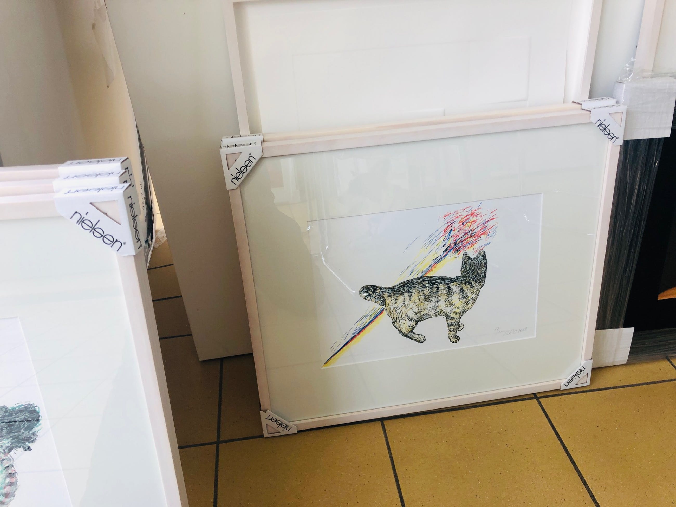 Fraaie zeefdruk van de Belgische grootmeester Raveel uit de serie Felix vulgaris waar de kat van Roger de hoofdrol speelt. Gesigneerd en genummerd door de kunstenaar. Het werk heeft een fraaie nieuwe houten ( white wash) lijst en zuurvrij passe partout. U kunt het zo ophangen. Het werk kan worden opgehaald, verzonden met lijst per koerier of zonder lijst worden toegestuurd. Wij kunnen uw aankopen tijdens de pandemie gratis opslaan. Het werk is ingelijst. Voor de eerste foto is een niet ingelijst werk gebruikt. Het werk dat we nu aanbieden is nr 77/100.