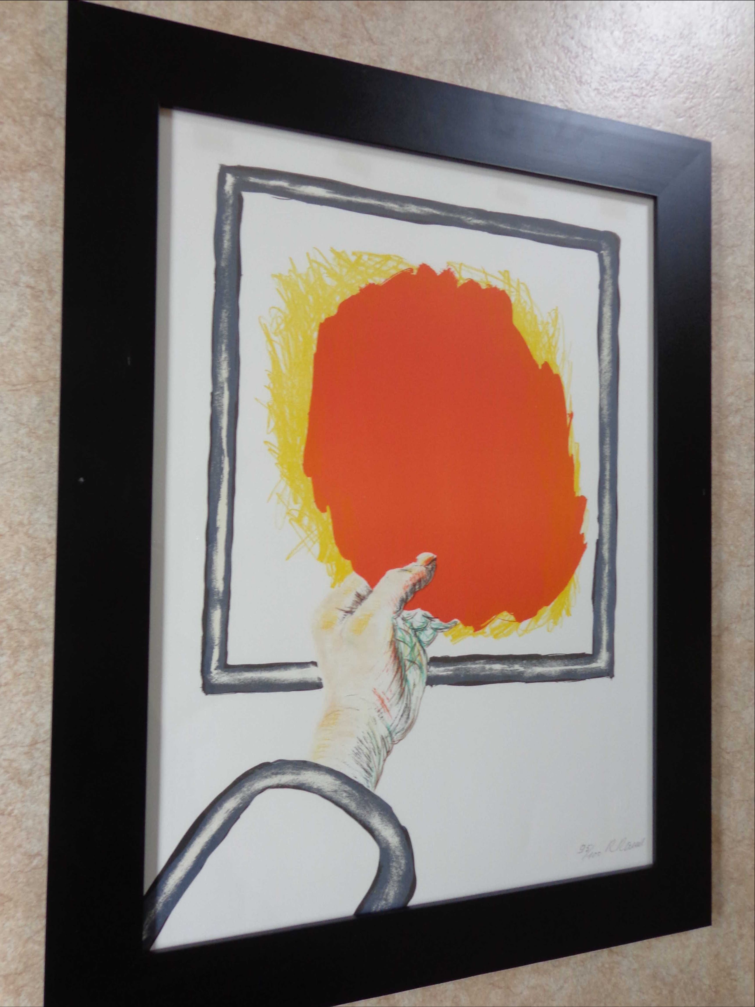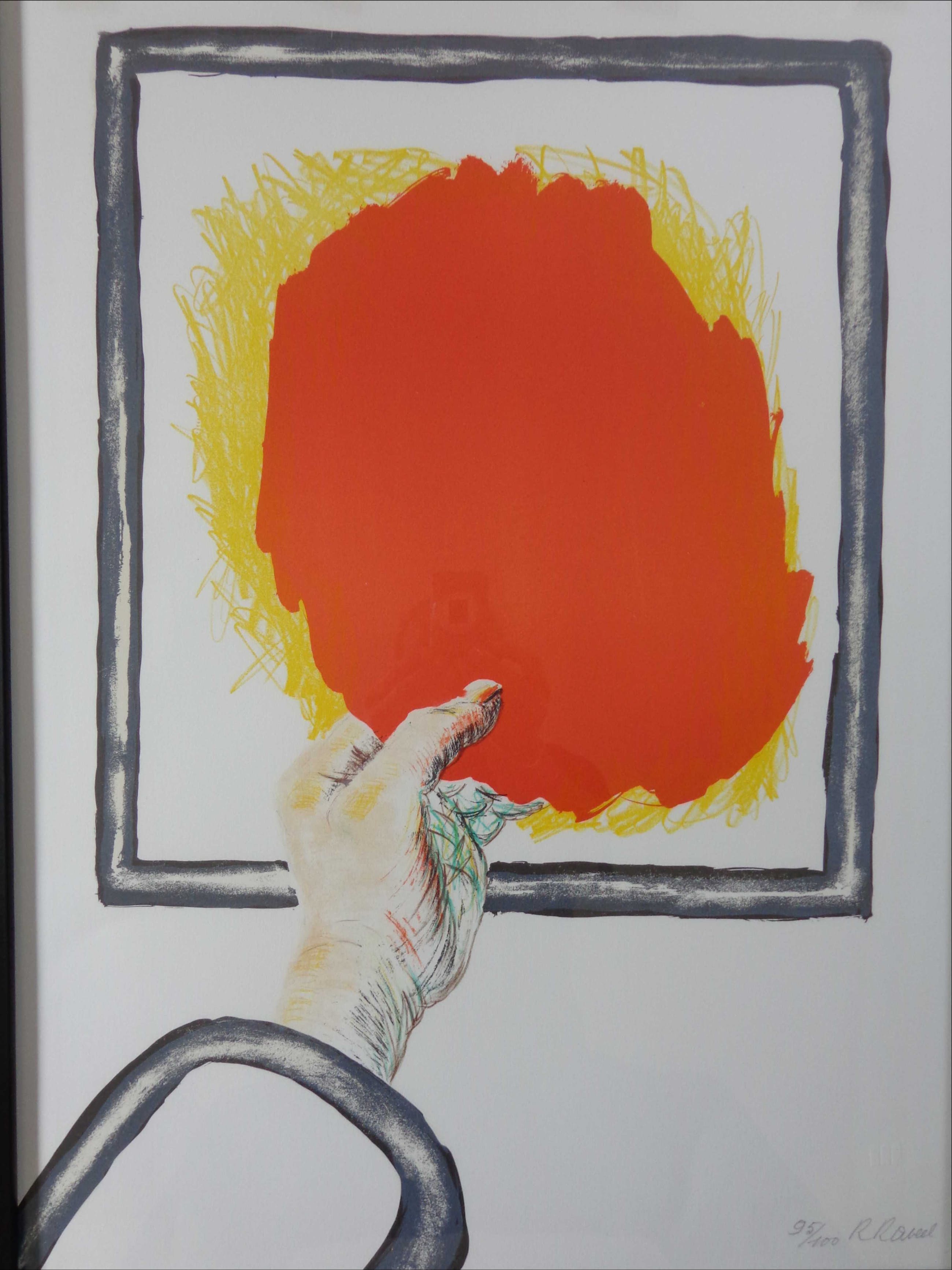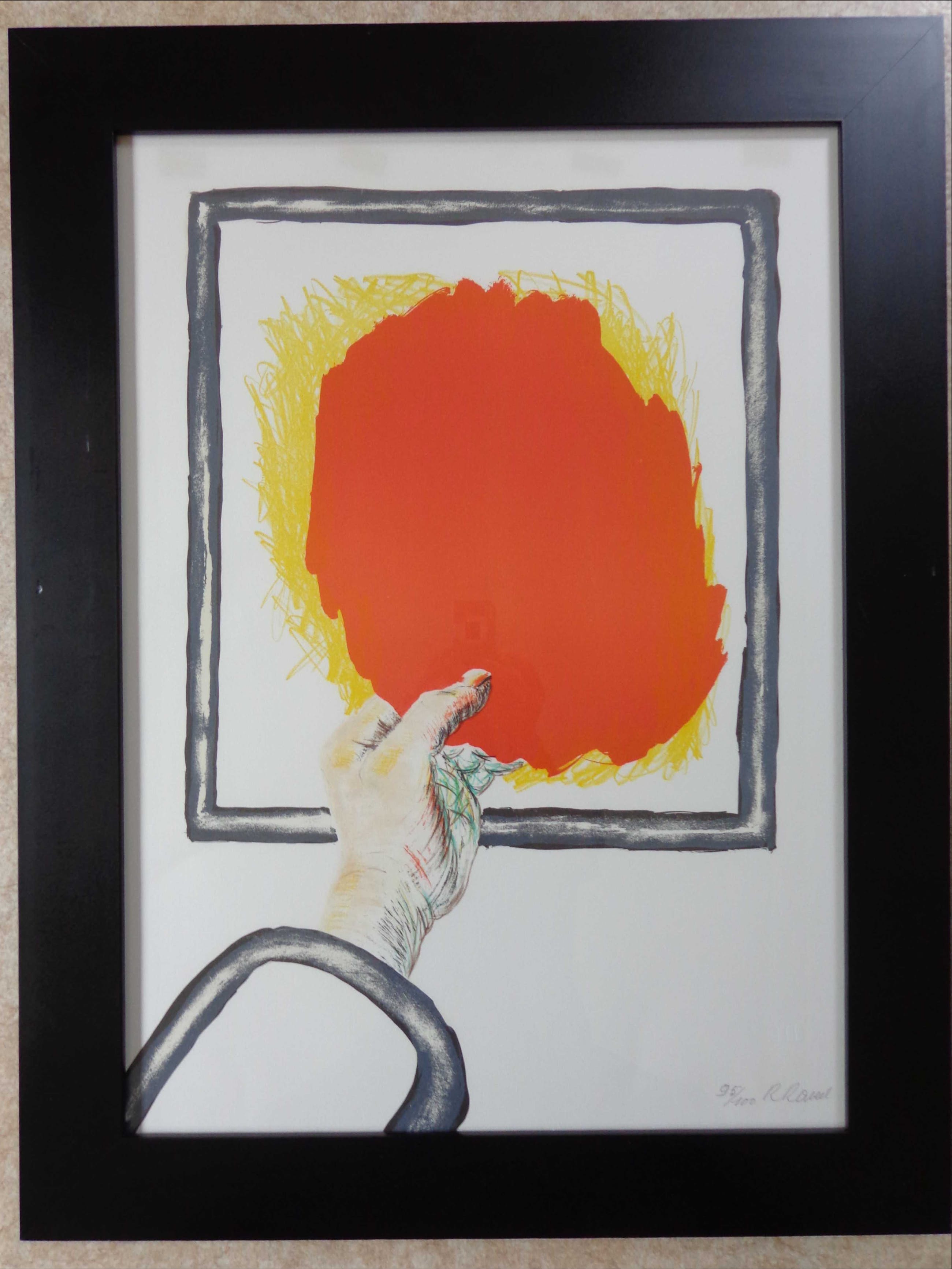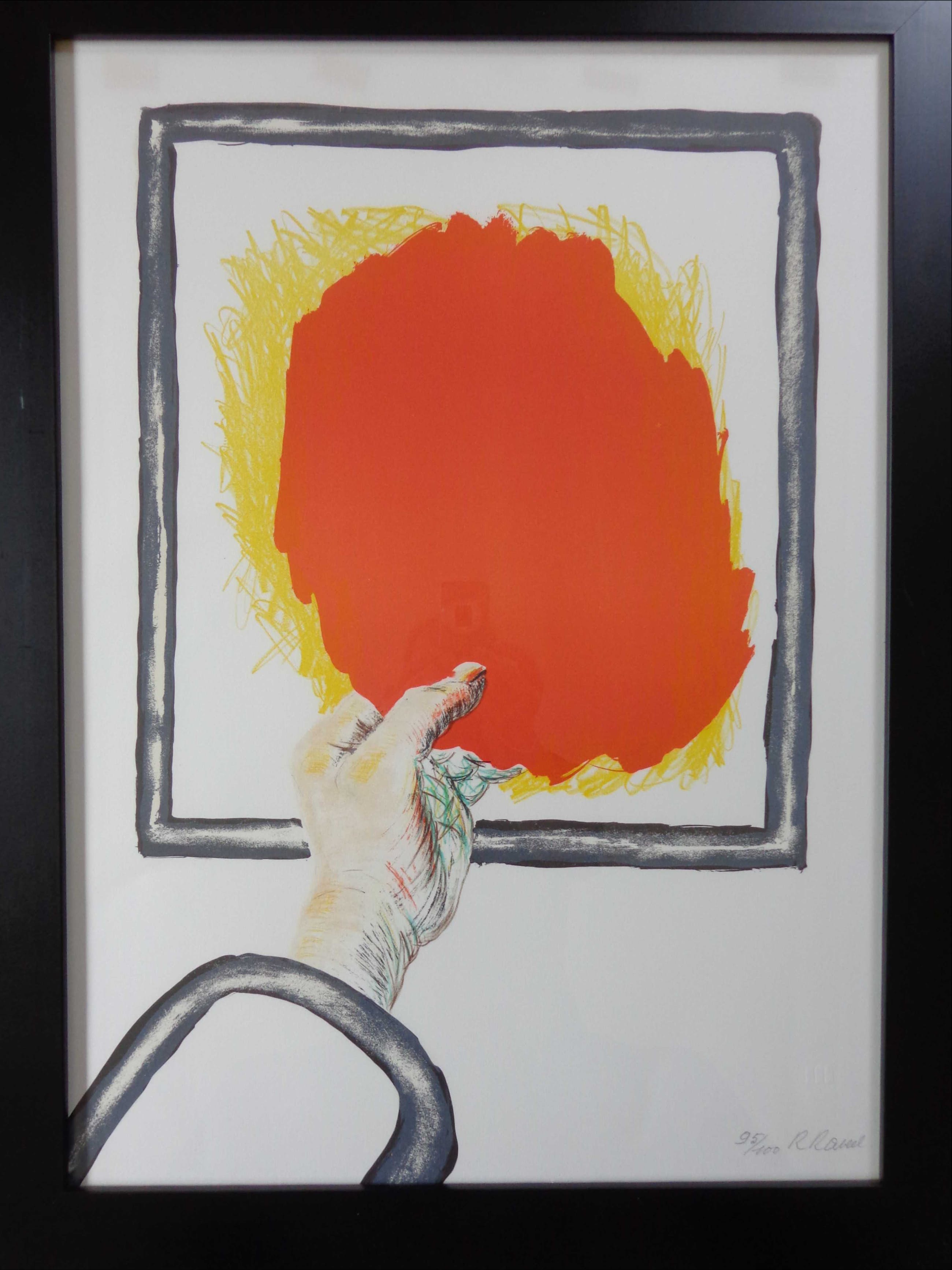 Roger Raveel (1921-2013). Titel: "Greep op rood". Kleurlithografie op papier. Gesigneerd met potlood. Ex.nr. 95/100. Droogstempel "Frans Masereel Centrum, Kasterlee" (uitgever). Blad: 68x49cm. Kader: 82x63cm. Goede staat, boven aan boord plakband verso zichtbaar vooraan. Professionele inkadering.