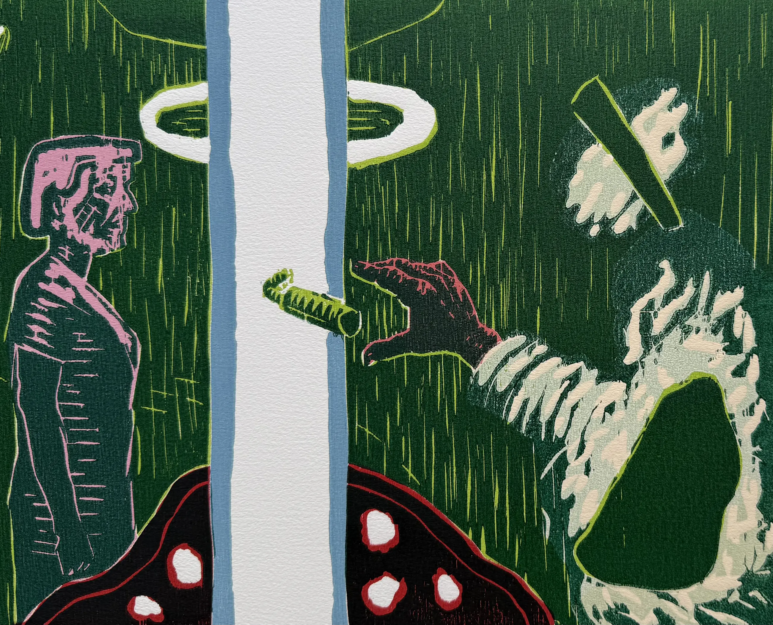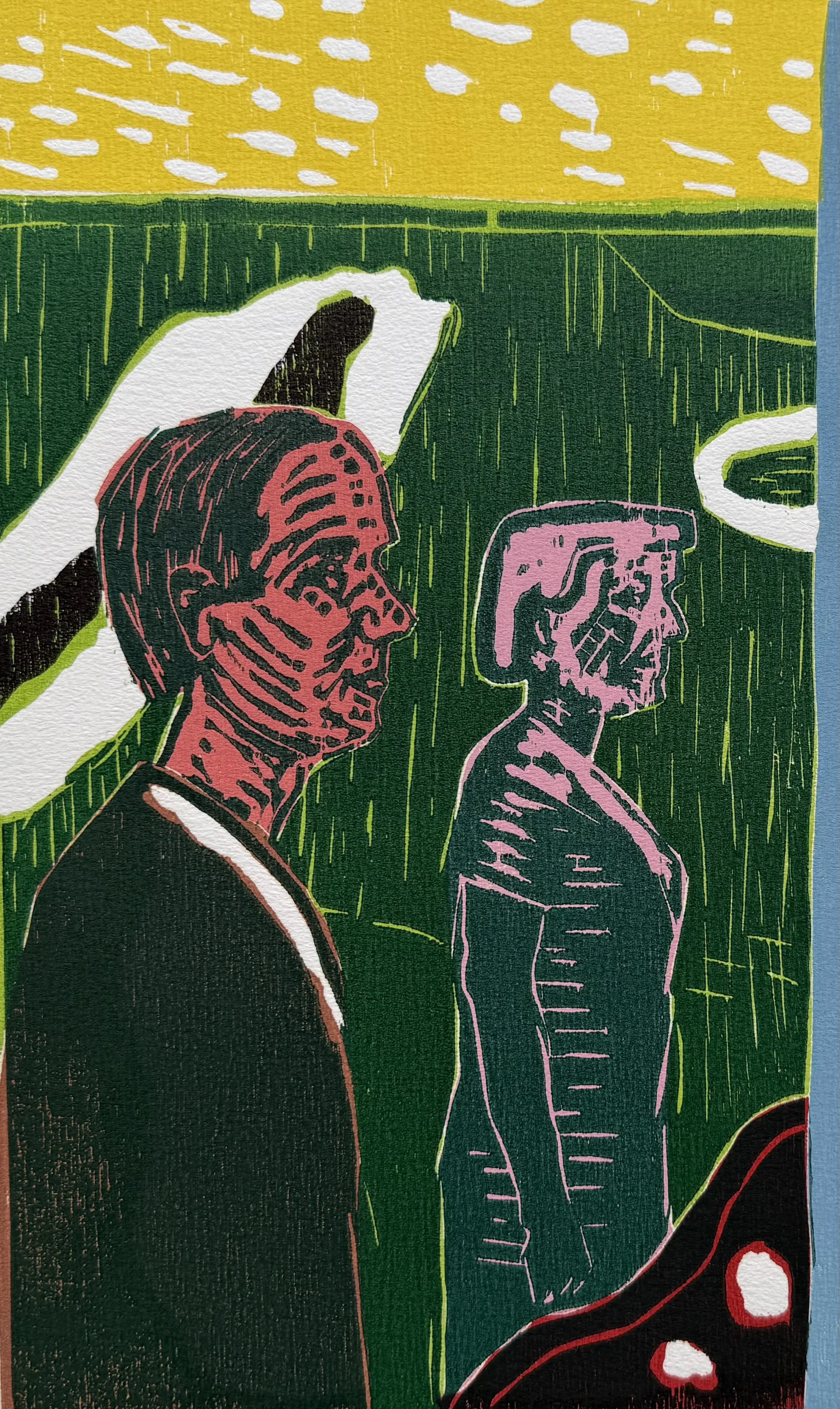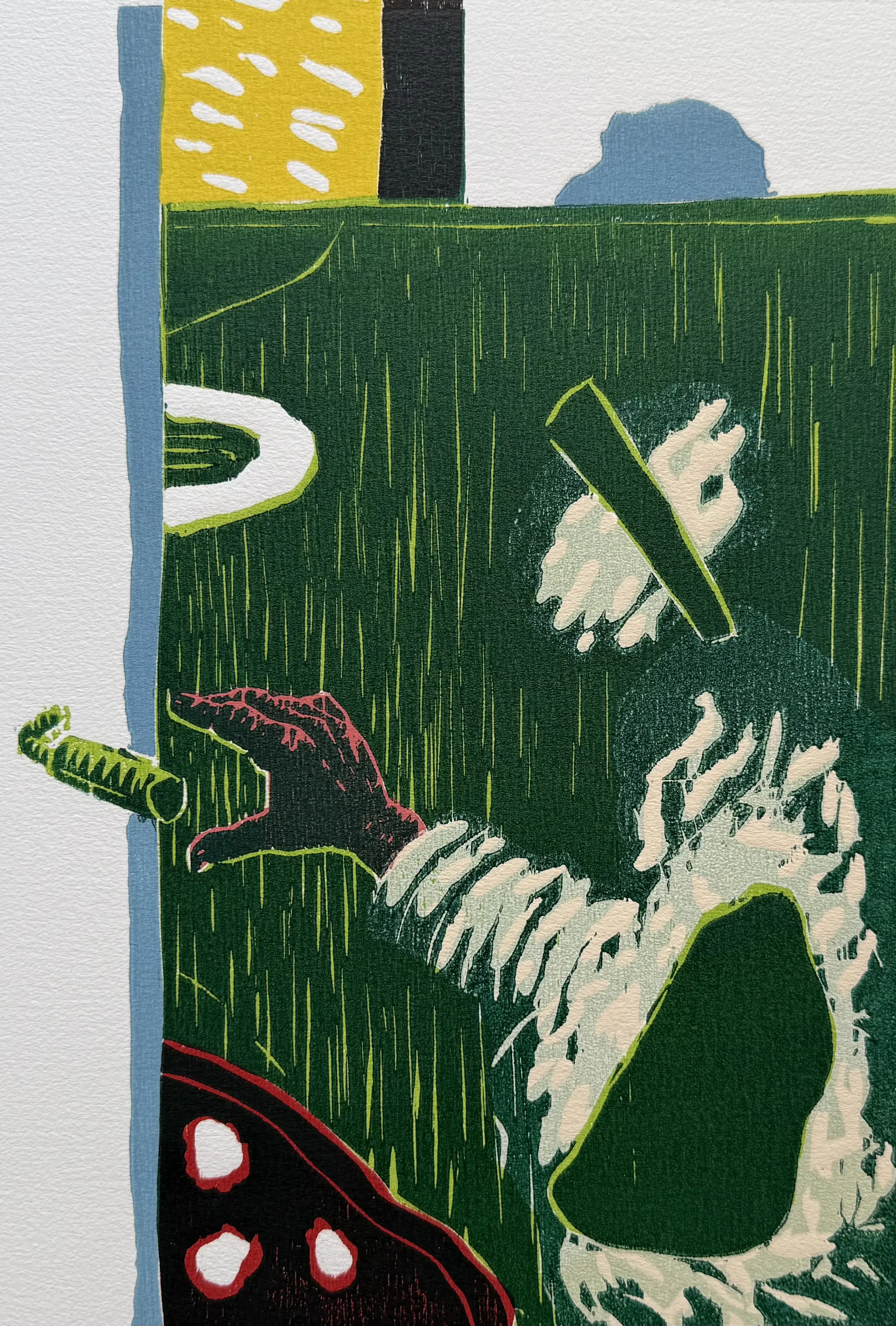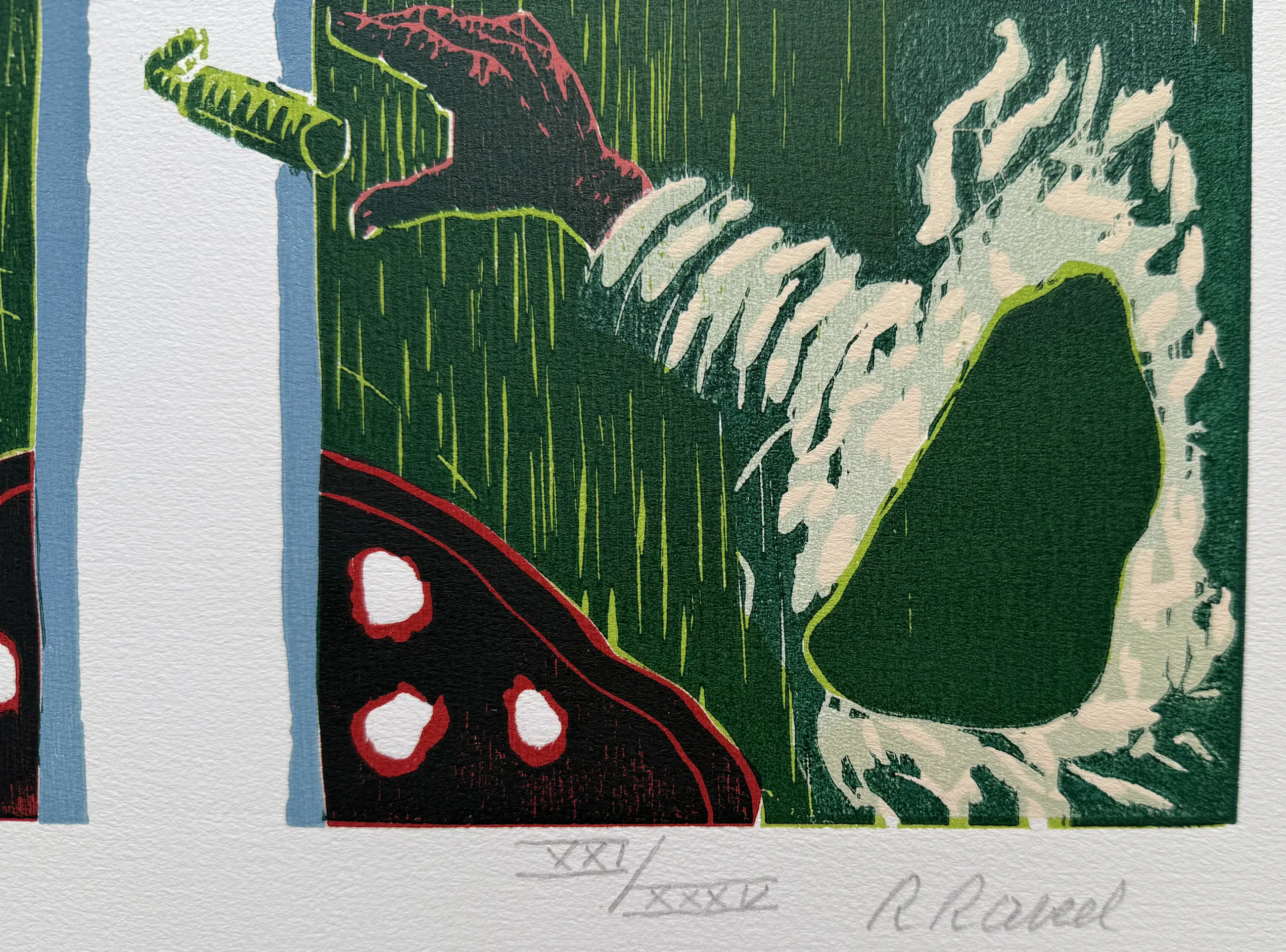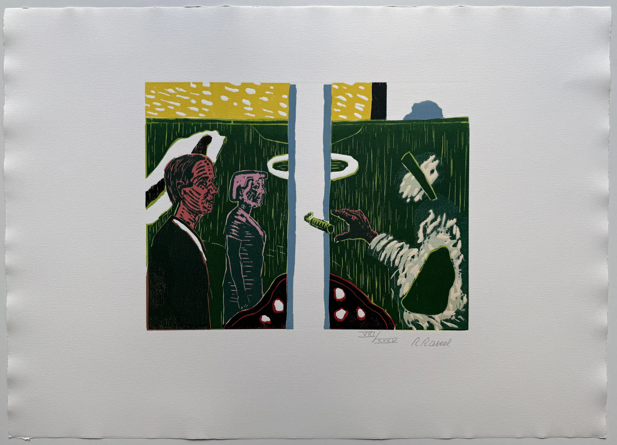 Prachtige kleurenhoutsnede uit 1988. Het werk is afgedrukt in een reguliere oplage van 50 exemplaren. Dit specifieke exemplaar is linksonder genummerd met XXI/XXXV, wat betekent dat dit nummer 21 van 35 uit de kunstenaarseditie betreft. Een collector's item.