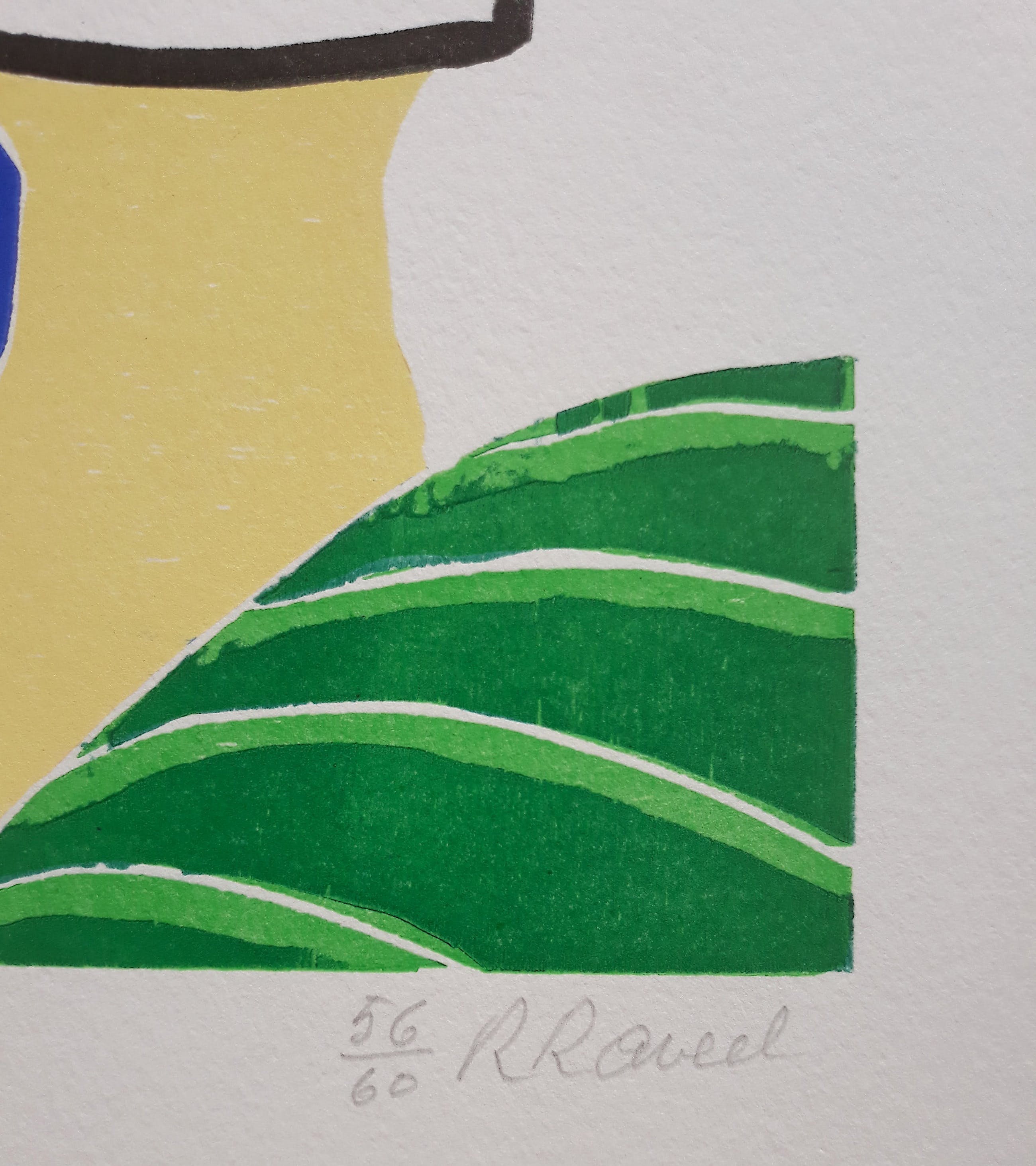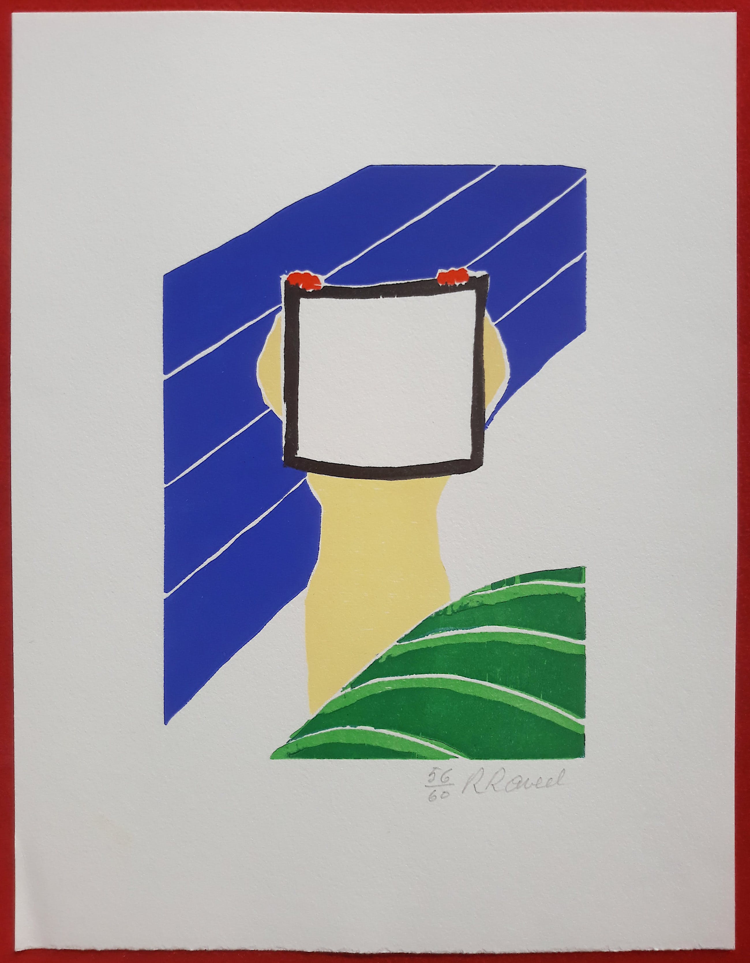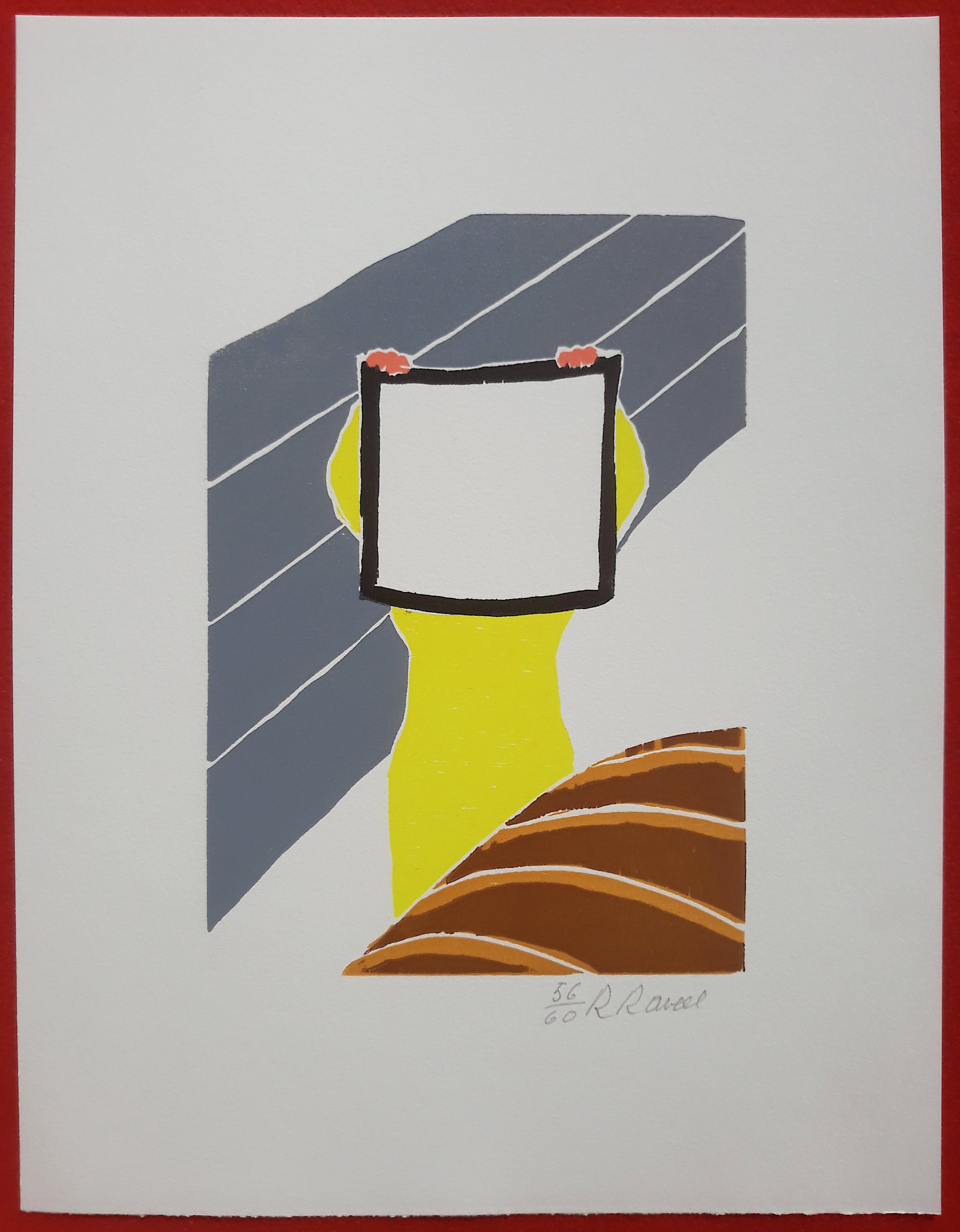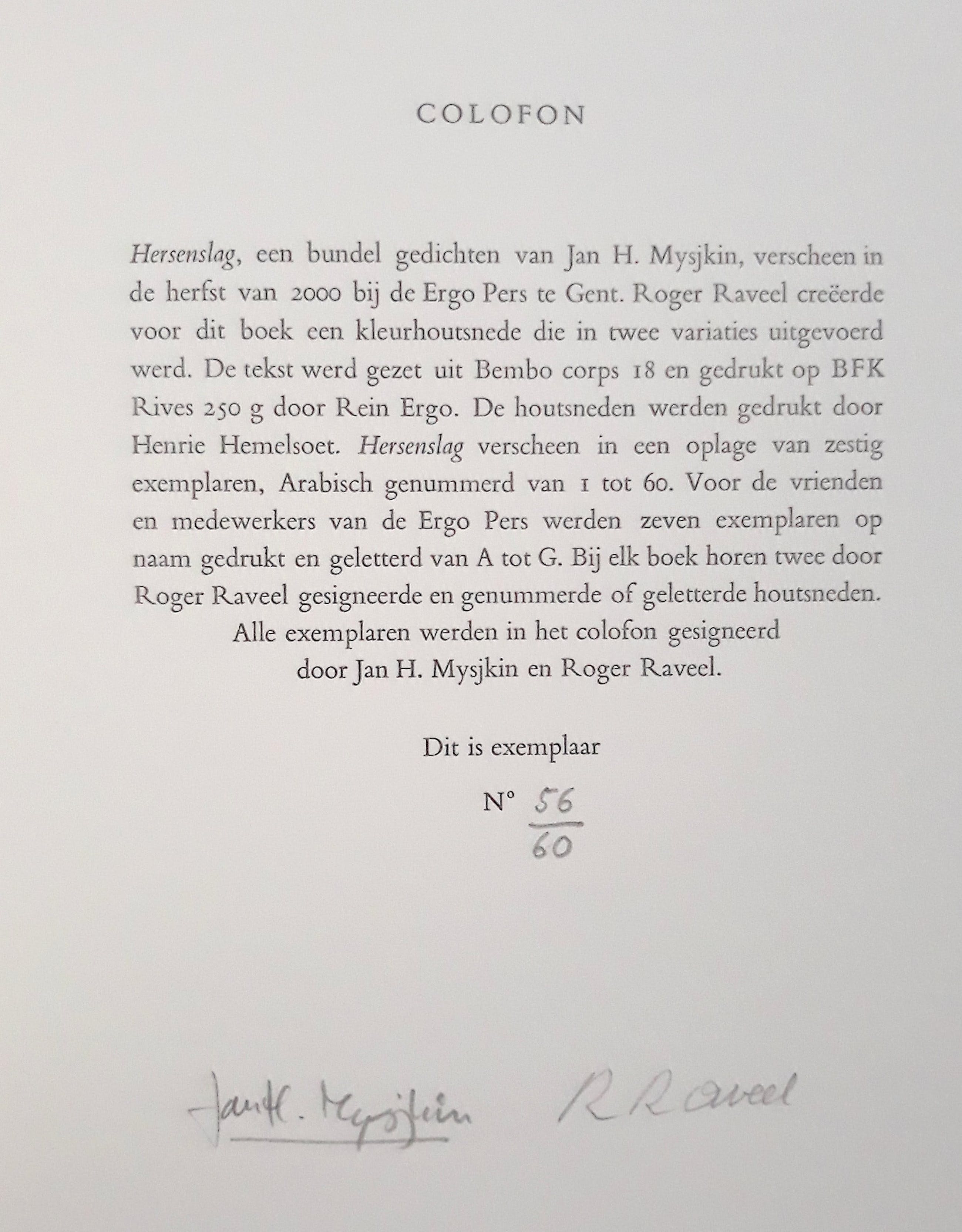 Het ontwerp resulteerde in een houtsnede die is uitgevoerd in twee variaties. Deze twee houtsneden zijn ieder twee keer opgenomen in het boek; twee ingebonden en ongesigneerde exemplaren en een aparte suite van twee losse houtsneden die ieder gesigneerd en genummerd (56/60) zijn. De colofon is met potlood gesigneerd door zowel Raveel als Mysjkin en ook genummerd. Literatuur: Scheire “Roger Raveel - Het grafische oeuvre” pagina 190, nummer 237.