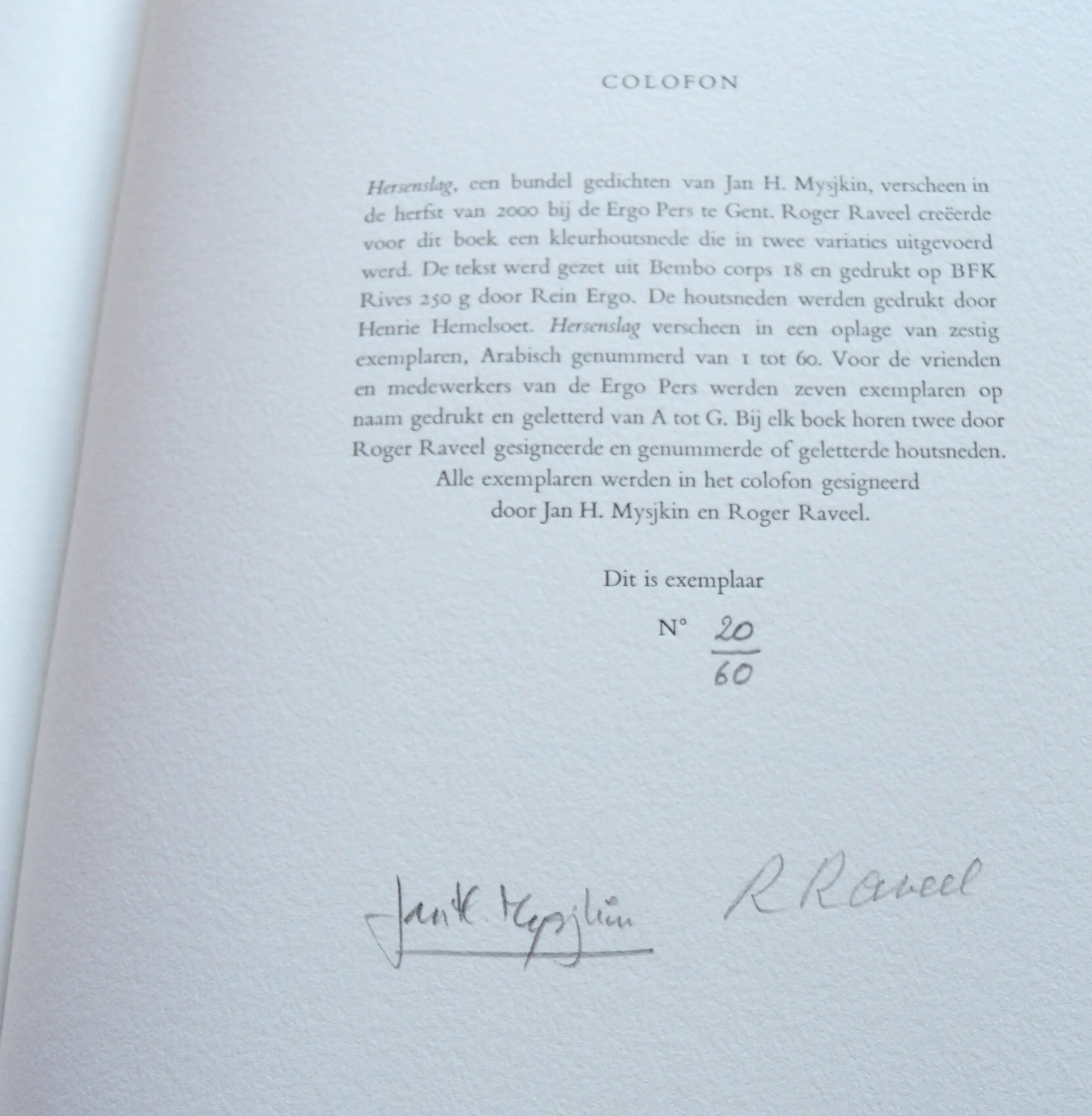 De colofon is met potlood gesigneerd door zowel Raveel als Mysjkin en ook genummerd. Literatuur: Scheire “Roger Raveel - Het grafische oeuvre” pagina 190, nummer 237.