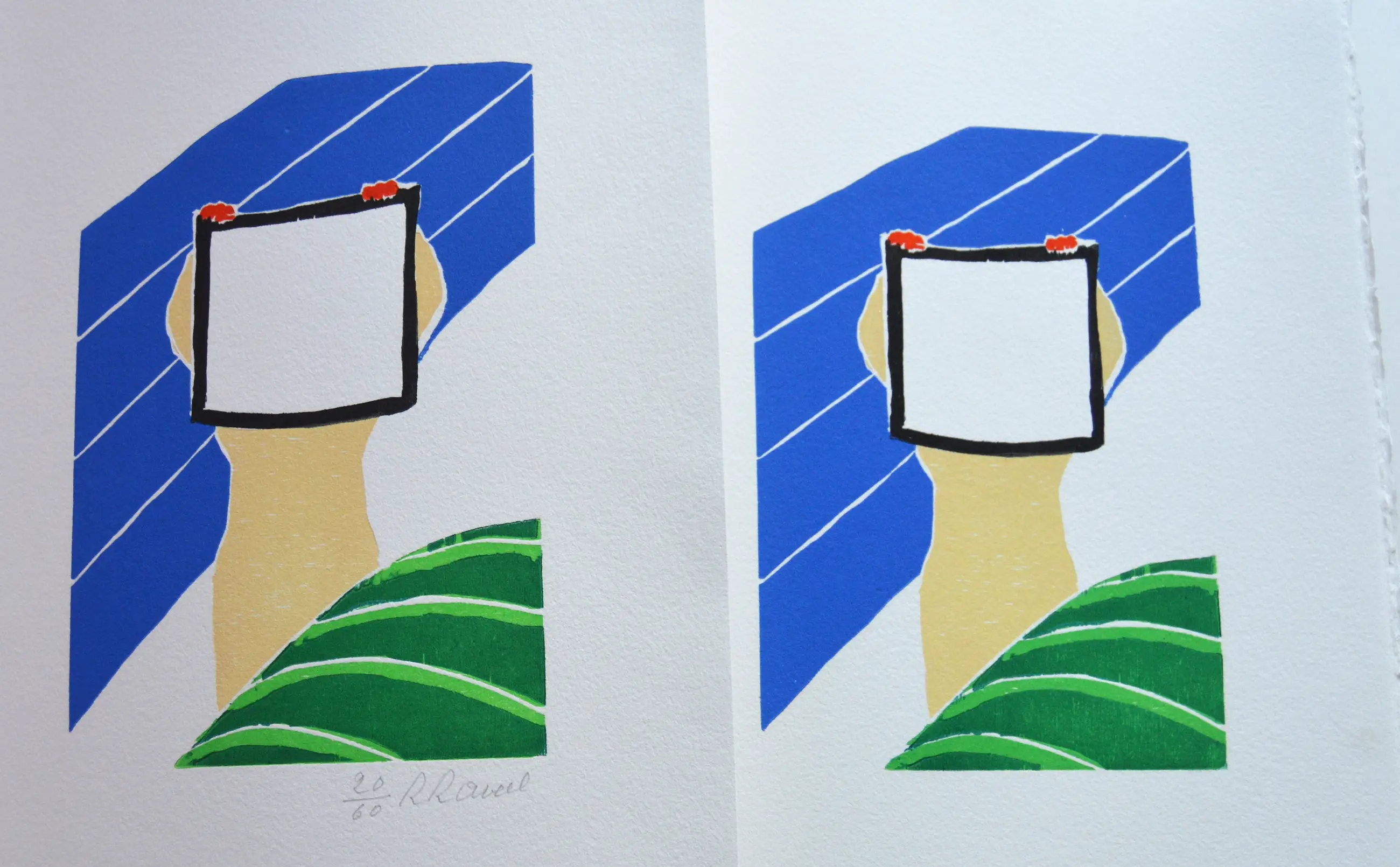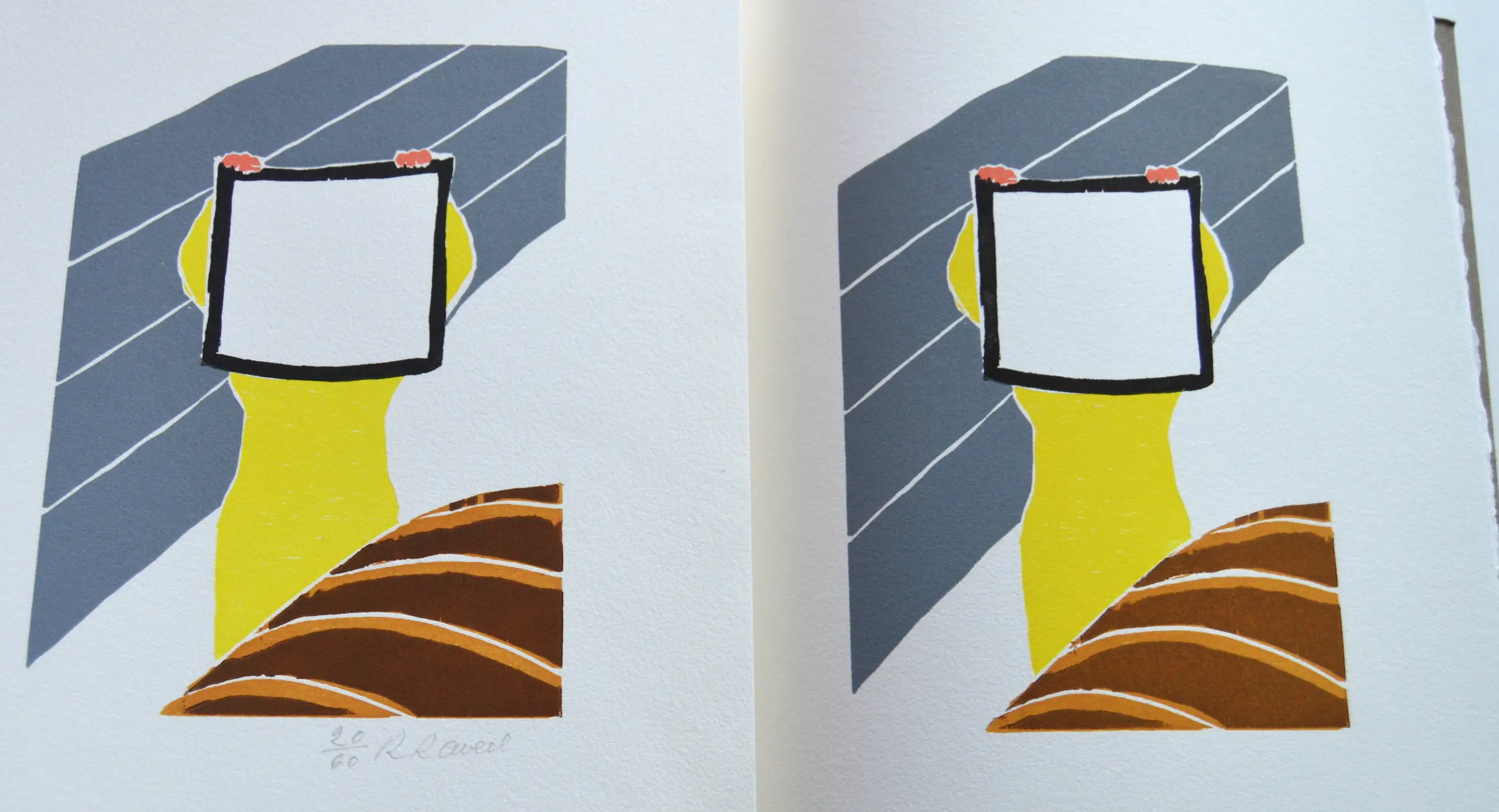 Het ontwerp resulteerde in een houtsnede die is uitgevoerd in twee variaties. Deze twee houtsneden zijn ieder twee keer opgenomen in het boek; twee ingebonden en ongesigneerde exemplaren en een aparte suite van twee losse houtsneden die ieder gesigneerd en genummerd (20/60) zijn.