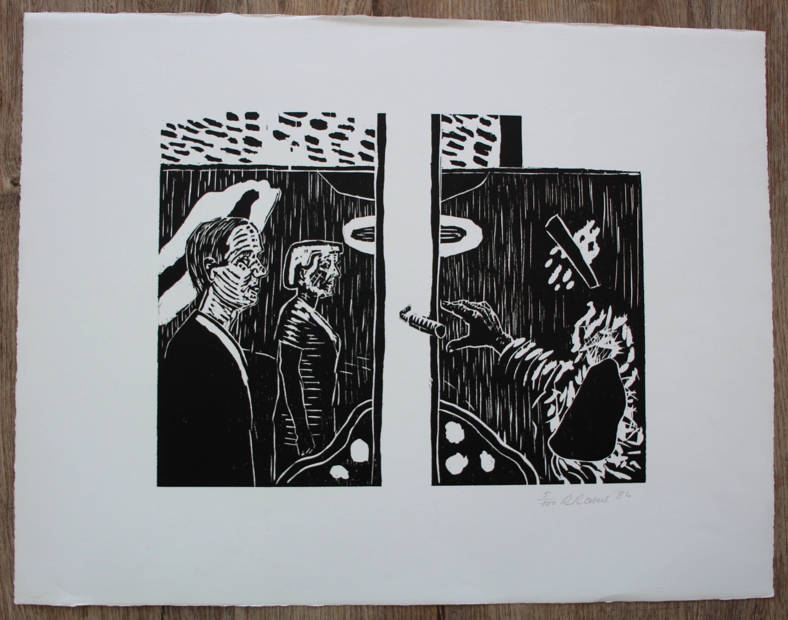 Houtsnede van Roger Raveel uit 1984. Titel: Nummer: 5/100. Afmetingen blad: H51 x b65.5cm. Afmetingen voorstelling: H32 x b41.5cm. Het werk is rechts onder met potlood door de kunstenaar. De authenticiteit van het werk wordt volledig gegarandeerd. Een certificaat van echtheid kan , op aanvraag, worden gemaild.