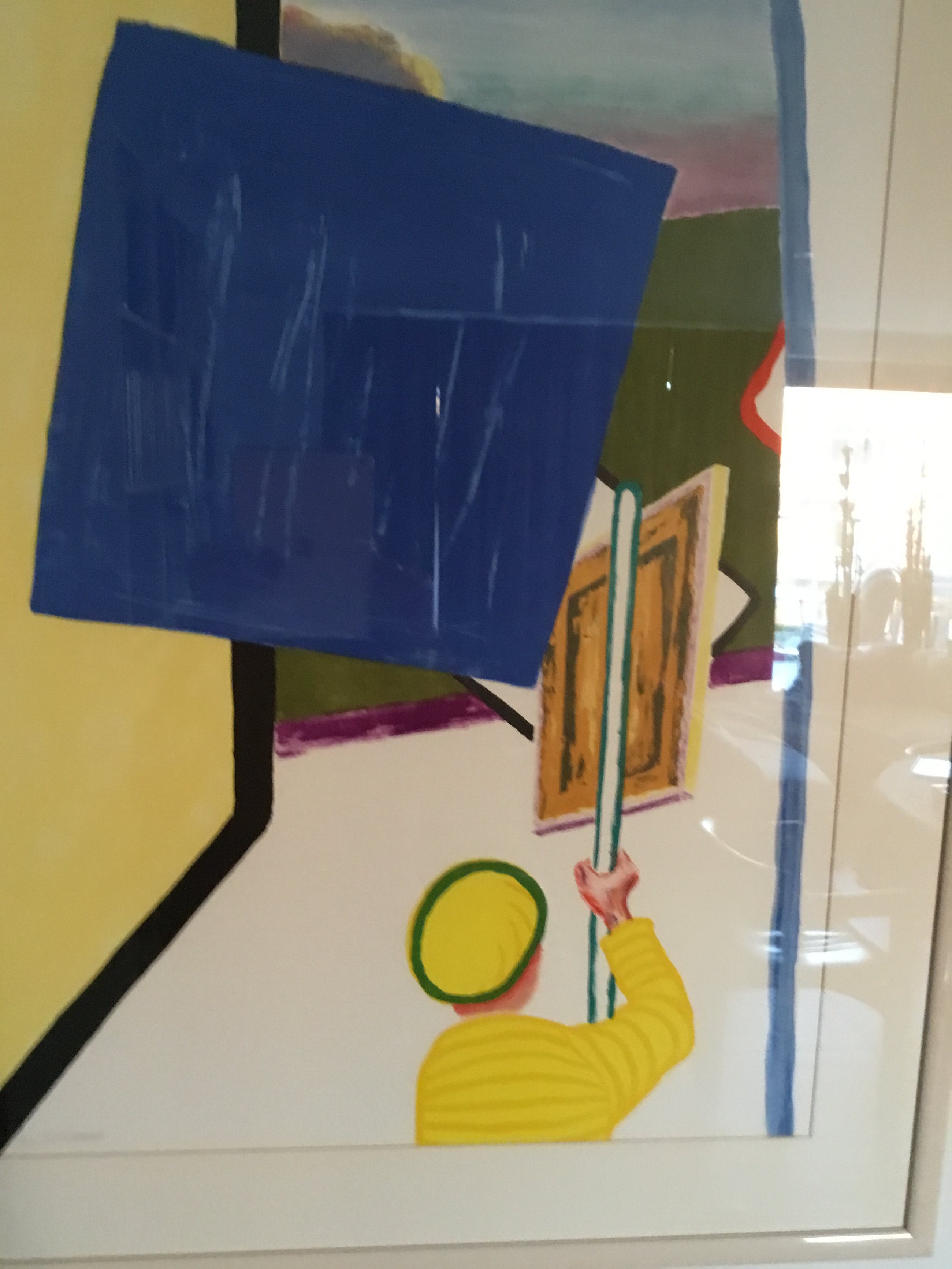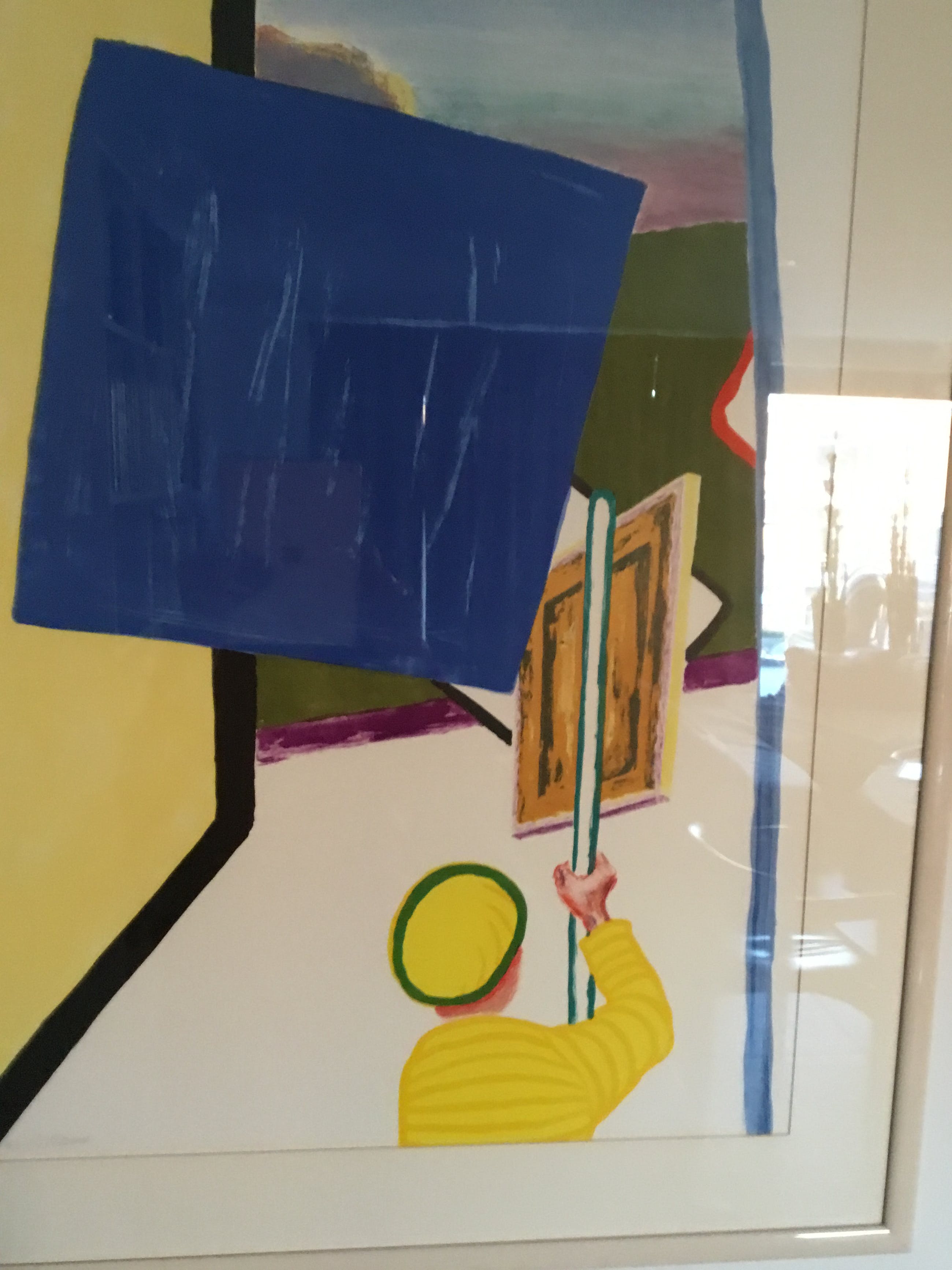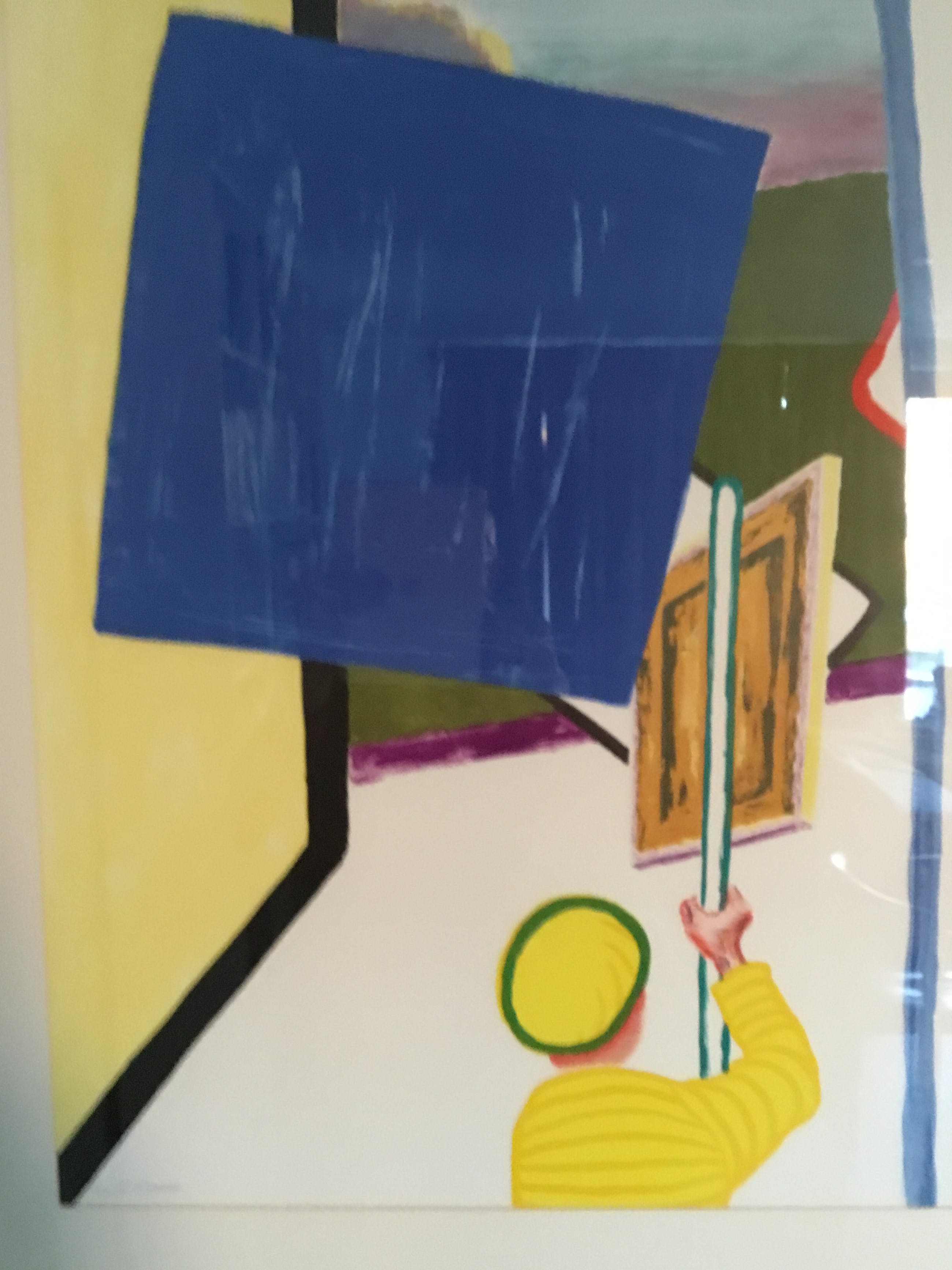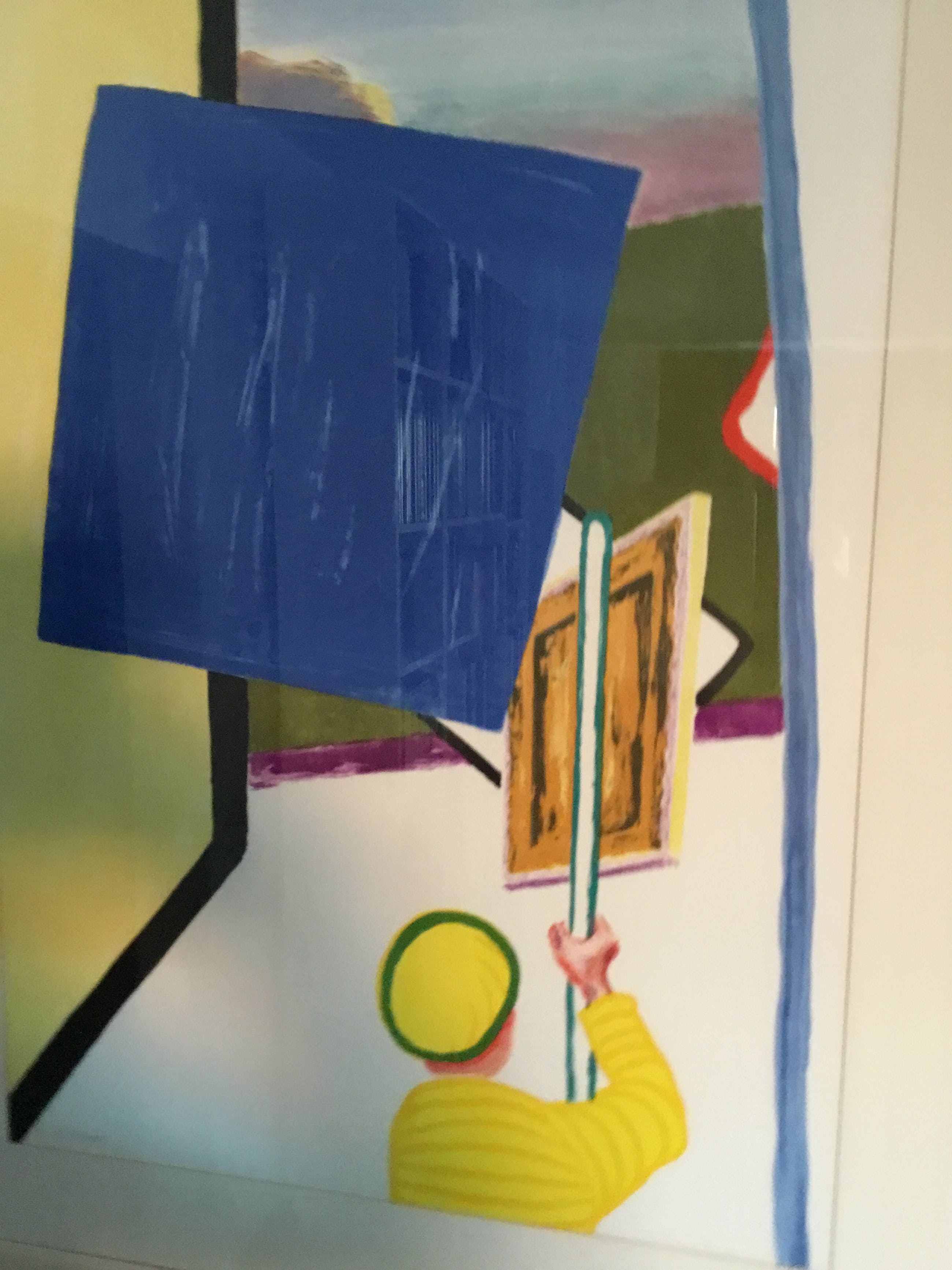 De gele man met schilderij wordt in abstracte kleuren gezet met daarnaast een muur in een harde constructieve vormgeving met een uitzicht op het park van het kasteel van Beervelde . Dit is een litho van een werk in de kelder van dat kasteel.