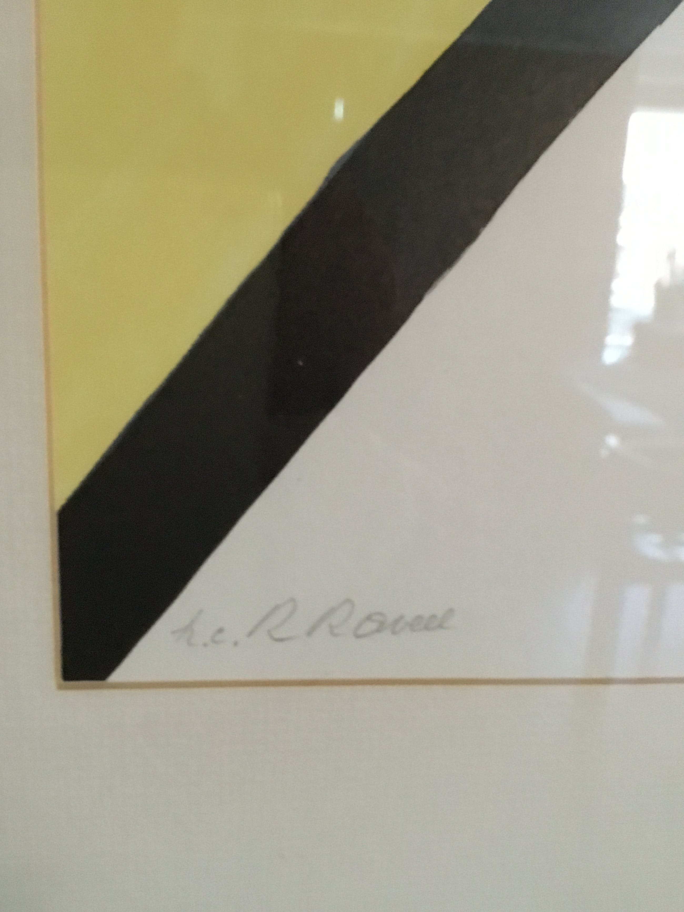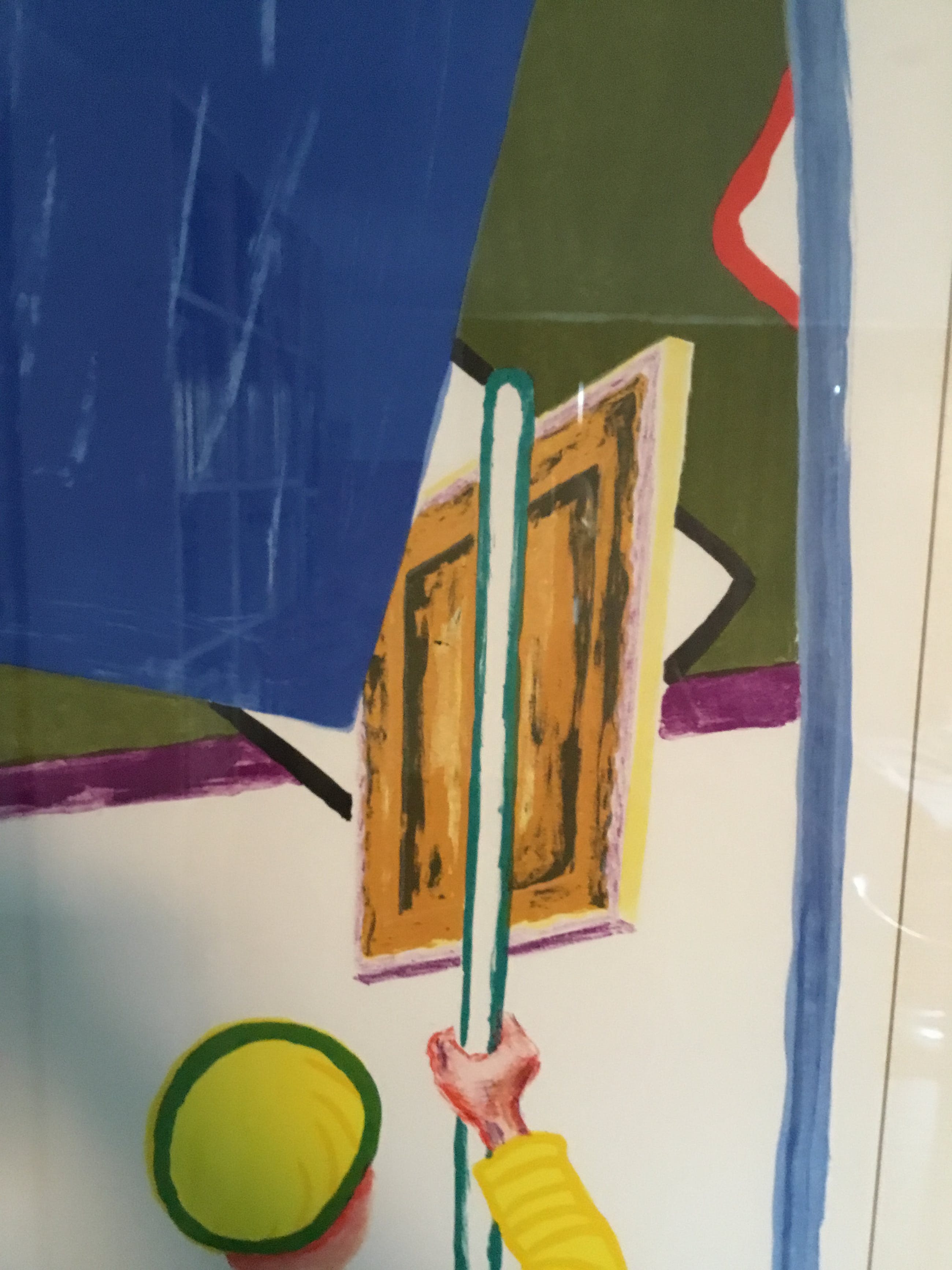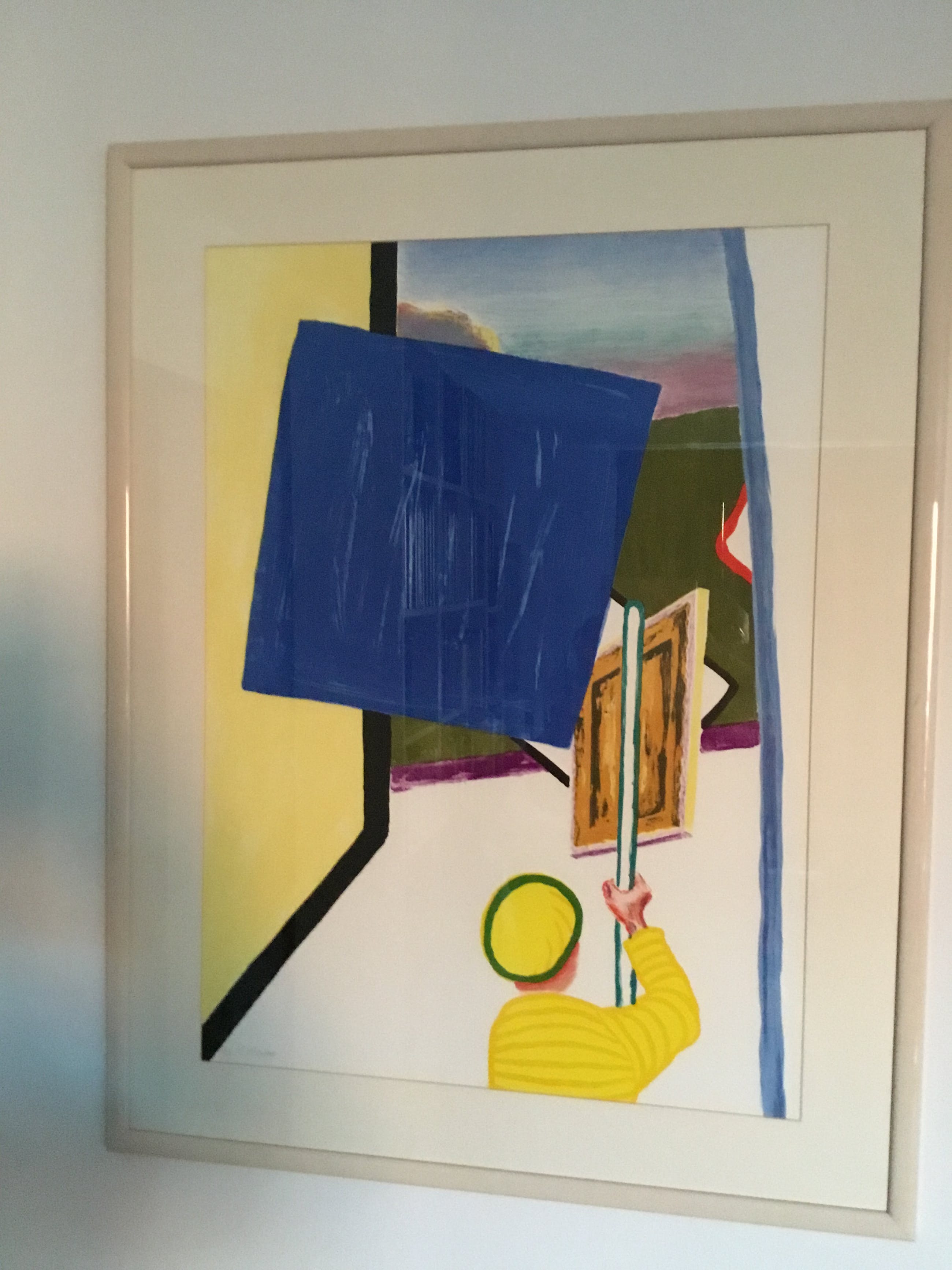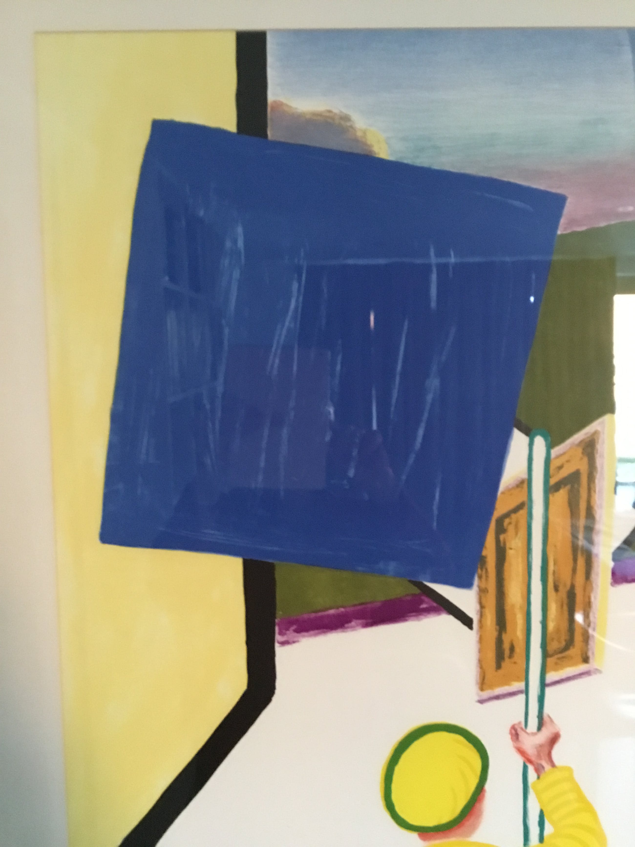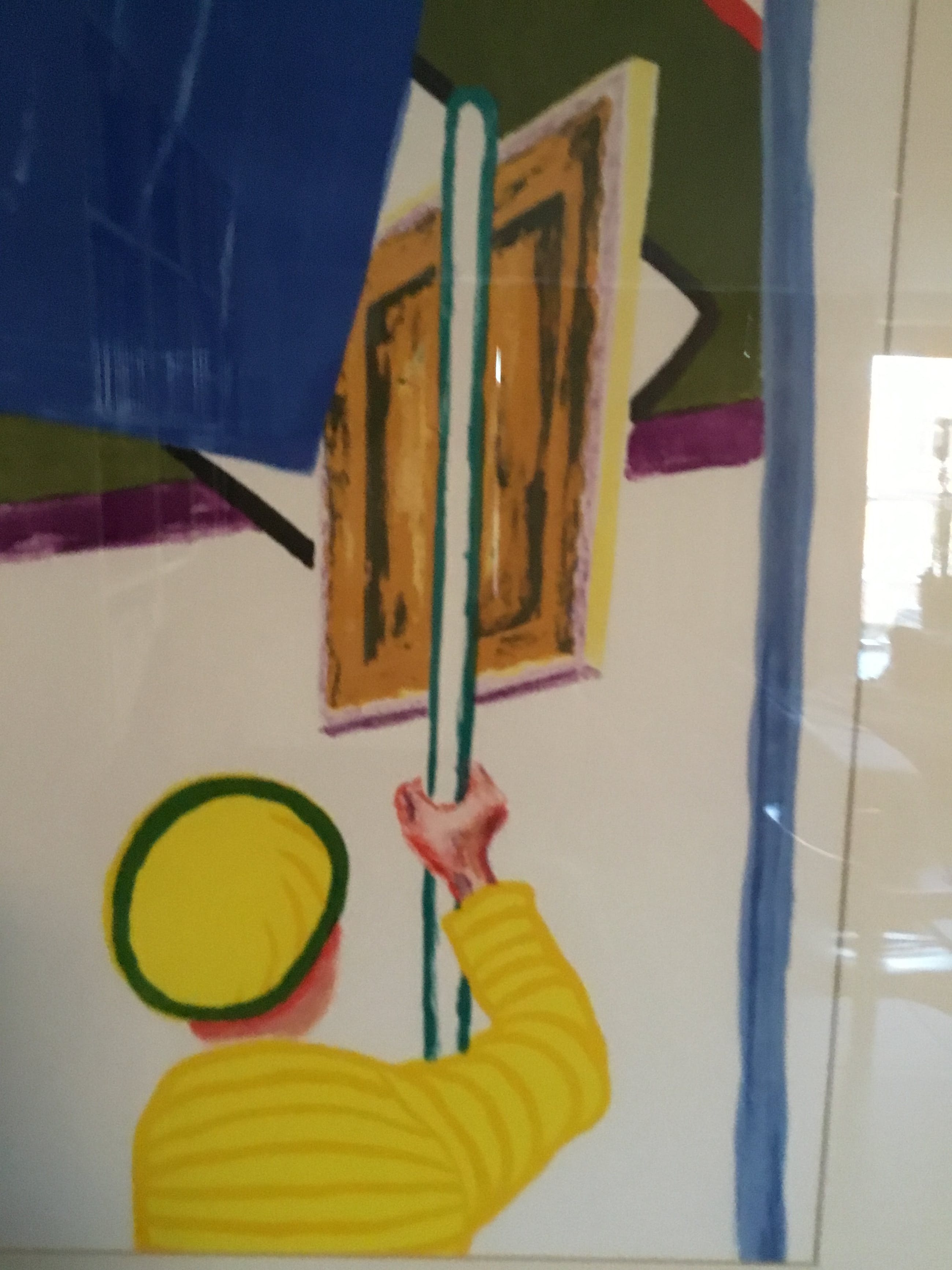 De gele man met schilderij wordt in abstracte kleuren gezet met daarnaast een muur in een harde constructieve vormgeving met een uitzicht op het park van het kasteel van Beervelde . Dit is een litho van een werk in de kelder van dat kasteel.