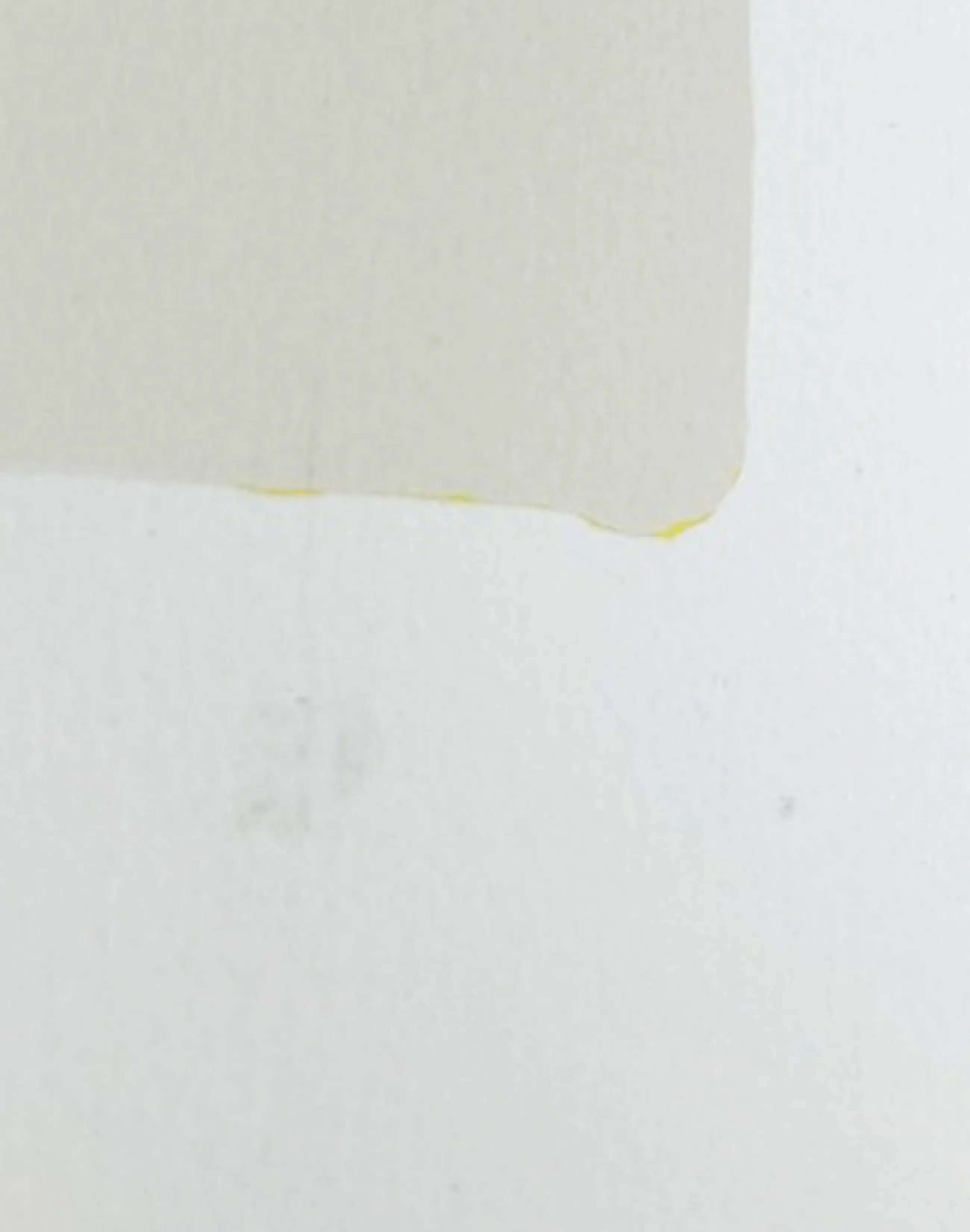 | Het werk heeft wat minimale oneffenheden. Zo is er een kleine kreukel centraal aan de onderzijde van de voorstelling zichtbaar. Daarnaast is aan de linker rand een soortgelijke kreukel in het papier te zien. Onder het witte 'venster' zit een klein vlekje. | |||||||||||