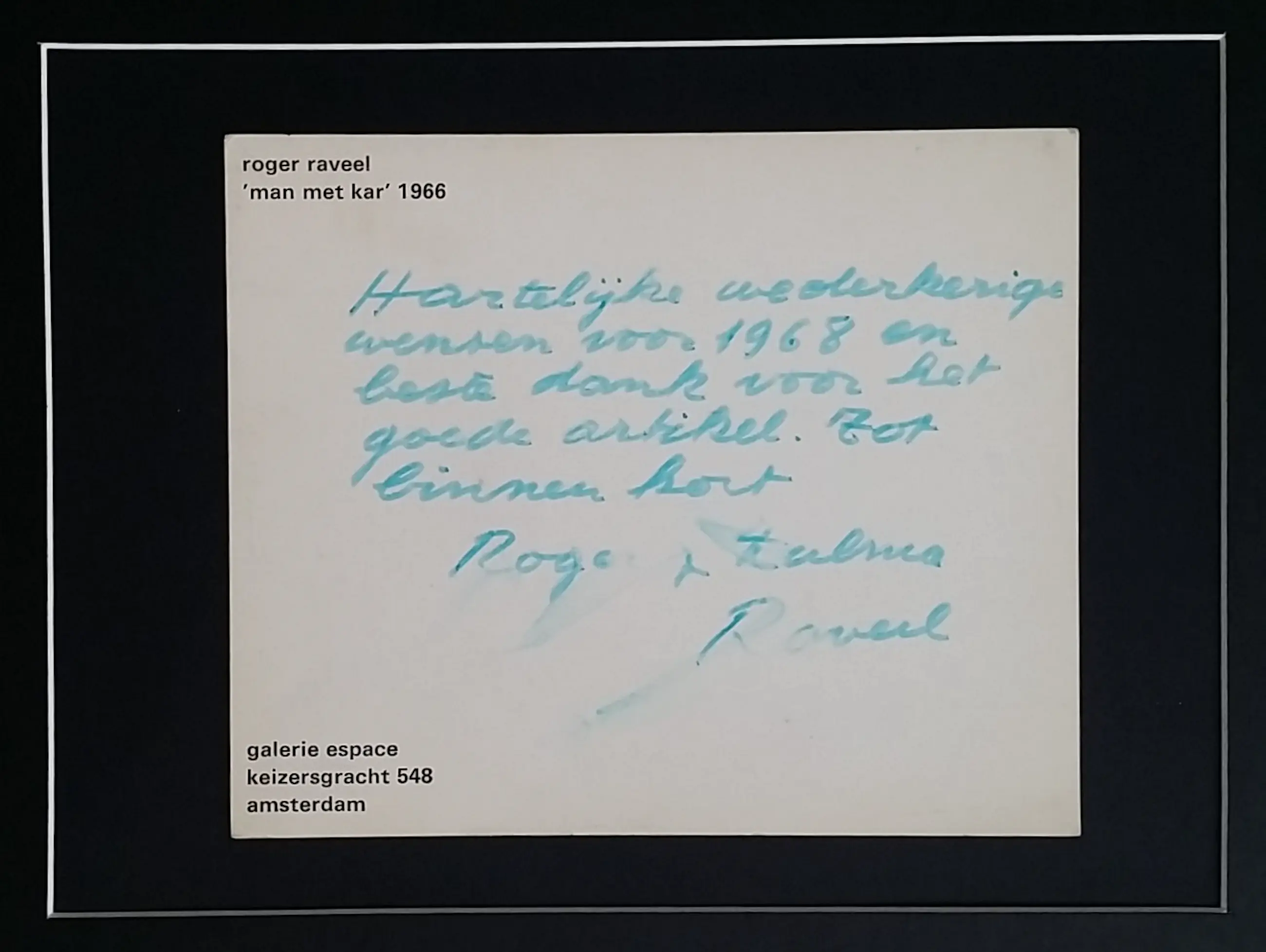 Roger Raveel Nieuwjaarskaart met voorkant kunstwerk van Roger Raveel uit 1966 - ofset druk Man met Kar uit 1966 Achterkant beschreven door Roger Raveel met de beste wensen voor het nieuwe jaar 1968