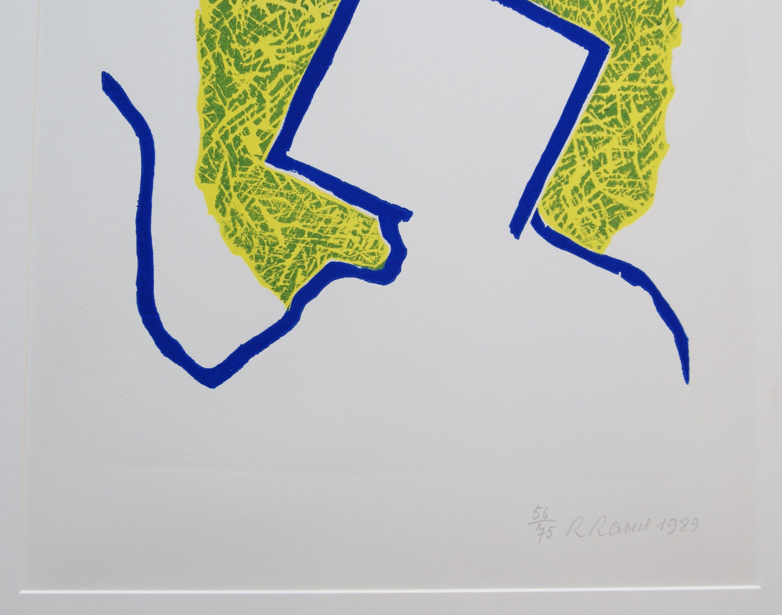 Een fraaie zeefdruk van Roger Raveel uit 1989.Het werk is gesigneerd en genummerd 56/75.De zeefdruk is bevestigd achter een passe-partout (aan de bovenzijde op twee plekjes).Afmetingen werk: 65 x 50 cm (incl. pp 71 x 56 cm). Zeefdruk en pp zijn in goede conditie.