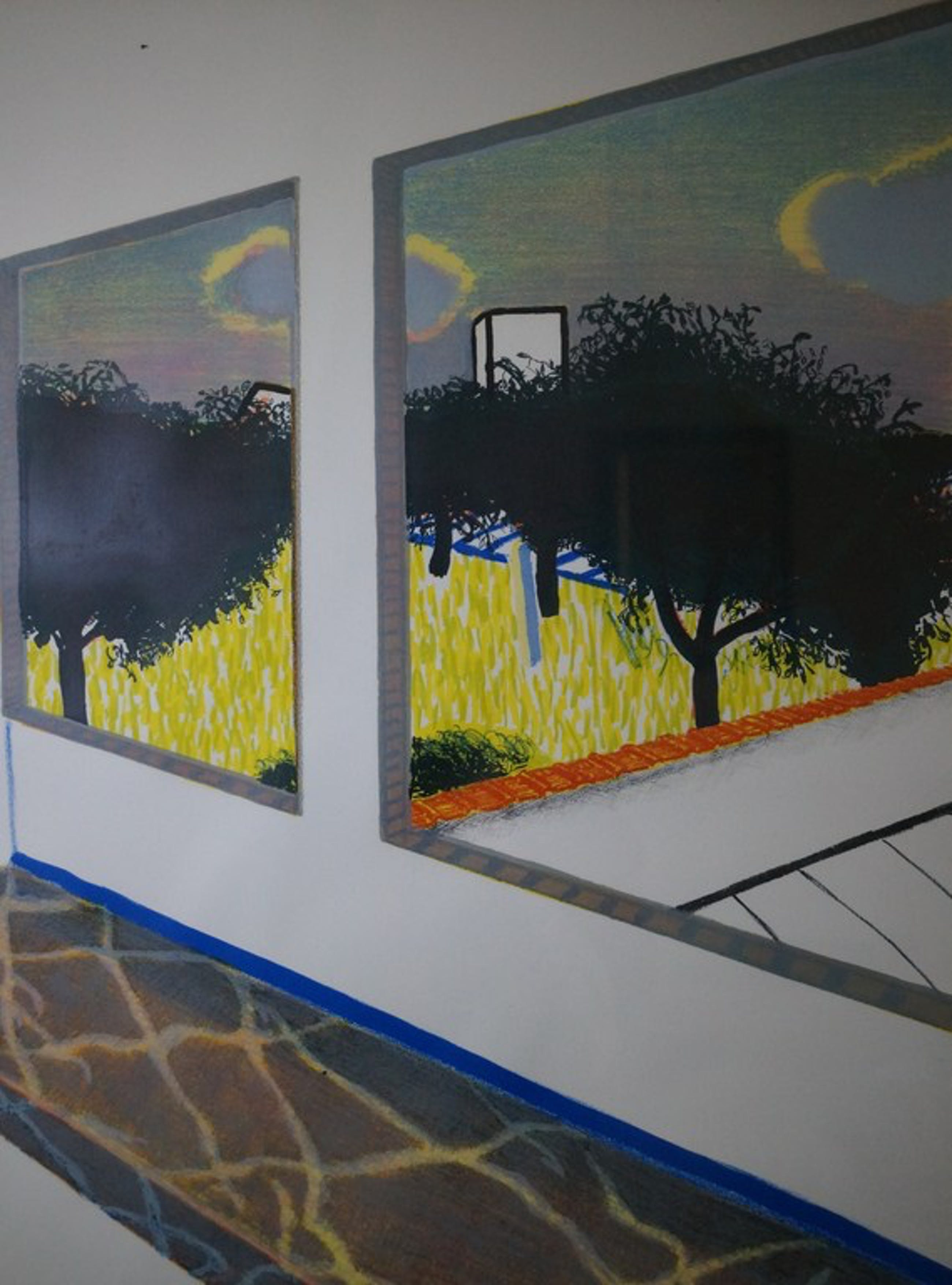 Mooie lithografie (steendruk) van Roger Raveel (!921-2013), voorstellende een doorkijk door twee vensters met marmeren vensterbank. Mooi ingelijst in een Barth lijst en in goede staat.