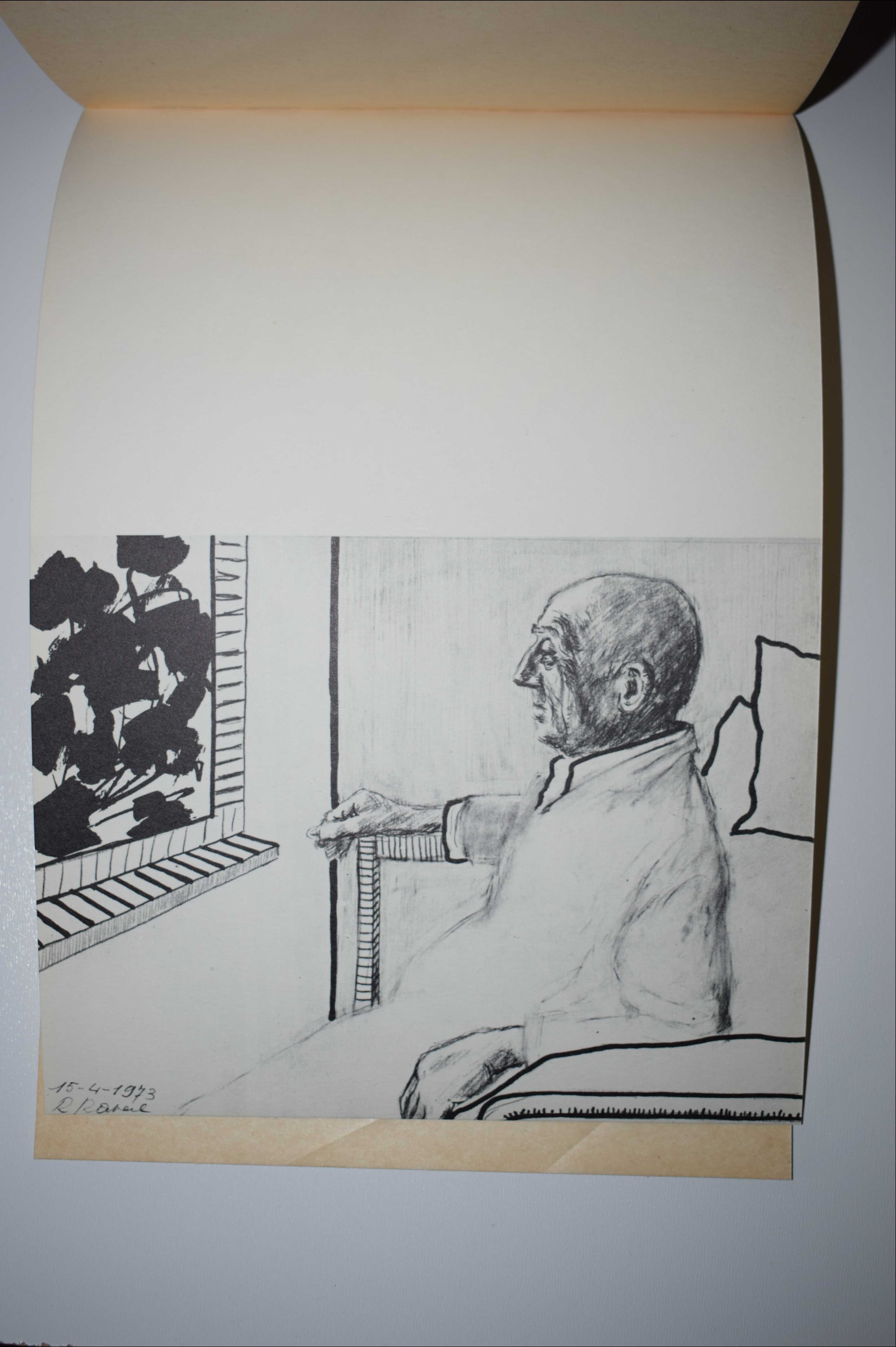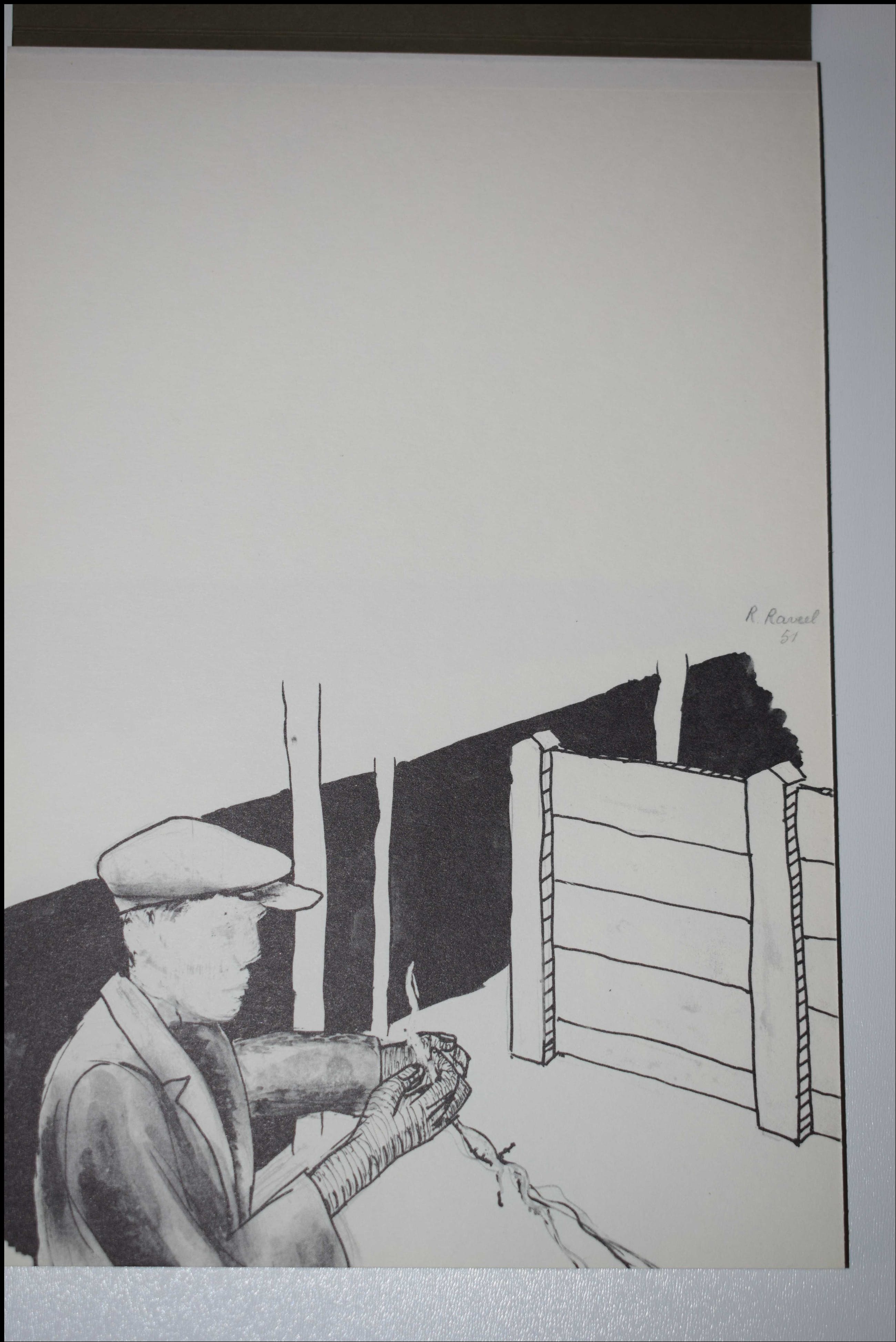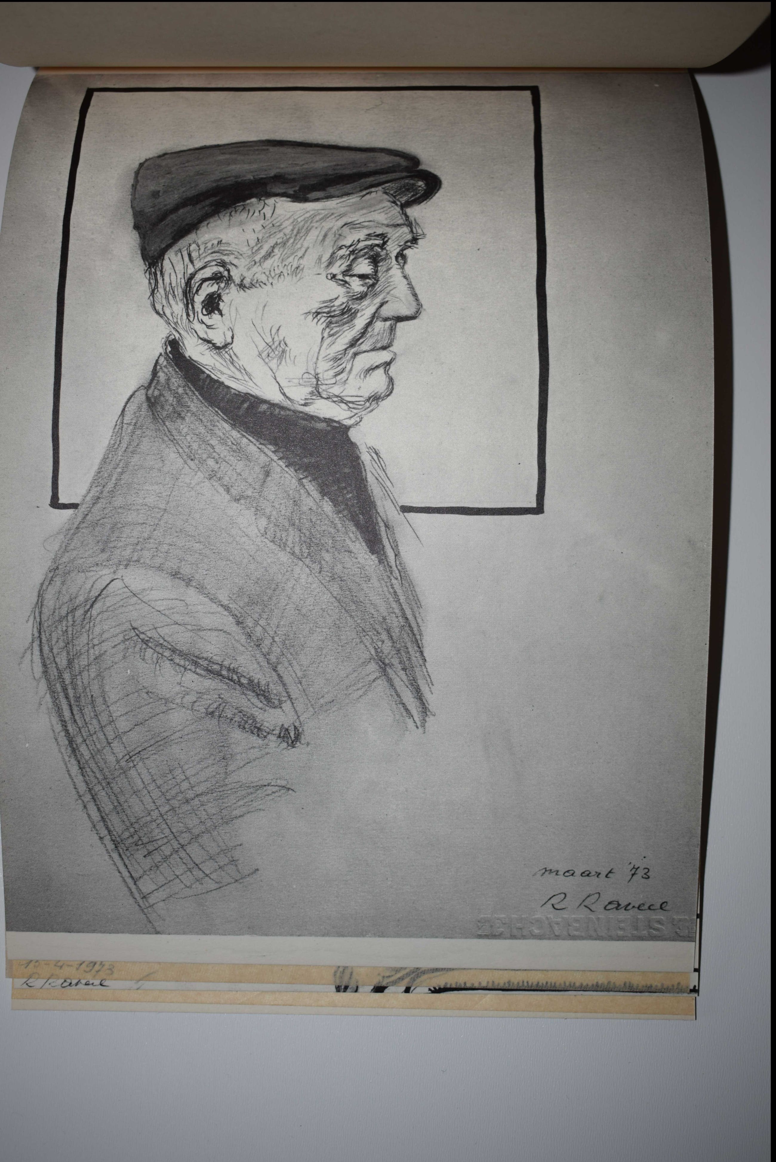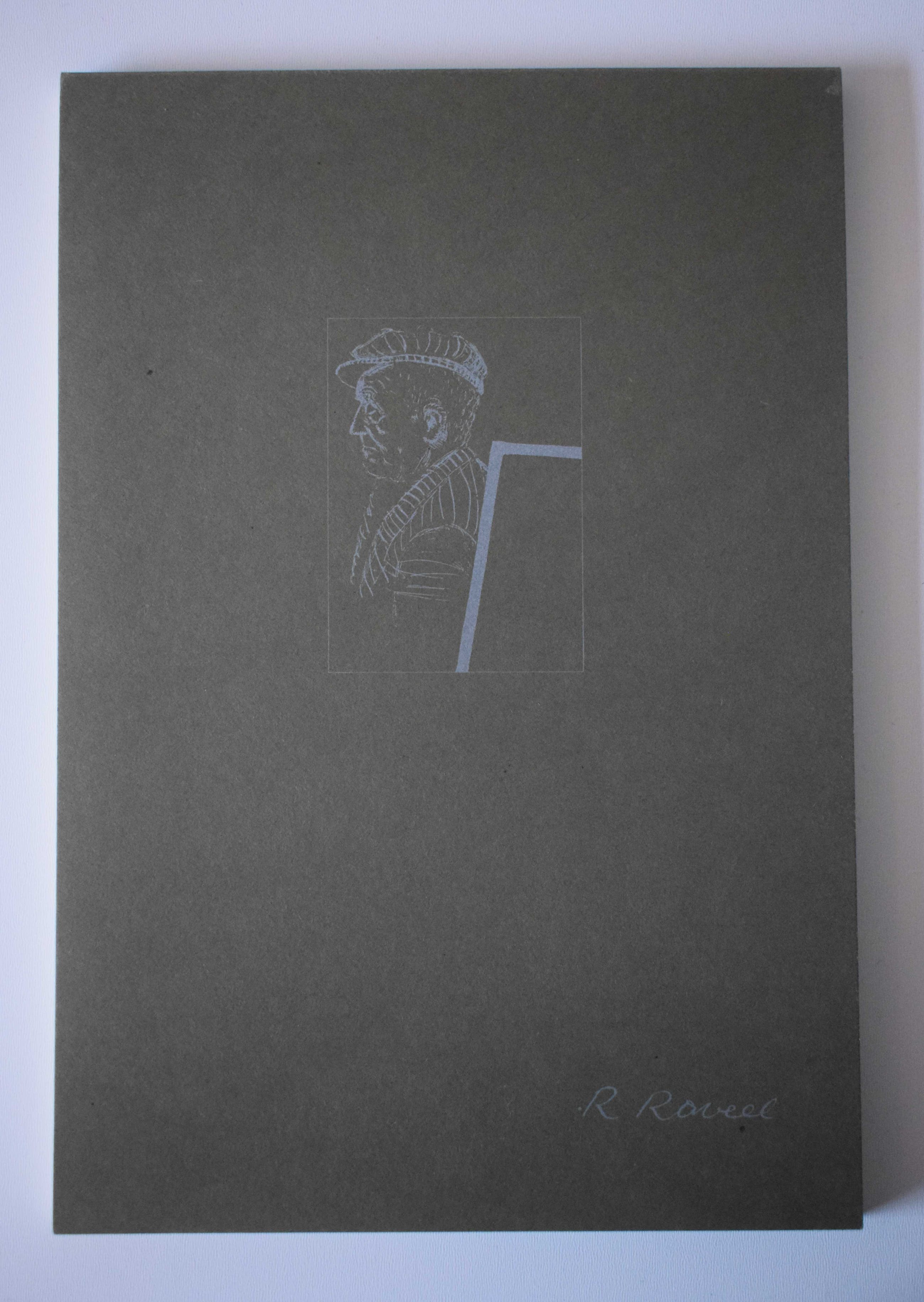Een schetsboek over de Vader van Raveel, met 2 litho's genummerd en handgesigneerd met Roger Raveel. De andere 15 platen zijn offsetdrukken, allen in de plaat gesigneerd. Bij de foto's zie je af en toe een stuk donkerbruin. Dit is het schutblad dat bij elke pagina voor de offsetdruk of de litho zat.