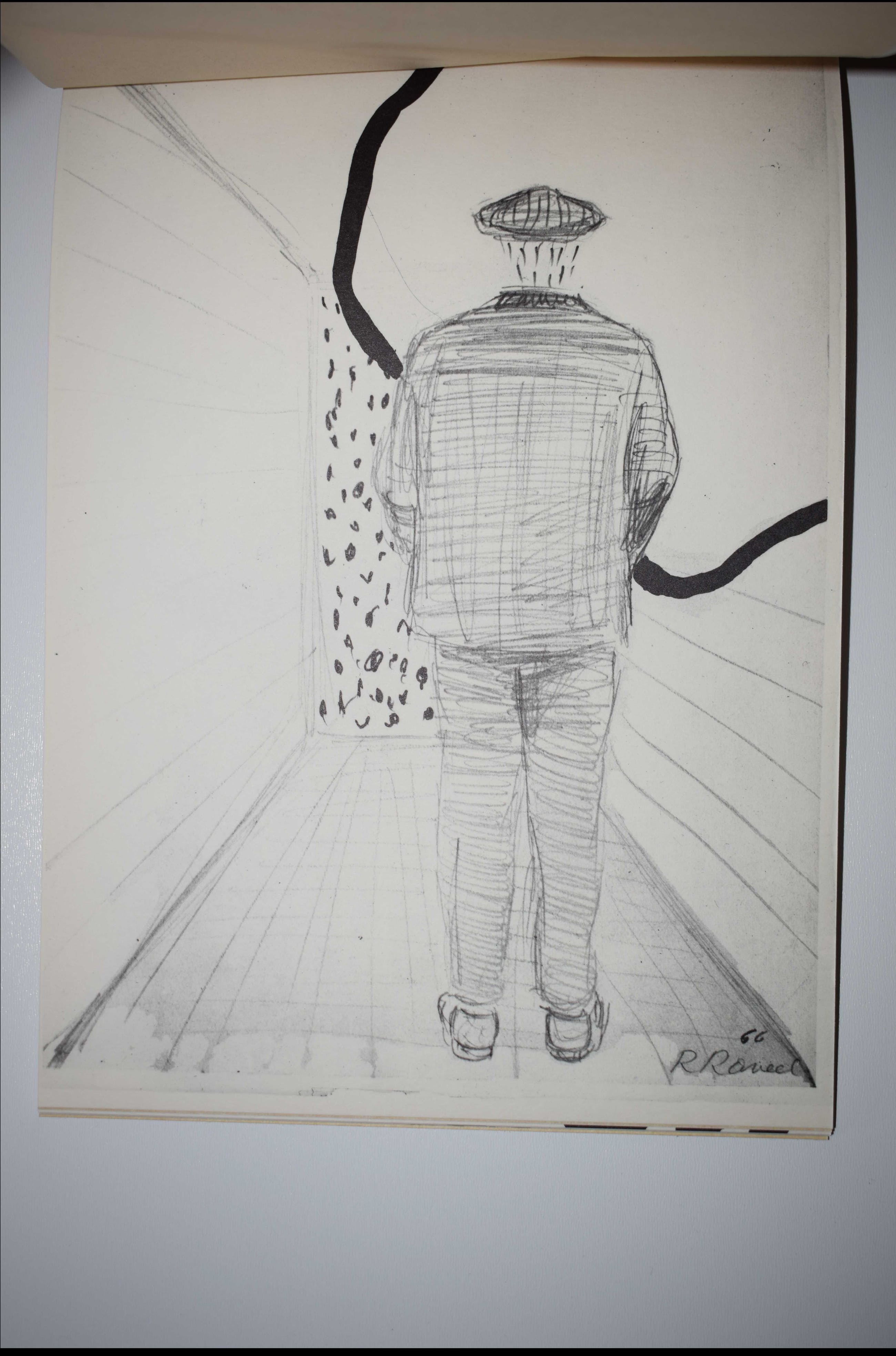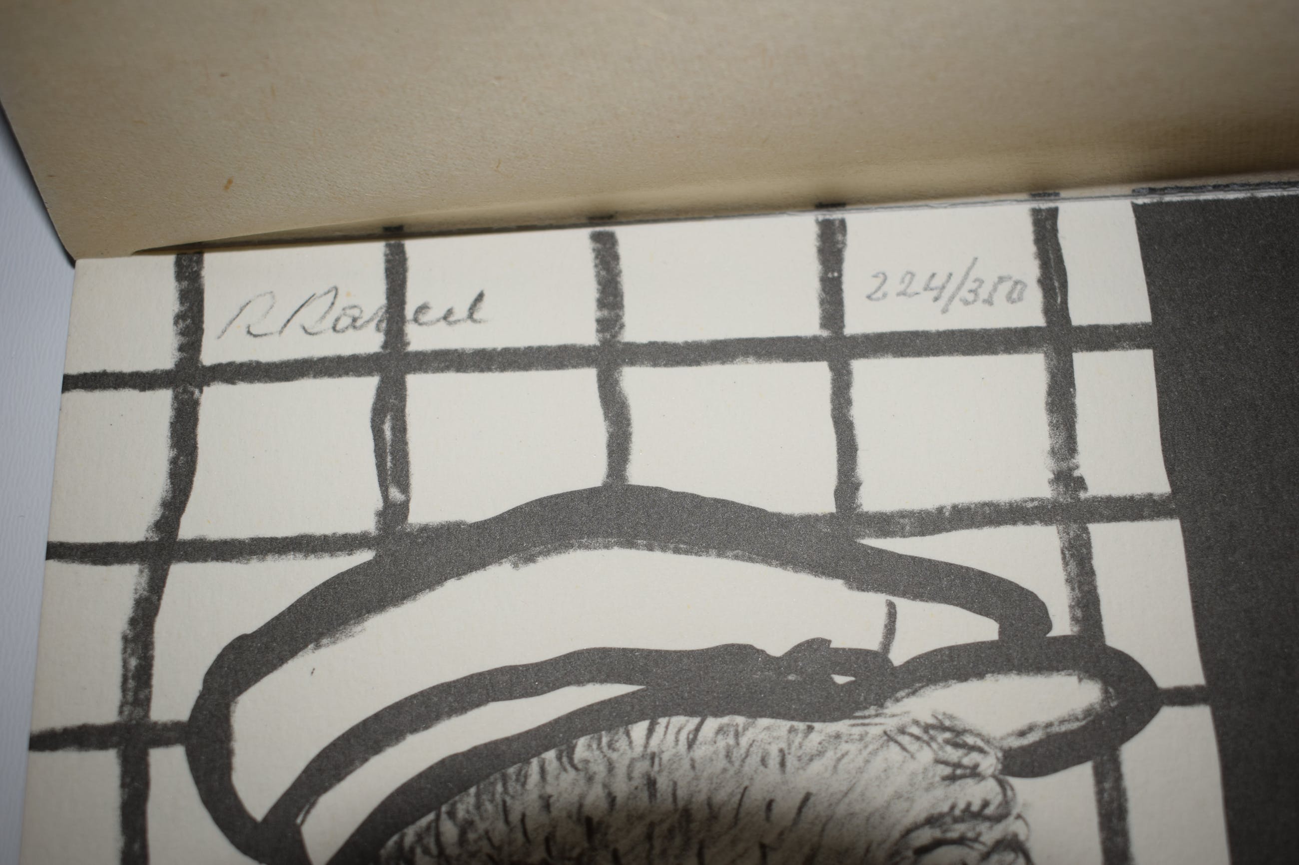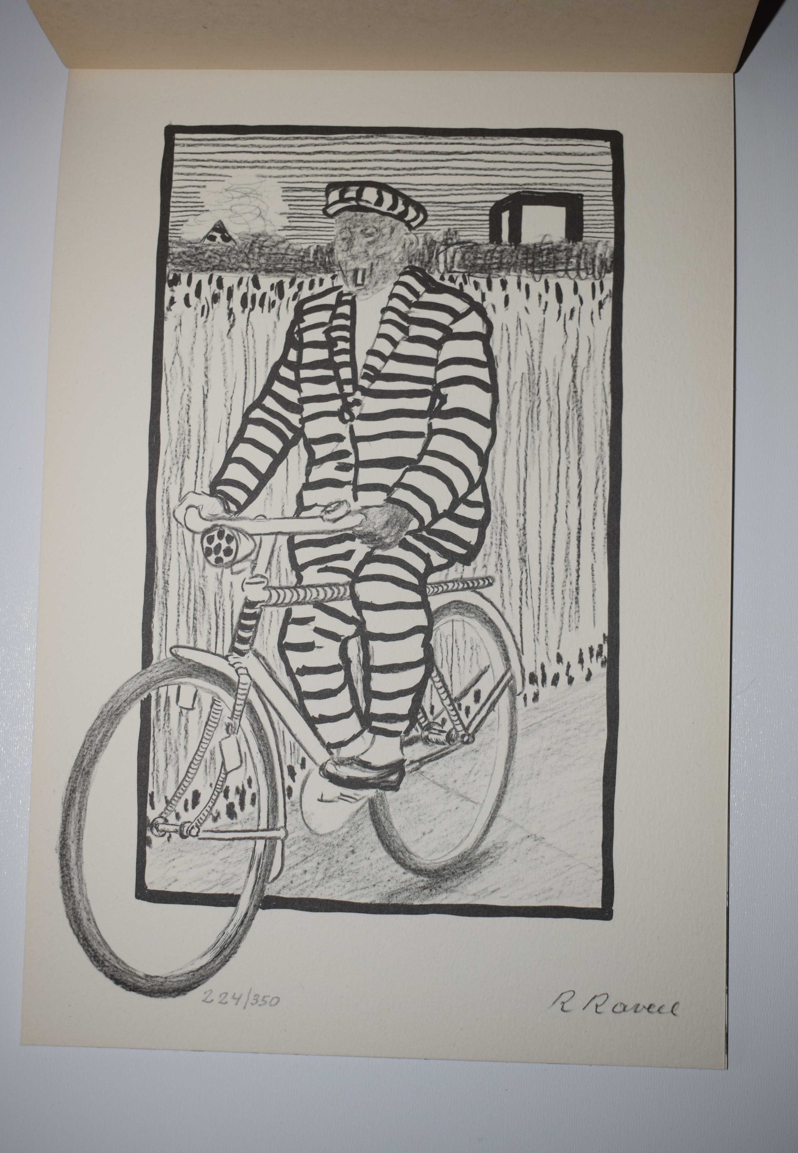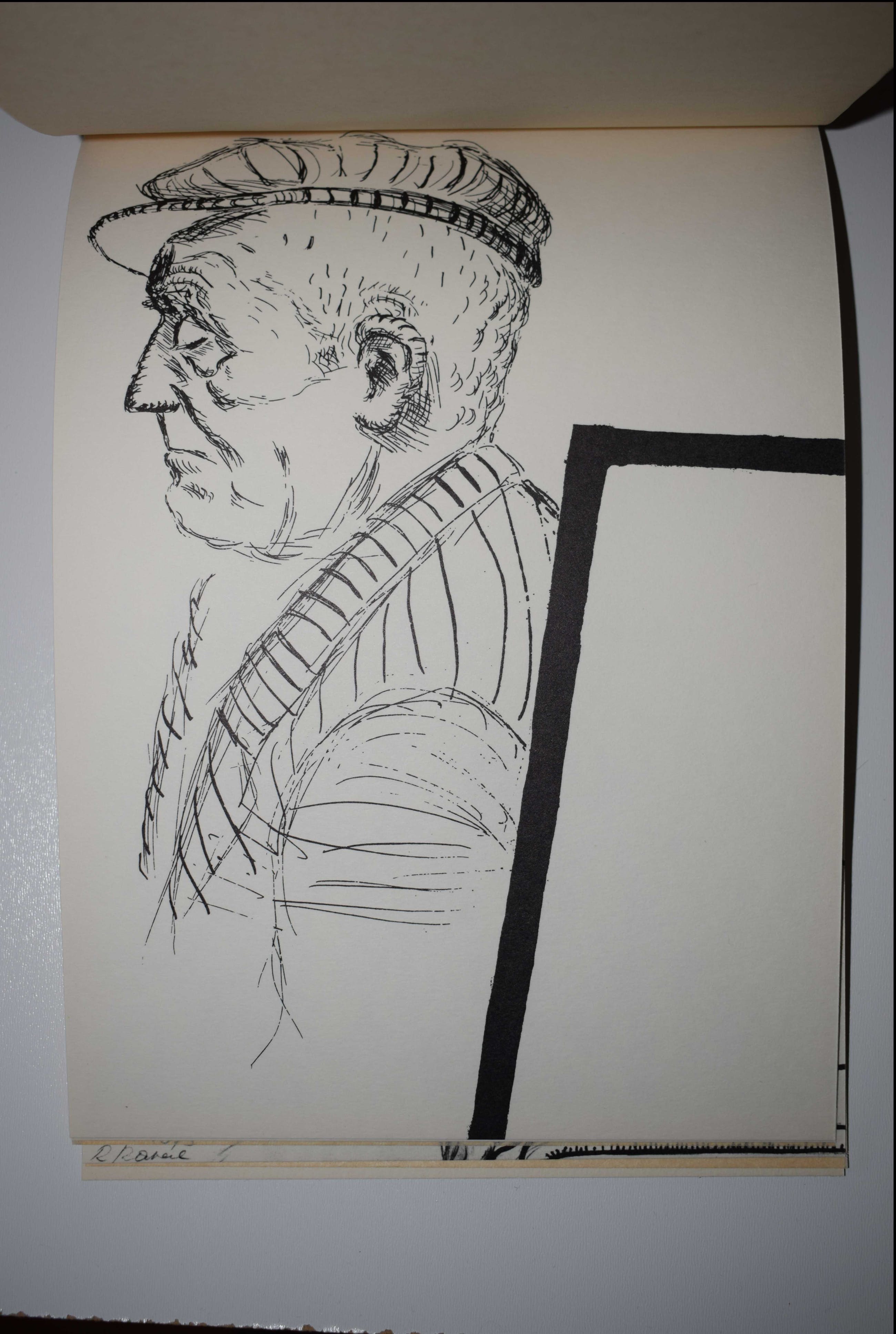Een schetsboek over de Vader van Raveel, met 2 litho's genummerd en handgesigneerd met Roger Raveel. De andere 15 platen zijn offsetdrukken, allen in de plaat gesigneerd. Bij de foto's zie je af en toe een stuk donkerbruin. Dit is het schutblad dat bij elke pagina voor de offsetdruk of de litho zat.