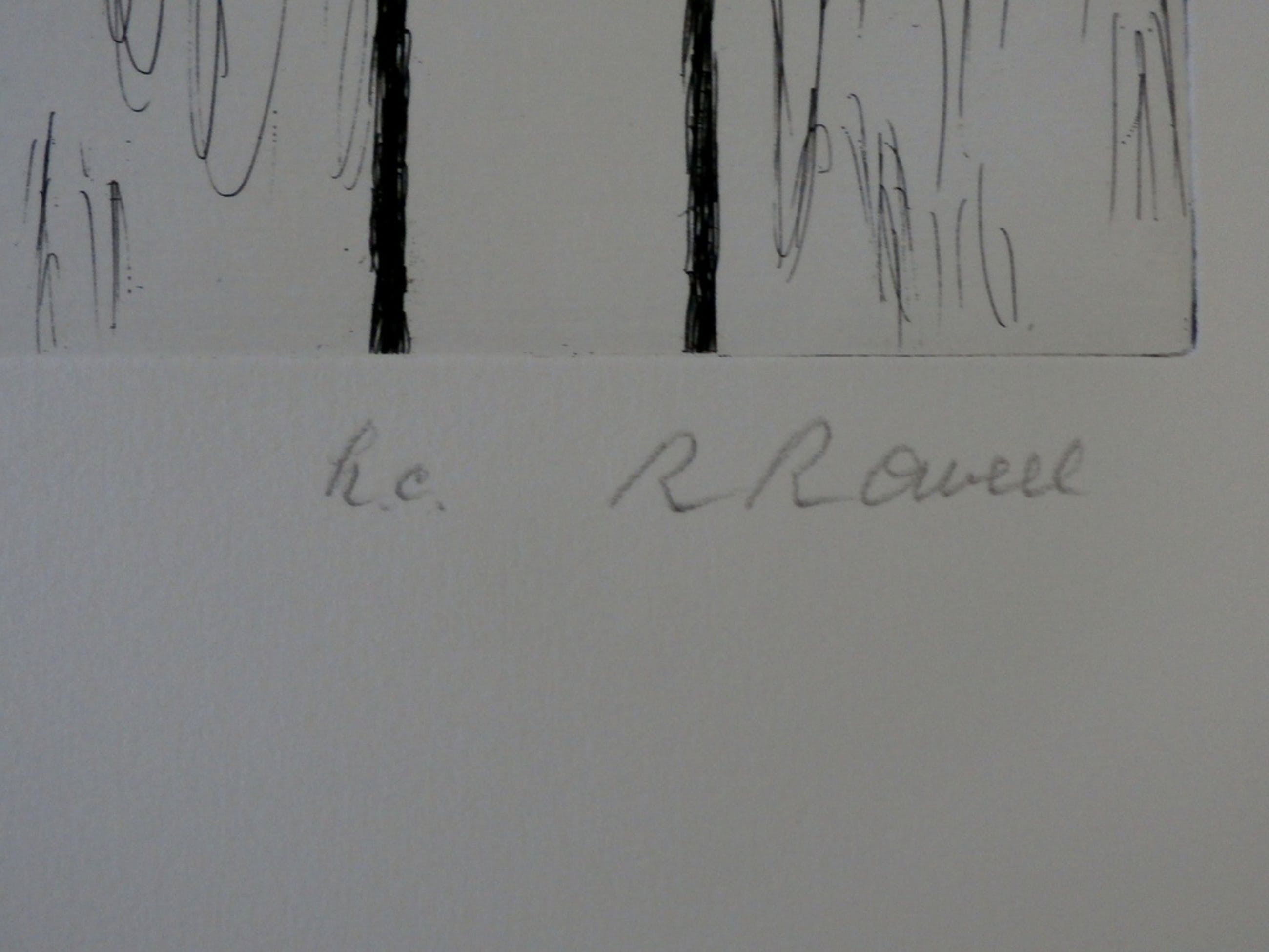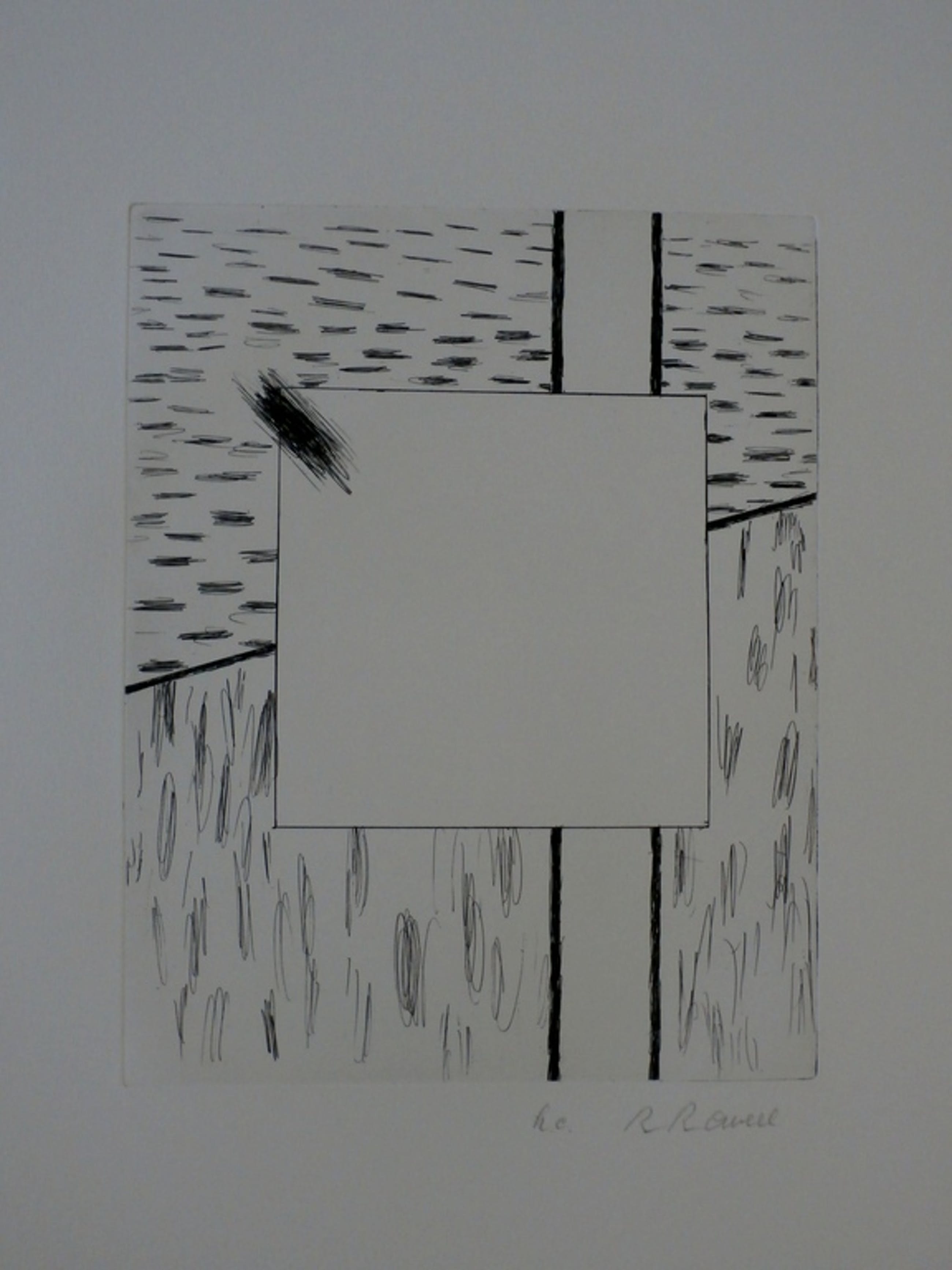 Ets van Roger Raveel : Natuur en een gedachte in de leegte van een vierkant. Afmetingen afbeelding: H29,7xb23,5 cm.. Nummer: H.C. Rechtsonder gesigneerd met potlood door de kunstenaar. Conditie: in goede staat.