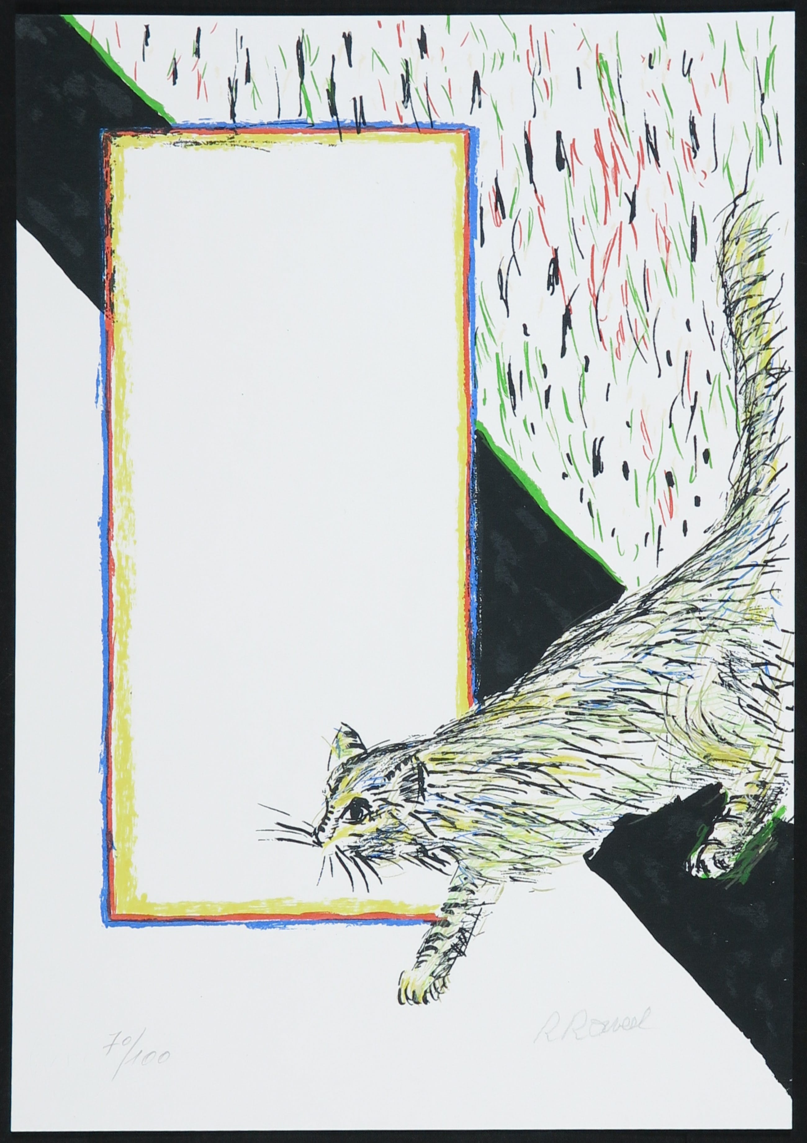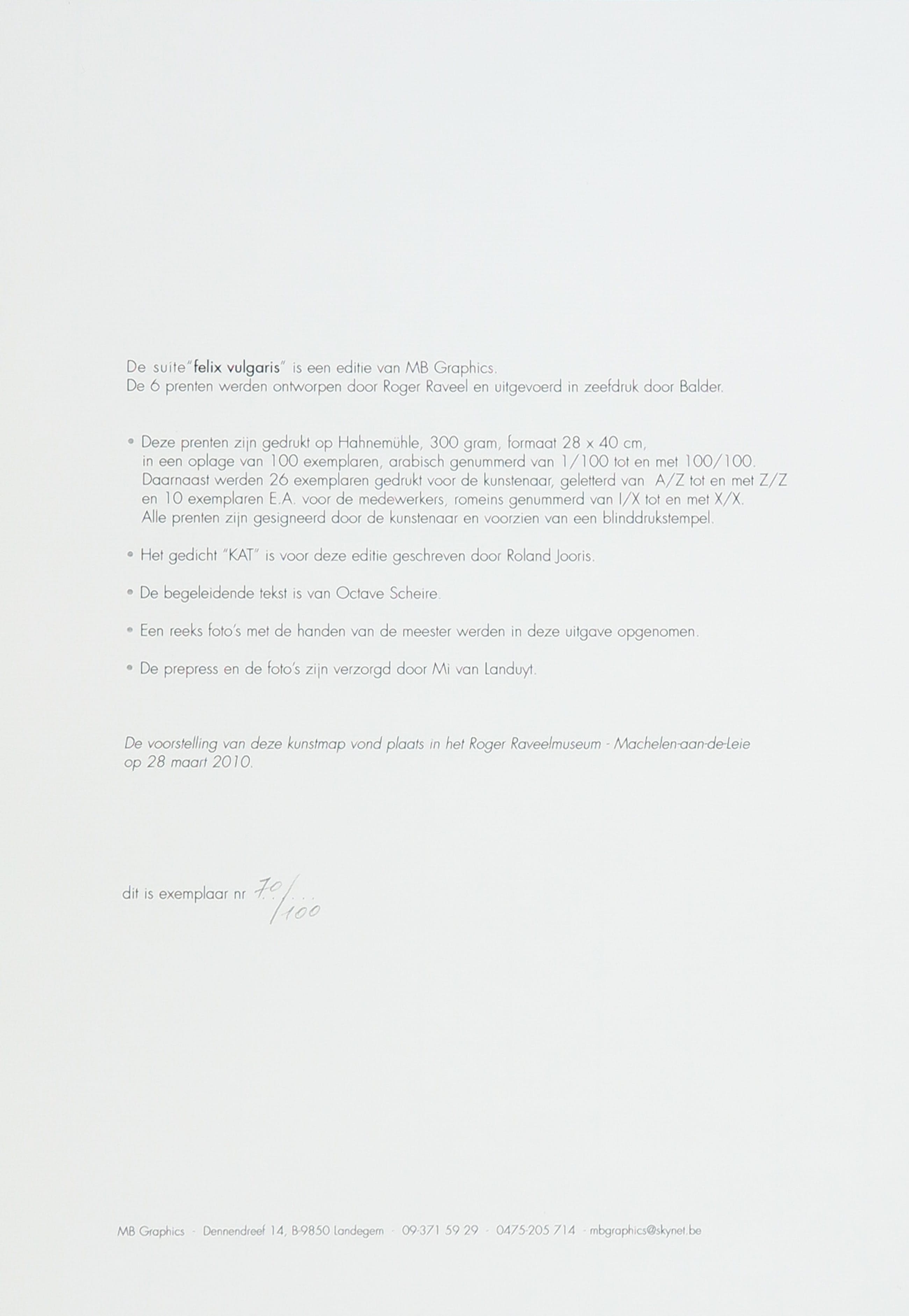 Bijgaand een titelblad, een begeleidende tekst van Octave Scheire, een blad met foto's van de totstandkoming van een van de zeefdrukken, het gedicht KAT door Roland Jooris en een colofon met nadere informatie over de uitgave.